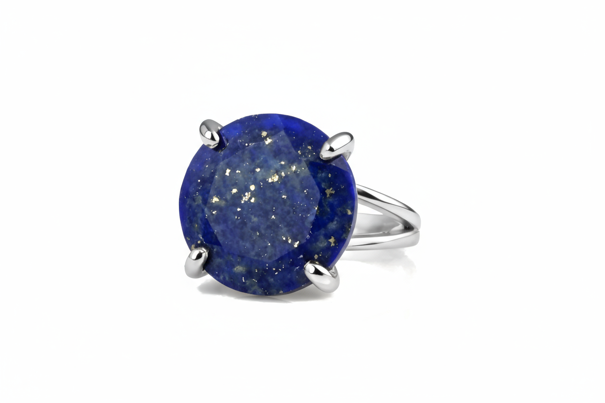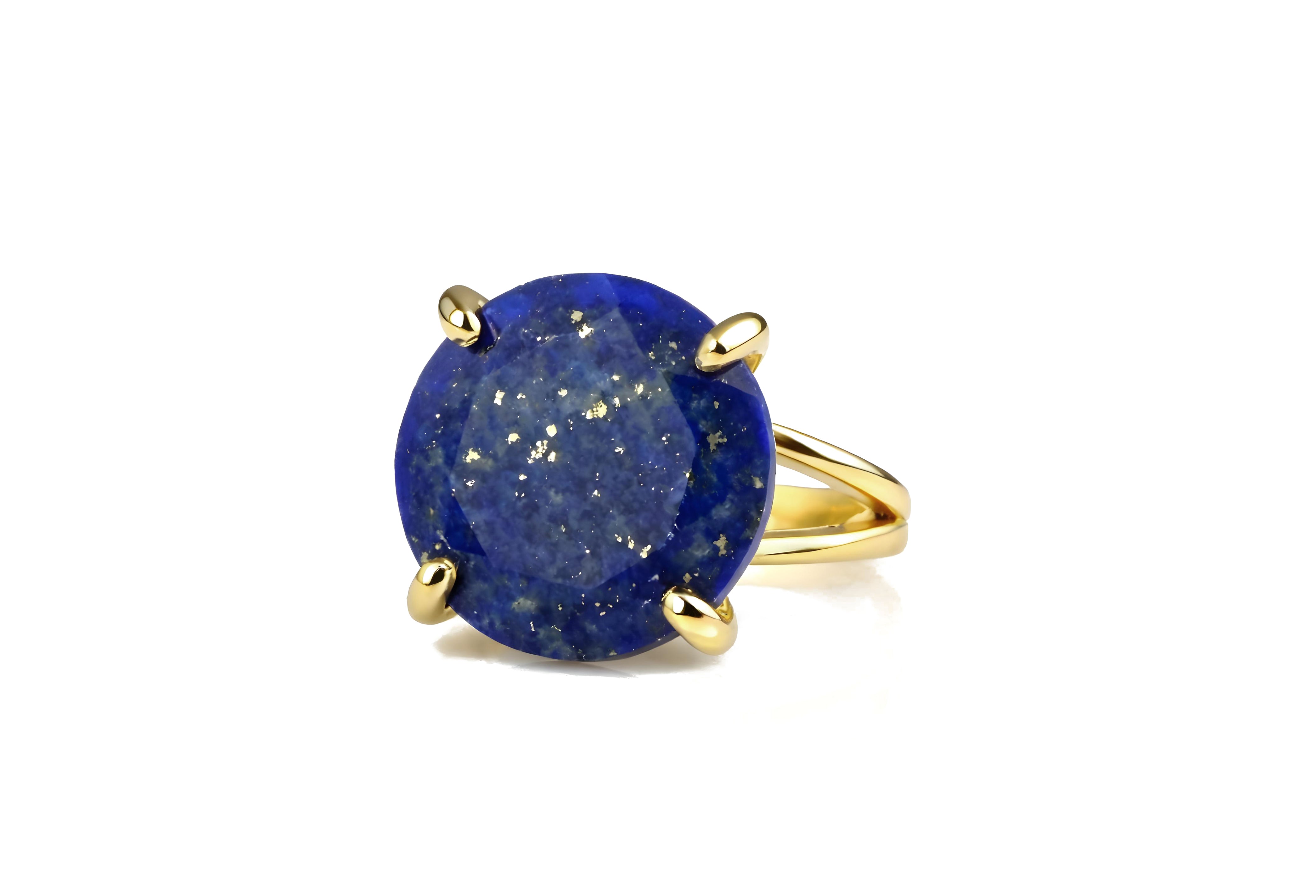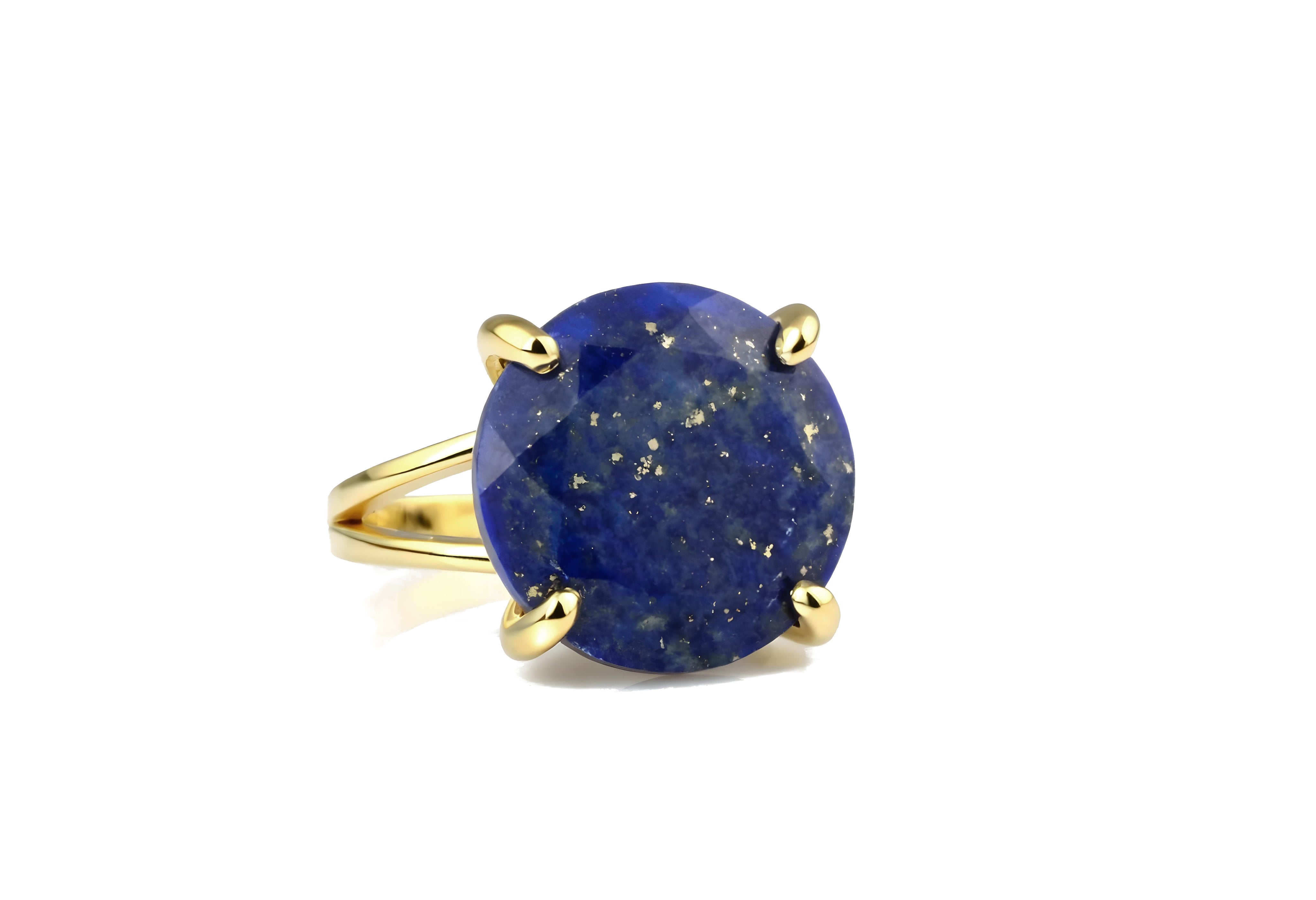 This handcrafted gold ring features a genuine lapis lazuli gemstone with golden flecks that shimmer beneath the surface. The round faceted cut enhances the natural depth of the stone, while the gold setting adds warmth and contrast to its rich blue hue. Each ring is made to order with customizable metal and sizing options, creating a truly personal piece.