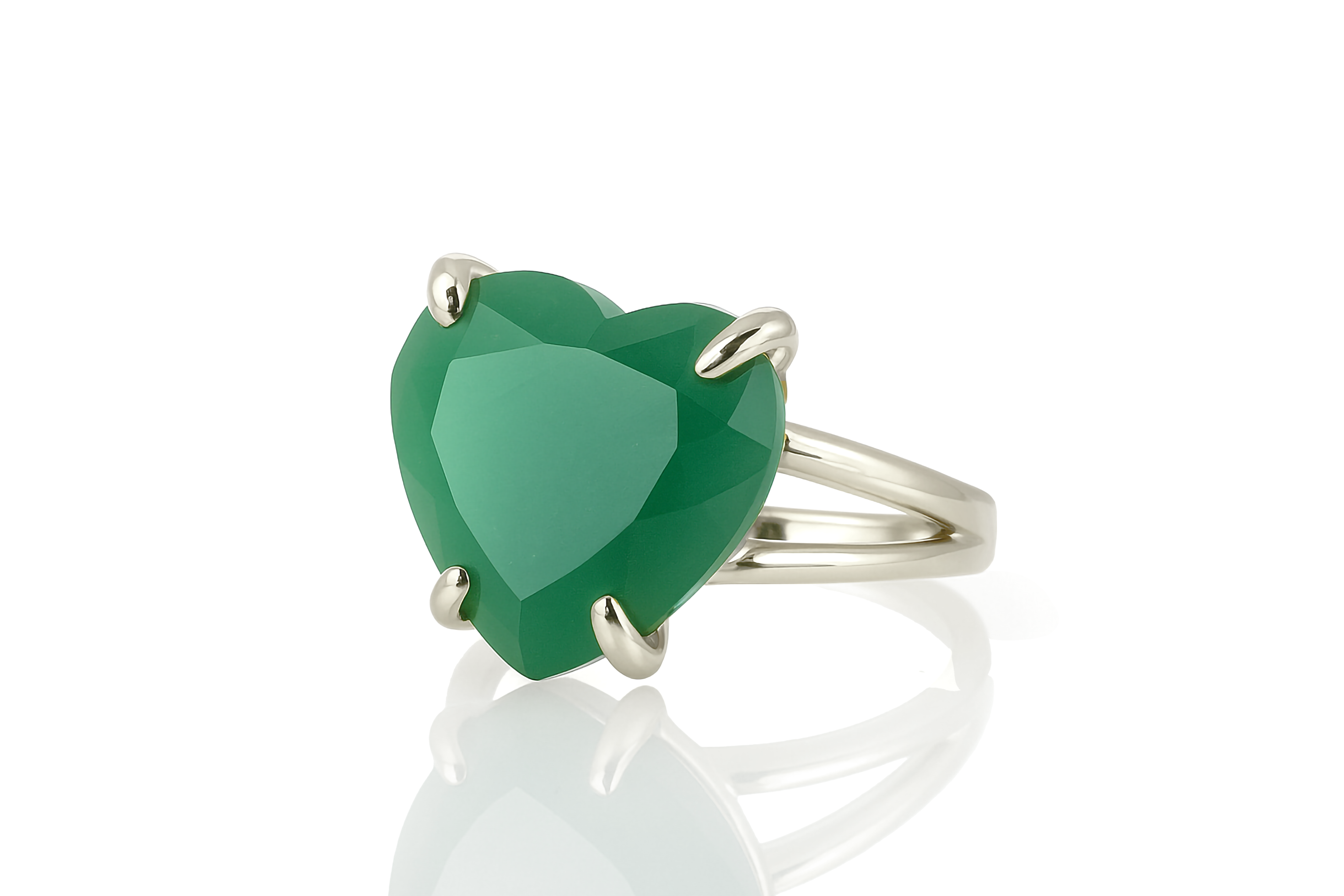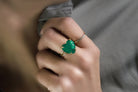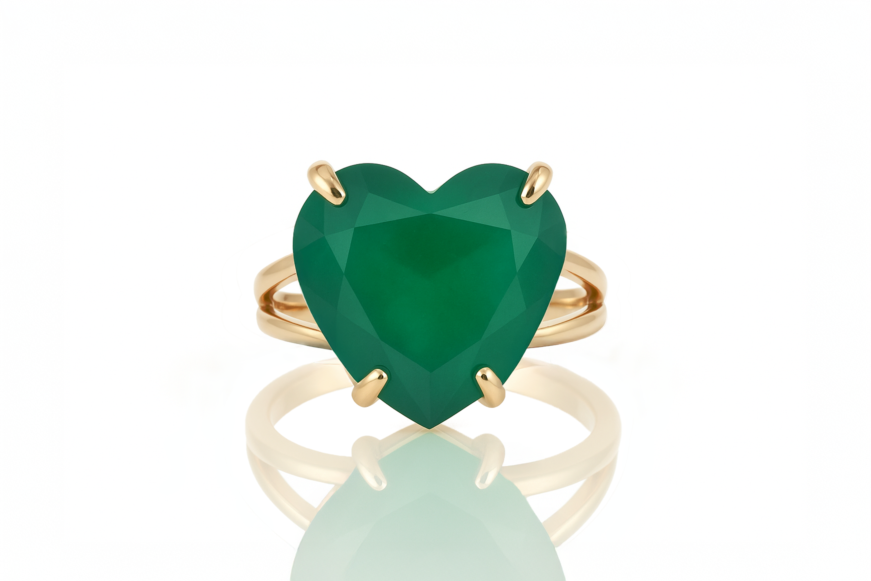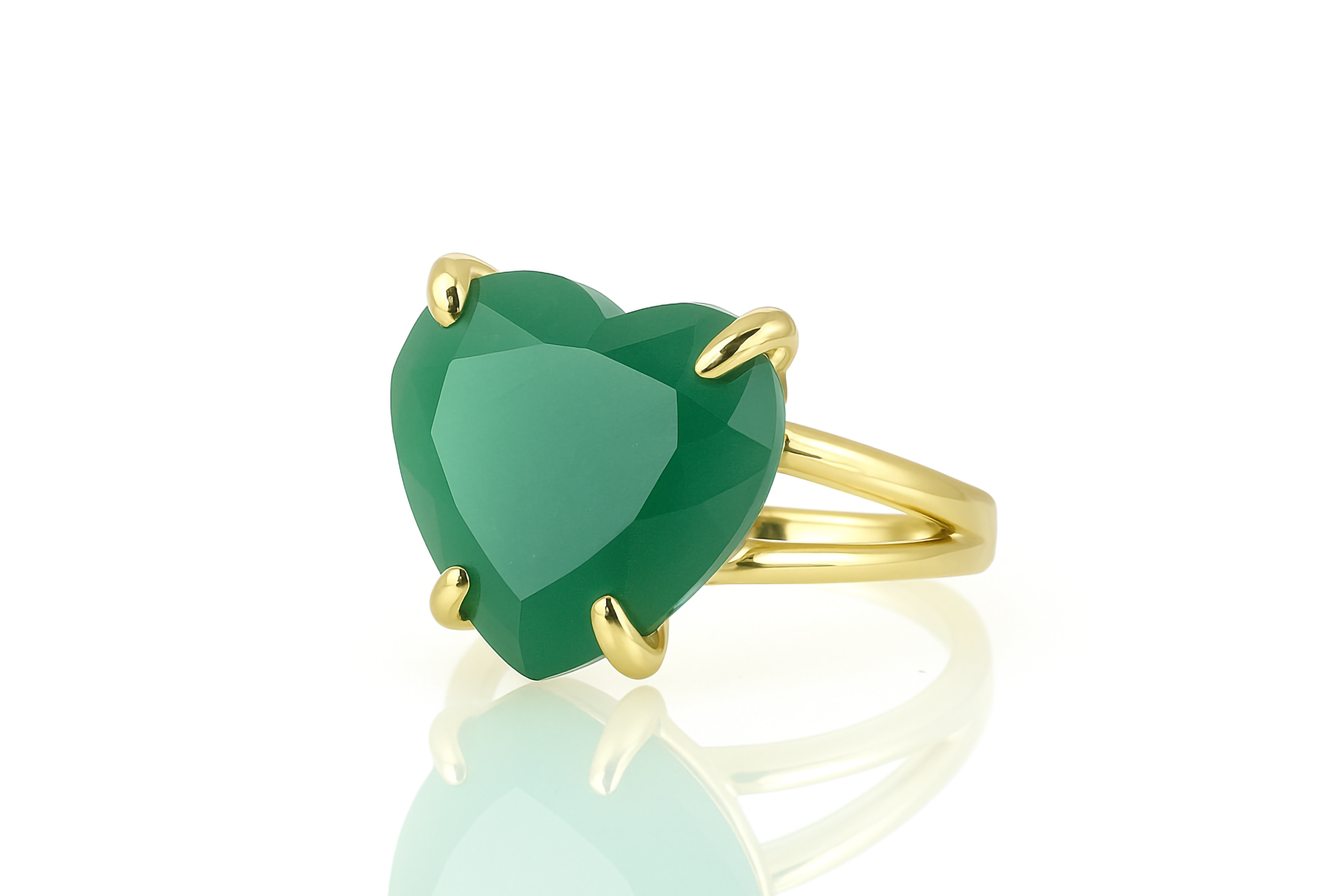This bold statement ring features a faceted heart-shaped green onyx gemstone set in a secure four-prong setting on a 14k gold filled double band. The deep green hue of the stone creates a powerful contrast against the warm gold, offering a confident, modern design.