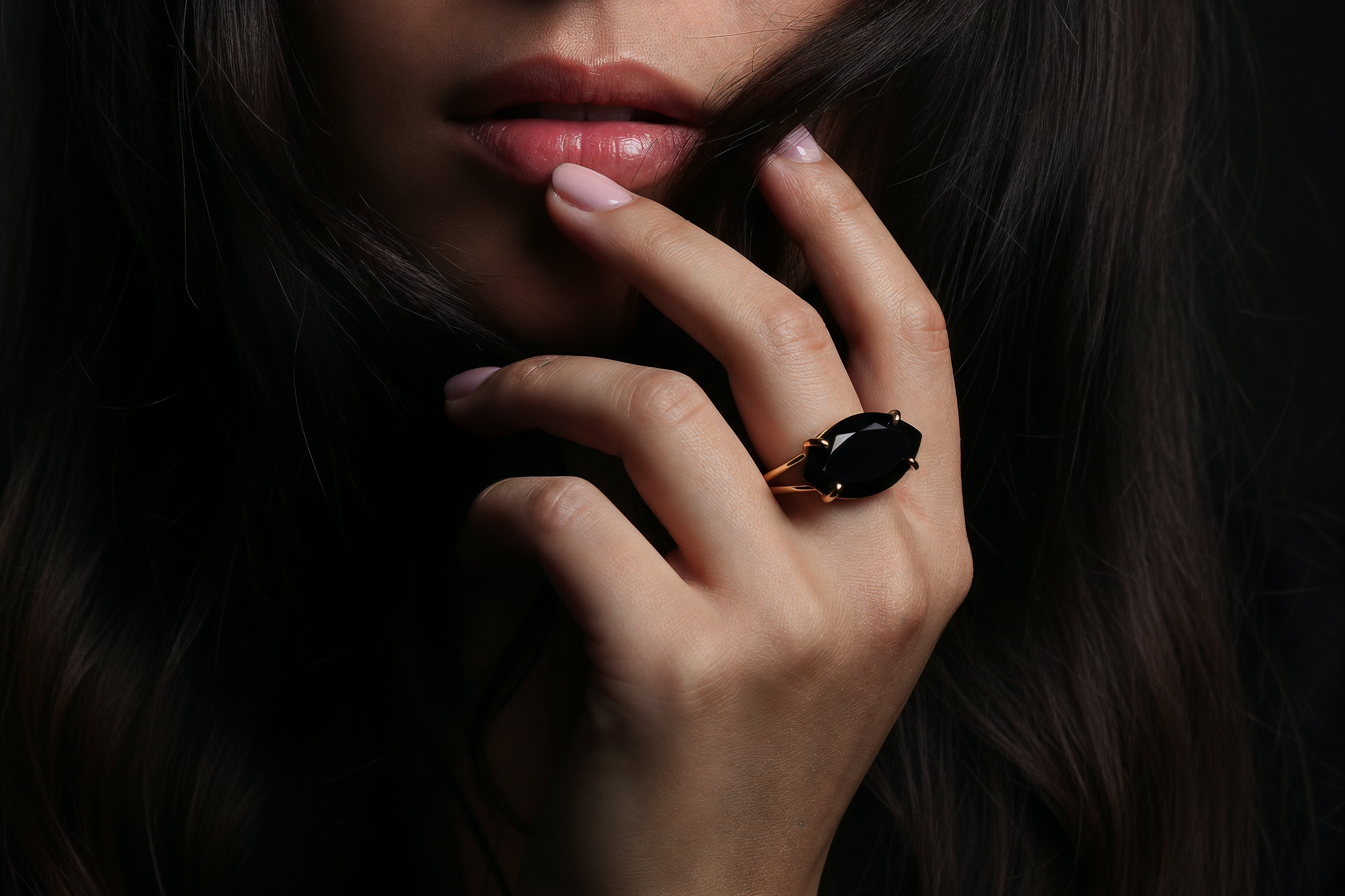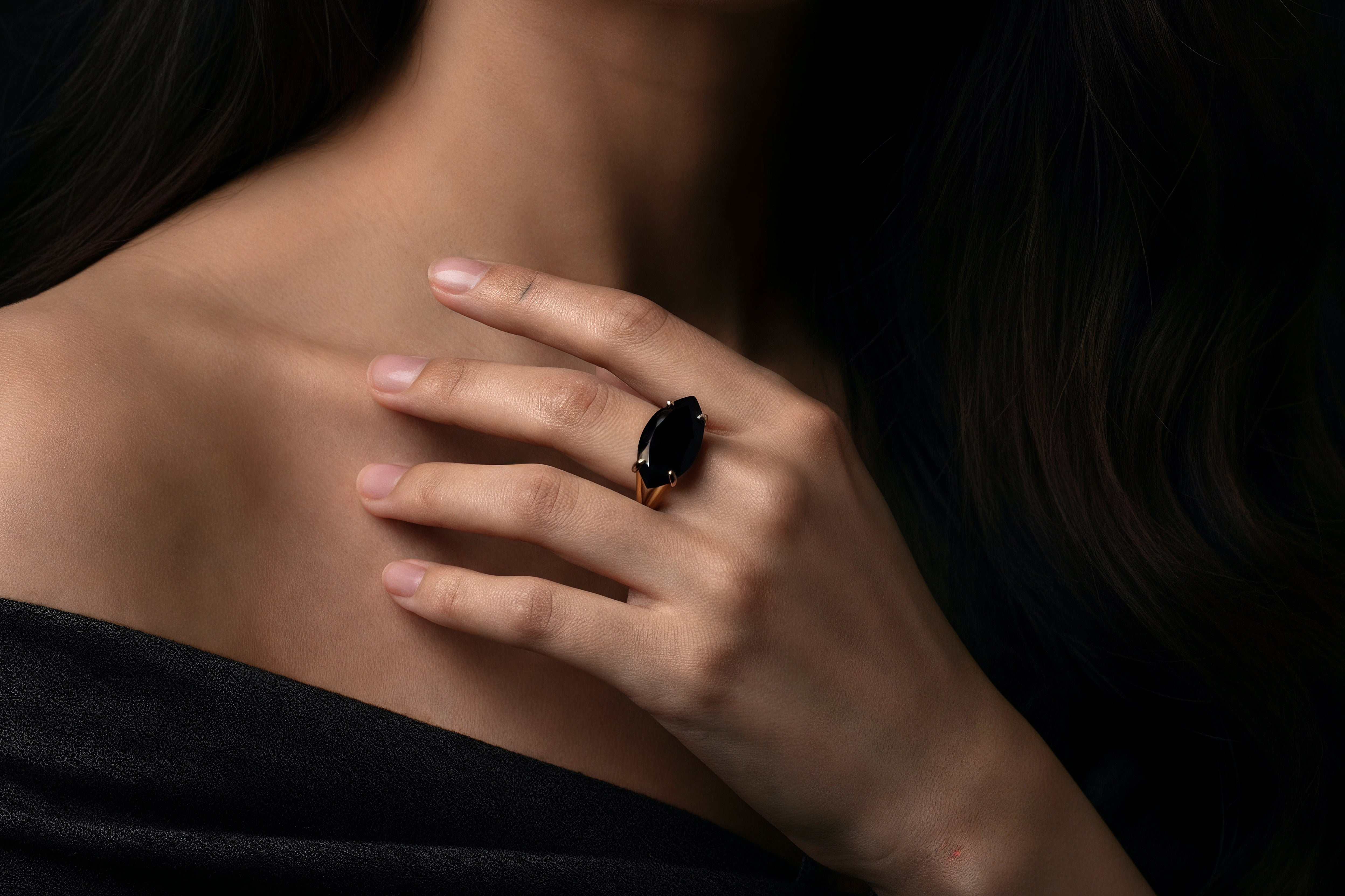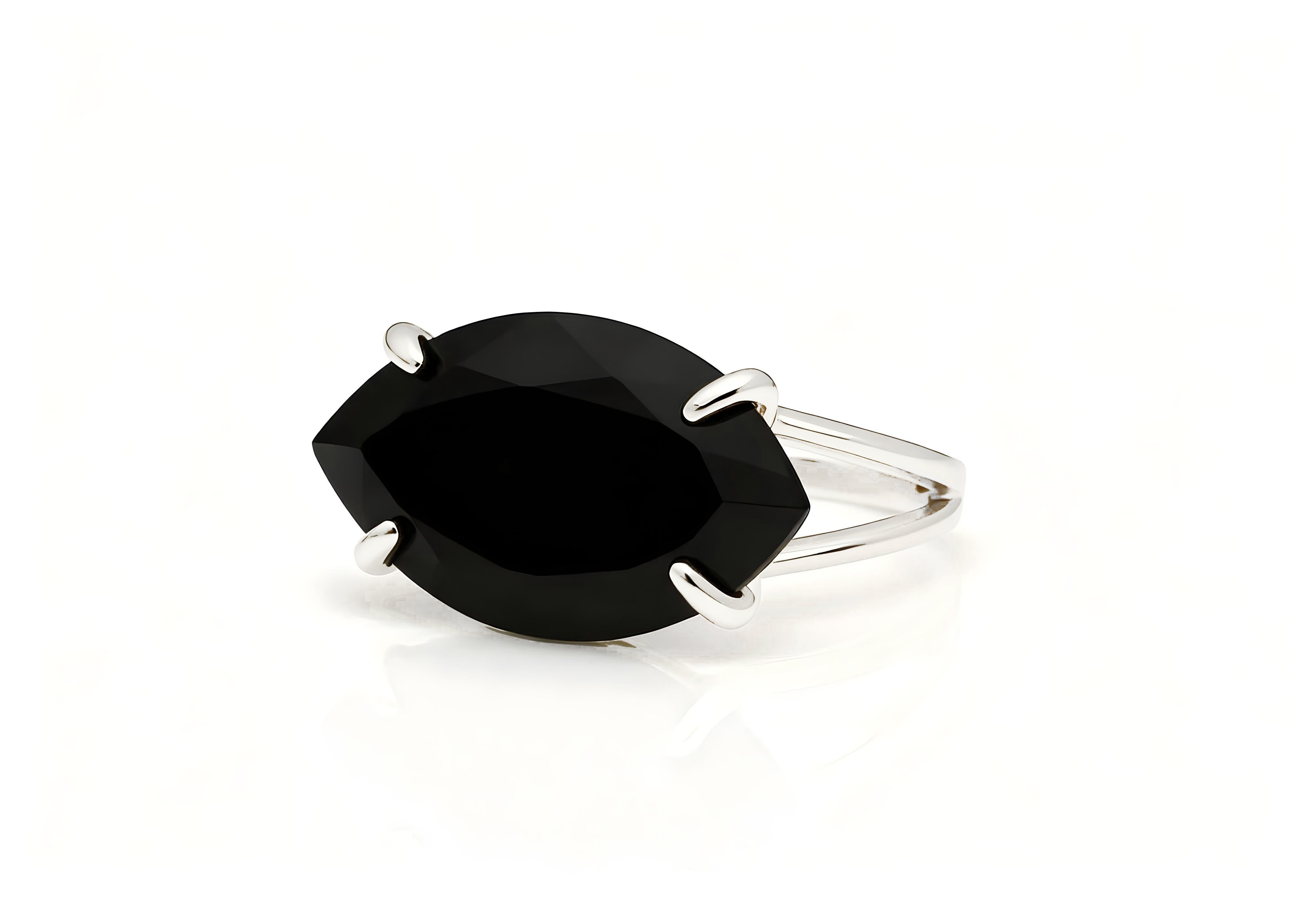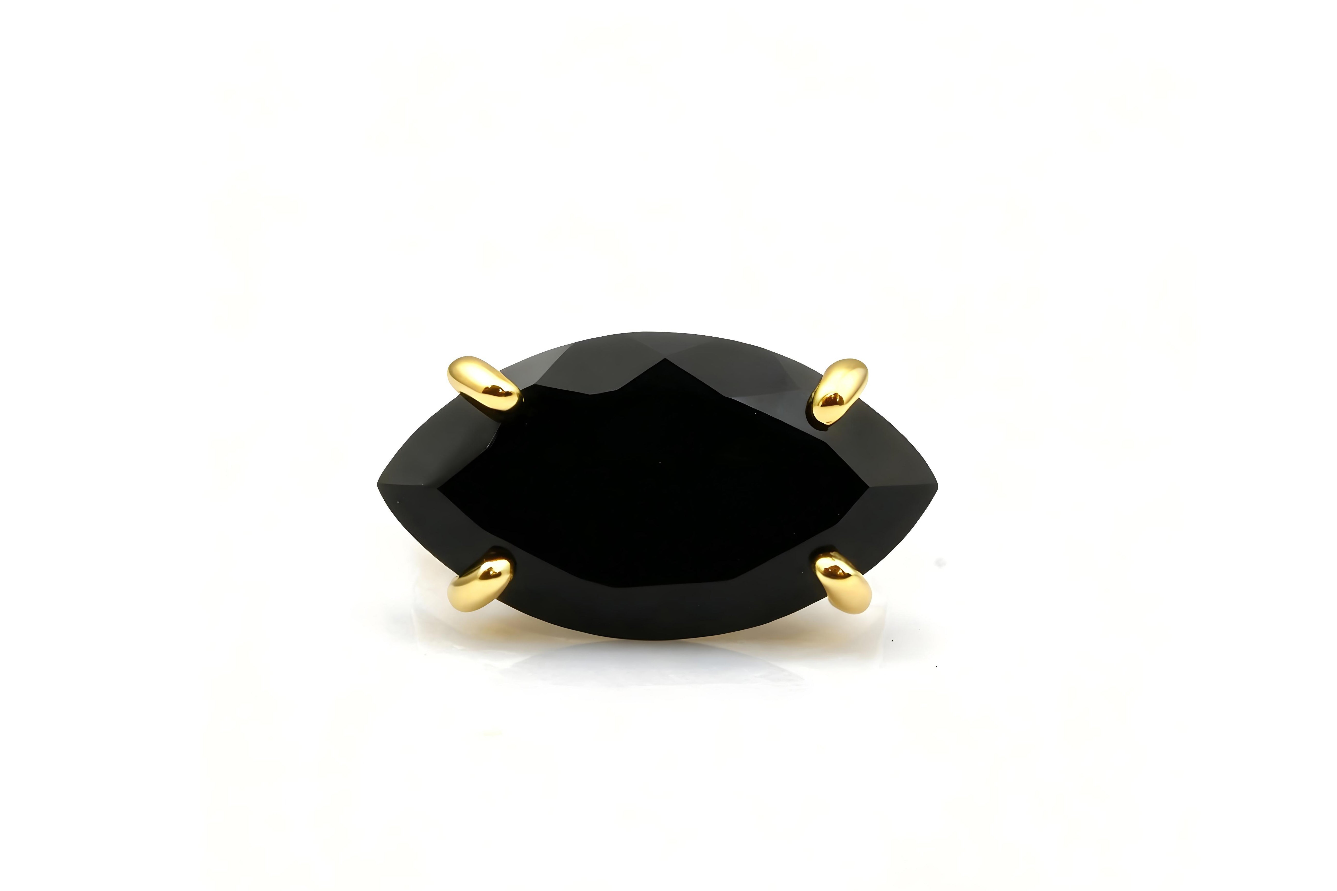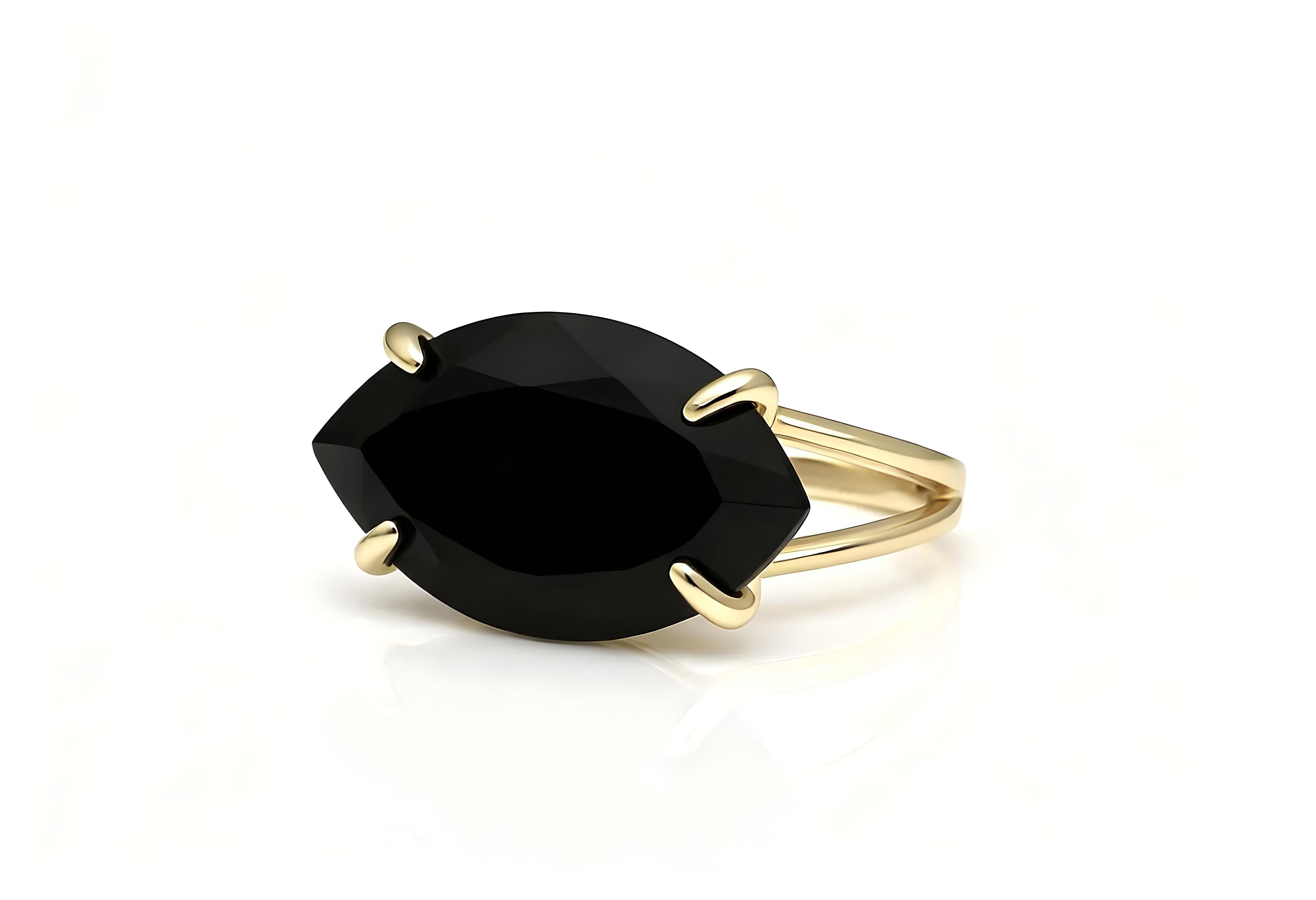 This black onyx marquise ring is crafted in polished gold, featuring a faceted semiprecious gemstone with a sleek elongated silhouette. The deep black tones of onyx resemble the bold look of black diamonds, making it a striking and versatile ring. Handcrafted with care, this gemstone ring is perfect as a cocktail statement piece, a daily wear accessory, or a meaningful gift. Elegant yet modern, it’s a timeless addition to any jewelry collection.