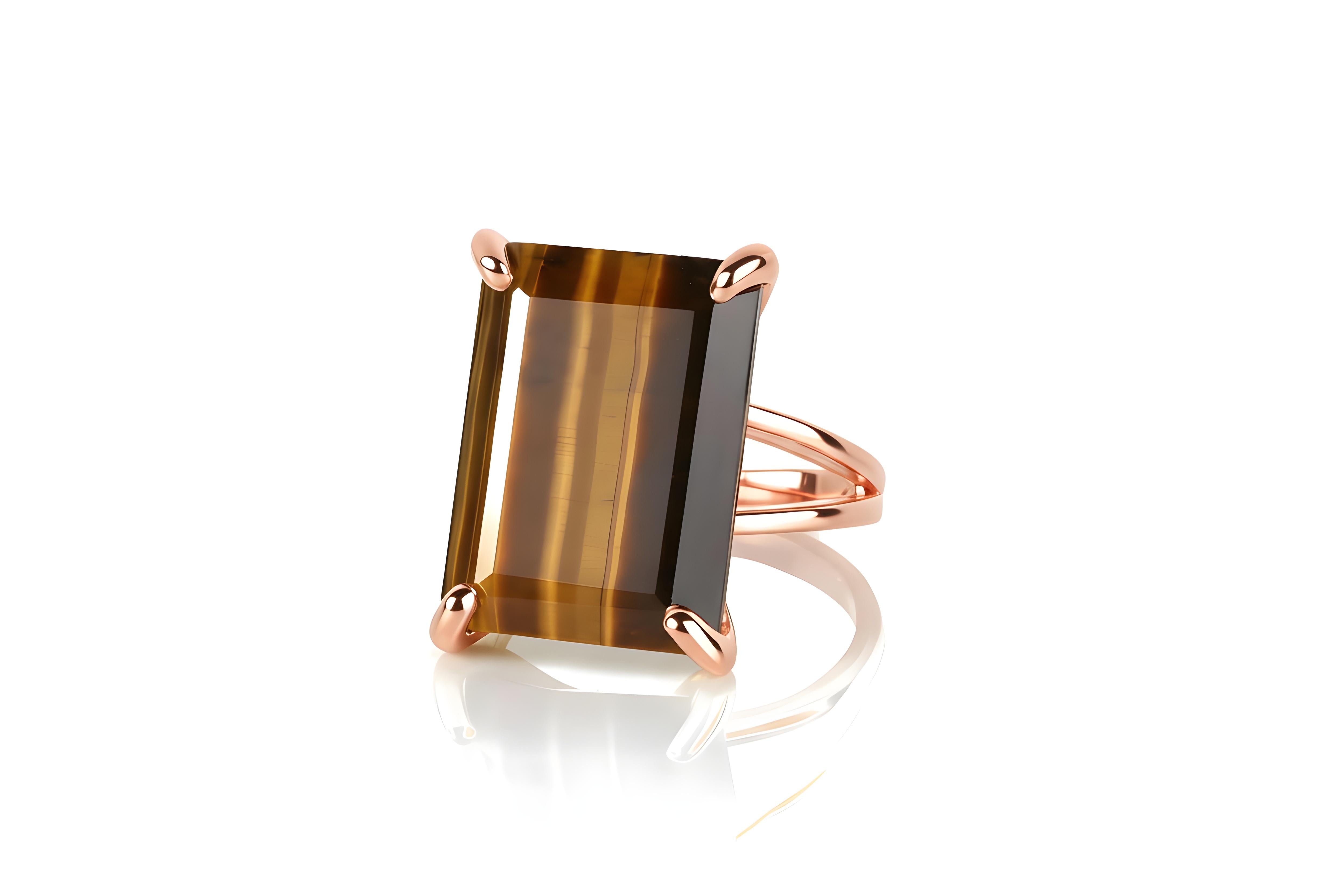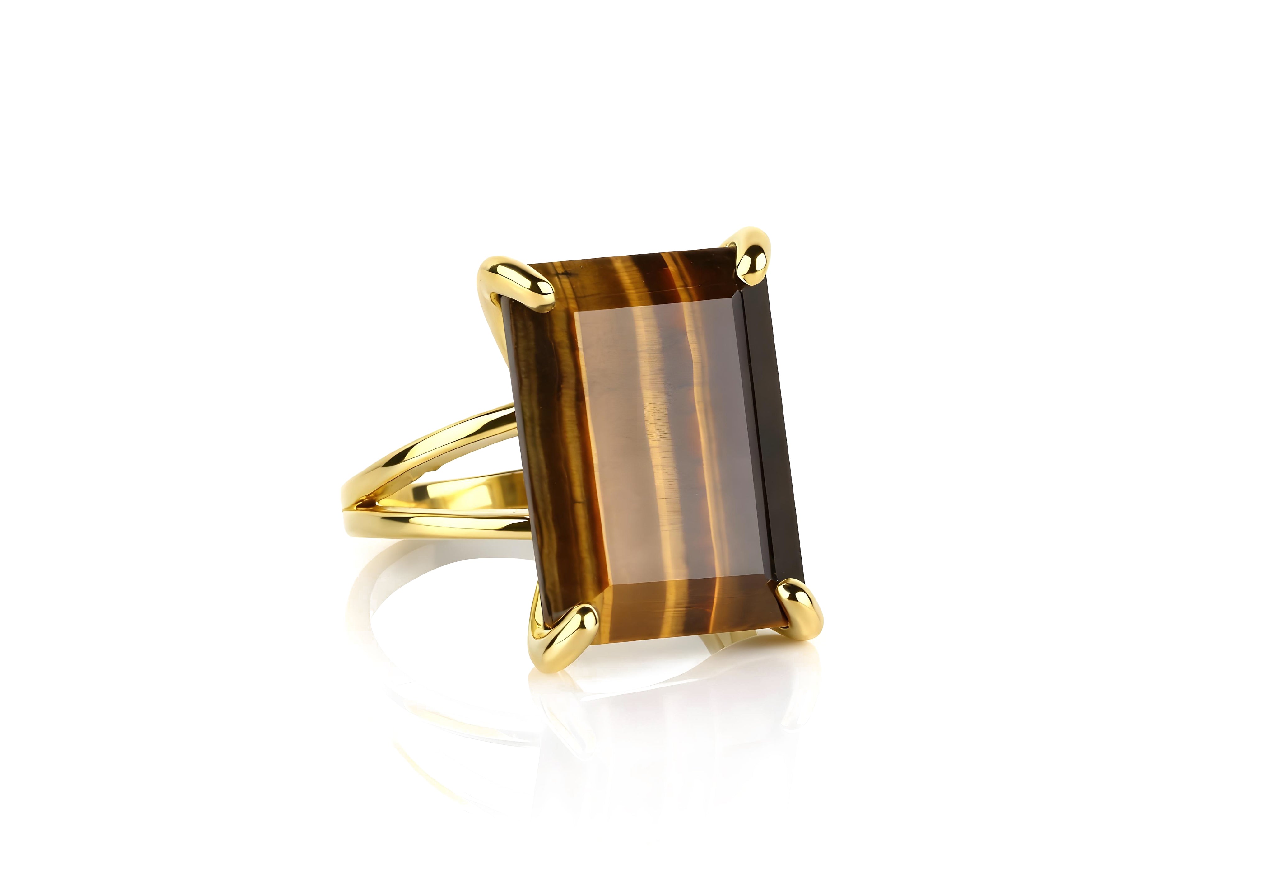 This long rectangle-cut tiger eye ring brings out the natural chatoyancy and warm brown tones of the stone. Set in polished 14k yellow gold filled metal, it creates a slim vertical silhouette that feels bold yet refined. The elongated cut highlights the stone’s natural stripes, giving the ring a modern and minimal aesthetic.
