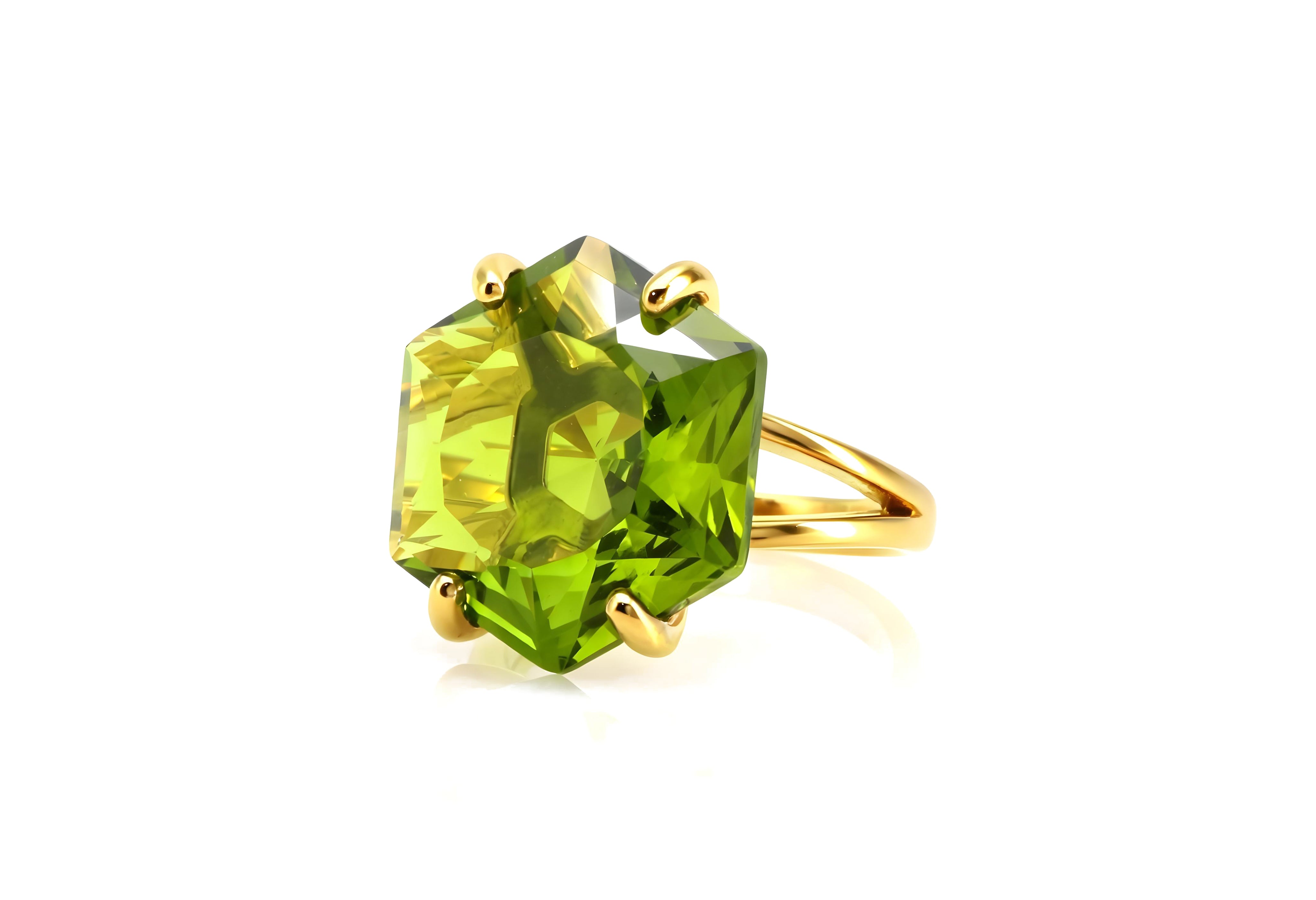 This radiant peridot ring features a beautifully faceted hexagon gemstone set in polished 18k gold vermeil. Known as the August birthstone, peridot symbolizes positivity and renewal, making it a meaningful and stylish choice. Handcrafted with care, this geometric statement ring captures light beautifully and brings a fresh, modern elegance — perfect as a gift or a vibrant everyday piece.
