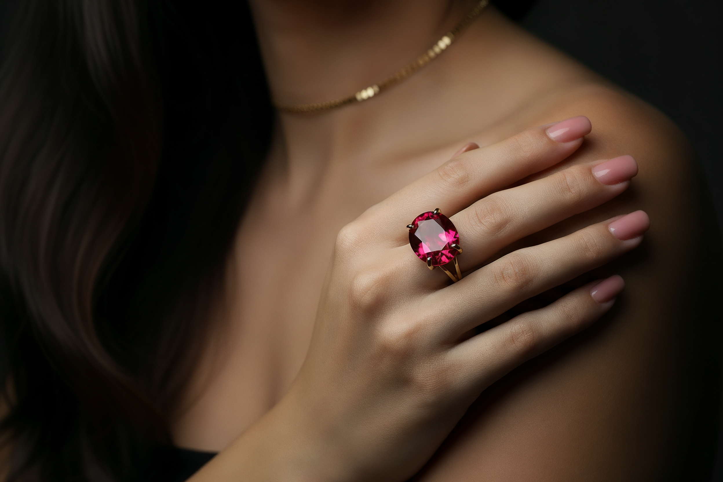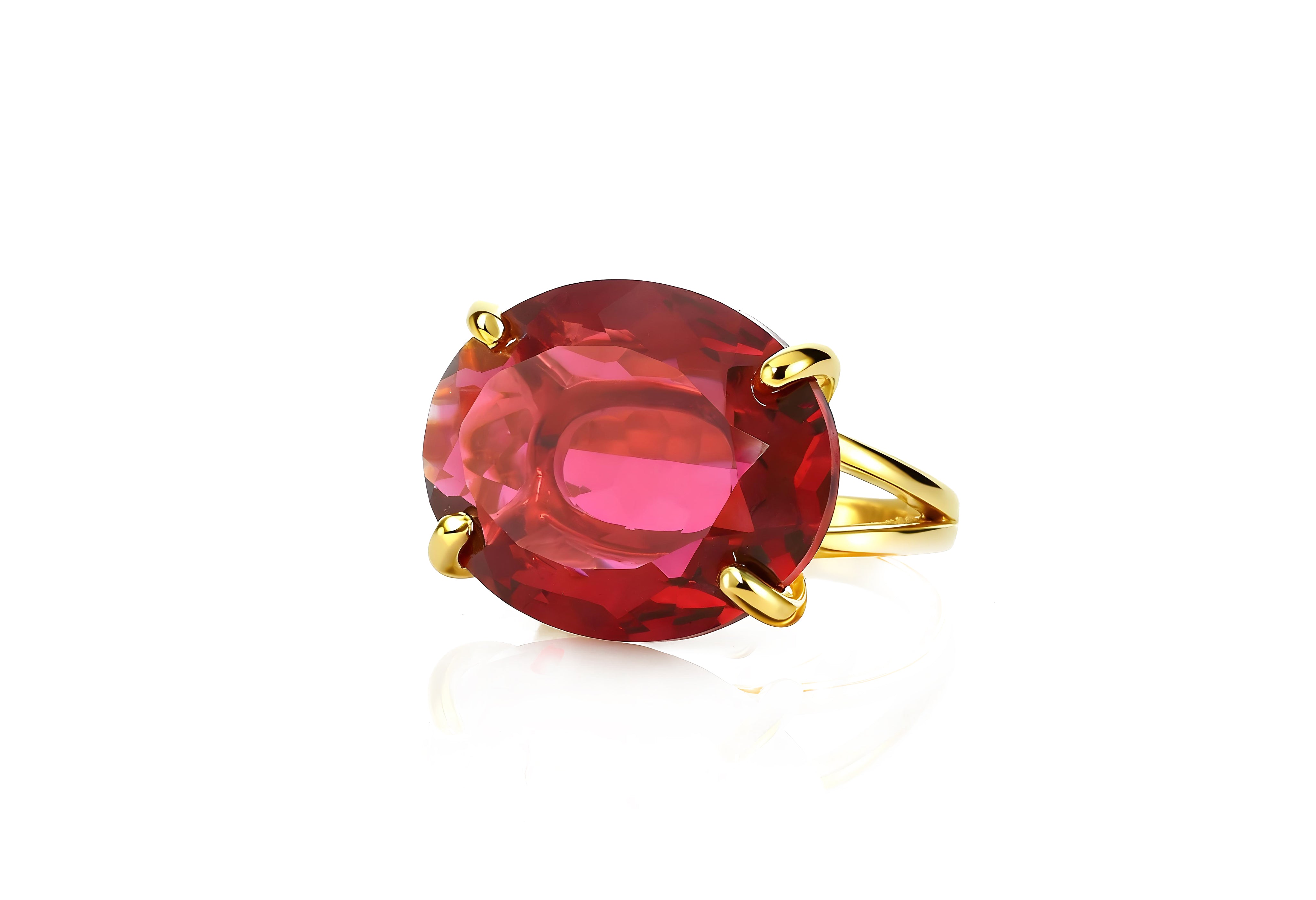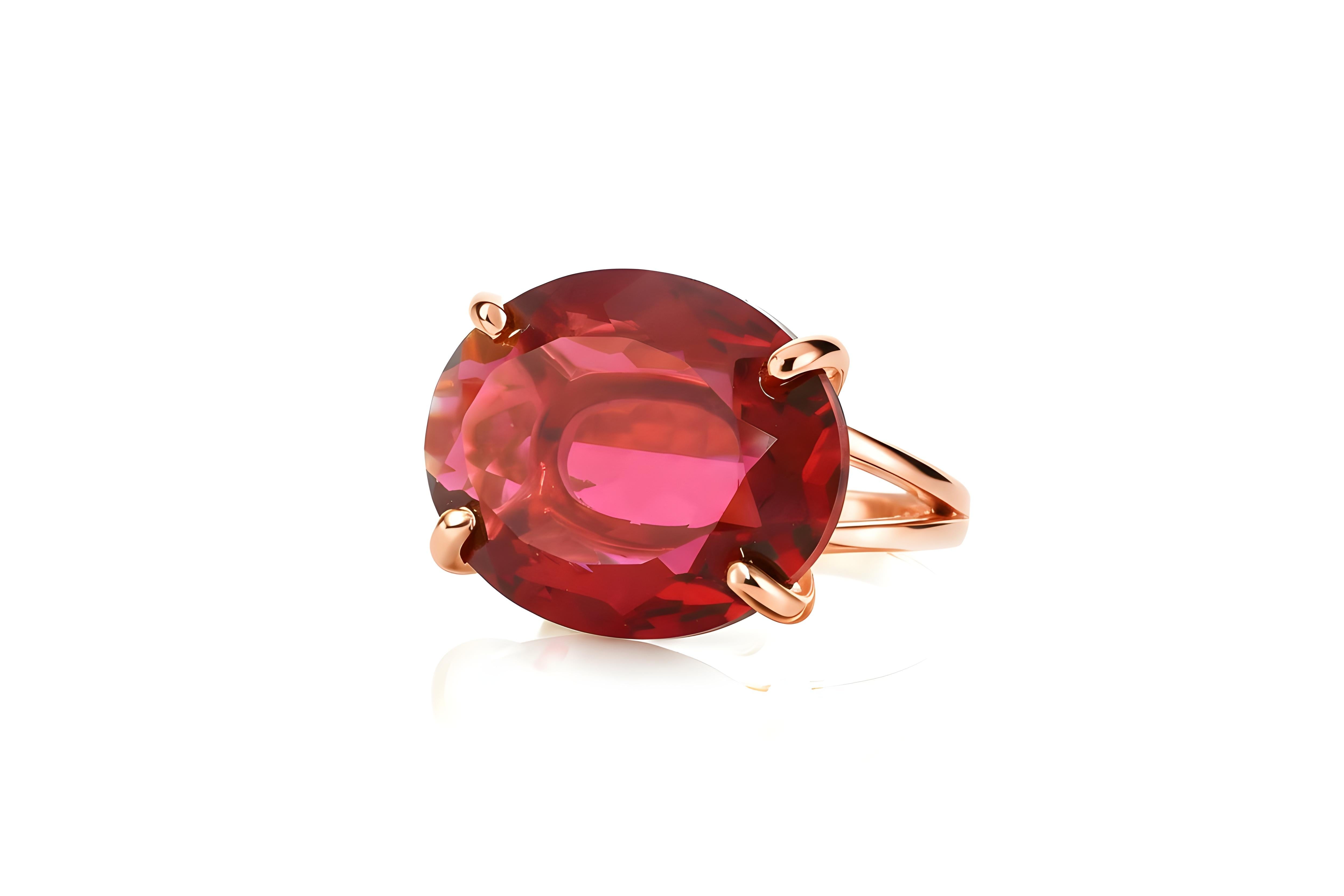 This gold filled oval-cut pink tourmaline ring captures the vivid brilliance of the gemstone with its faceted finish and radiant hue. Set in a secure four-prong design, it balances bold color with timeless elegance. A stunning choice for October birthdays or anyone drawn to the warmth of pink gemstones.