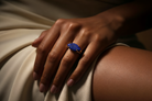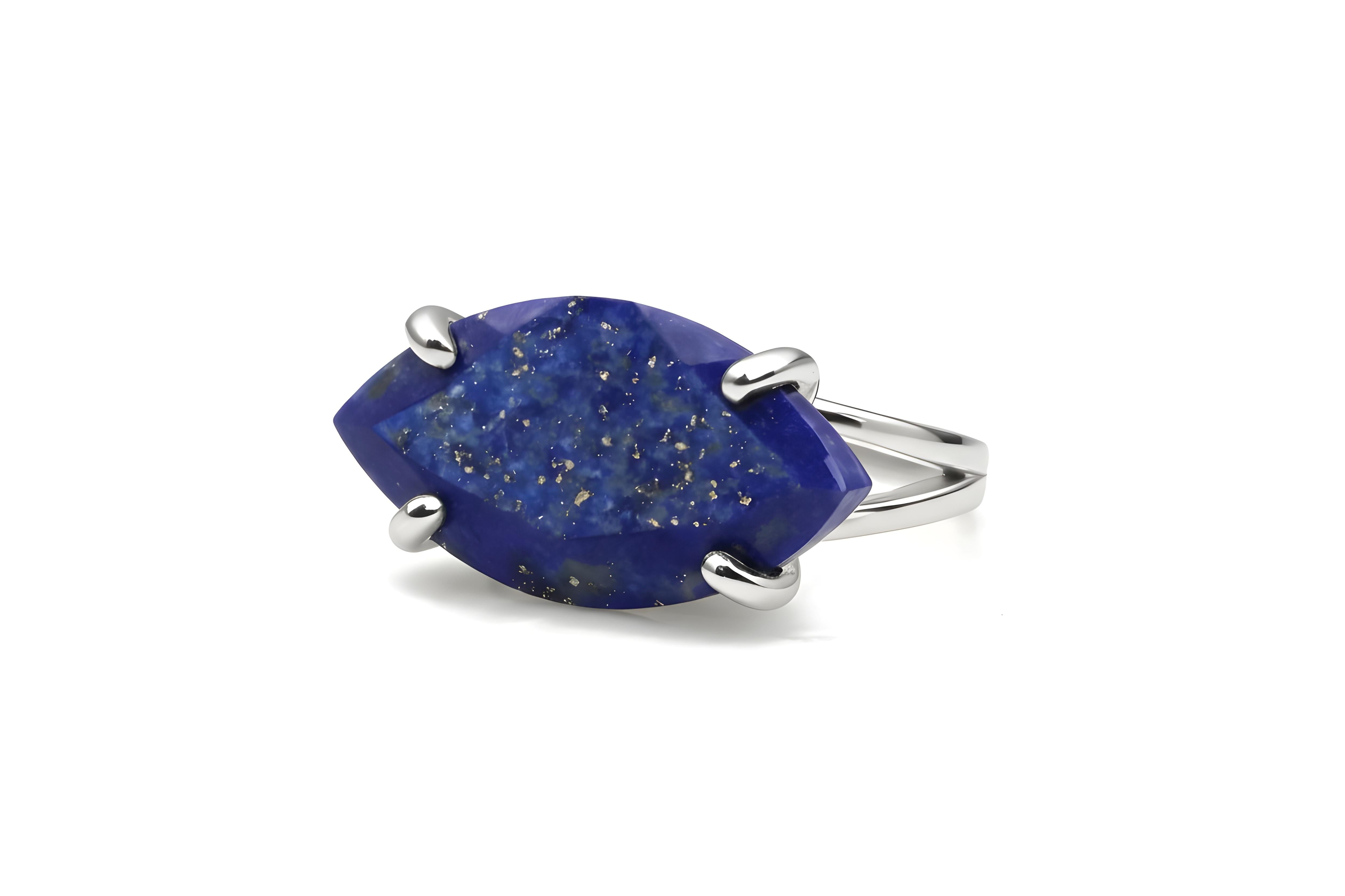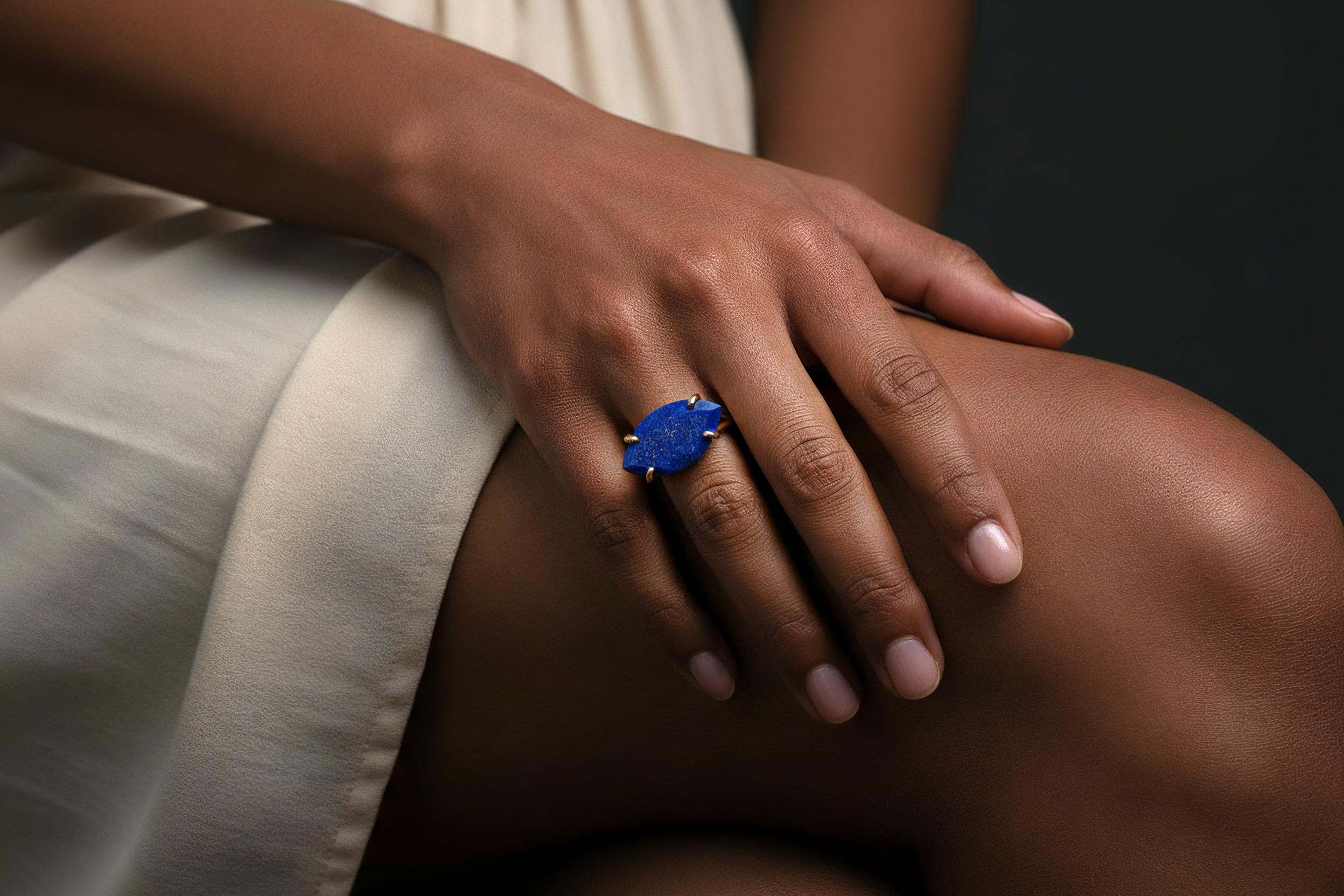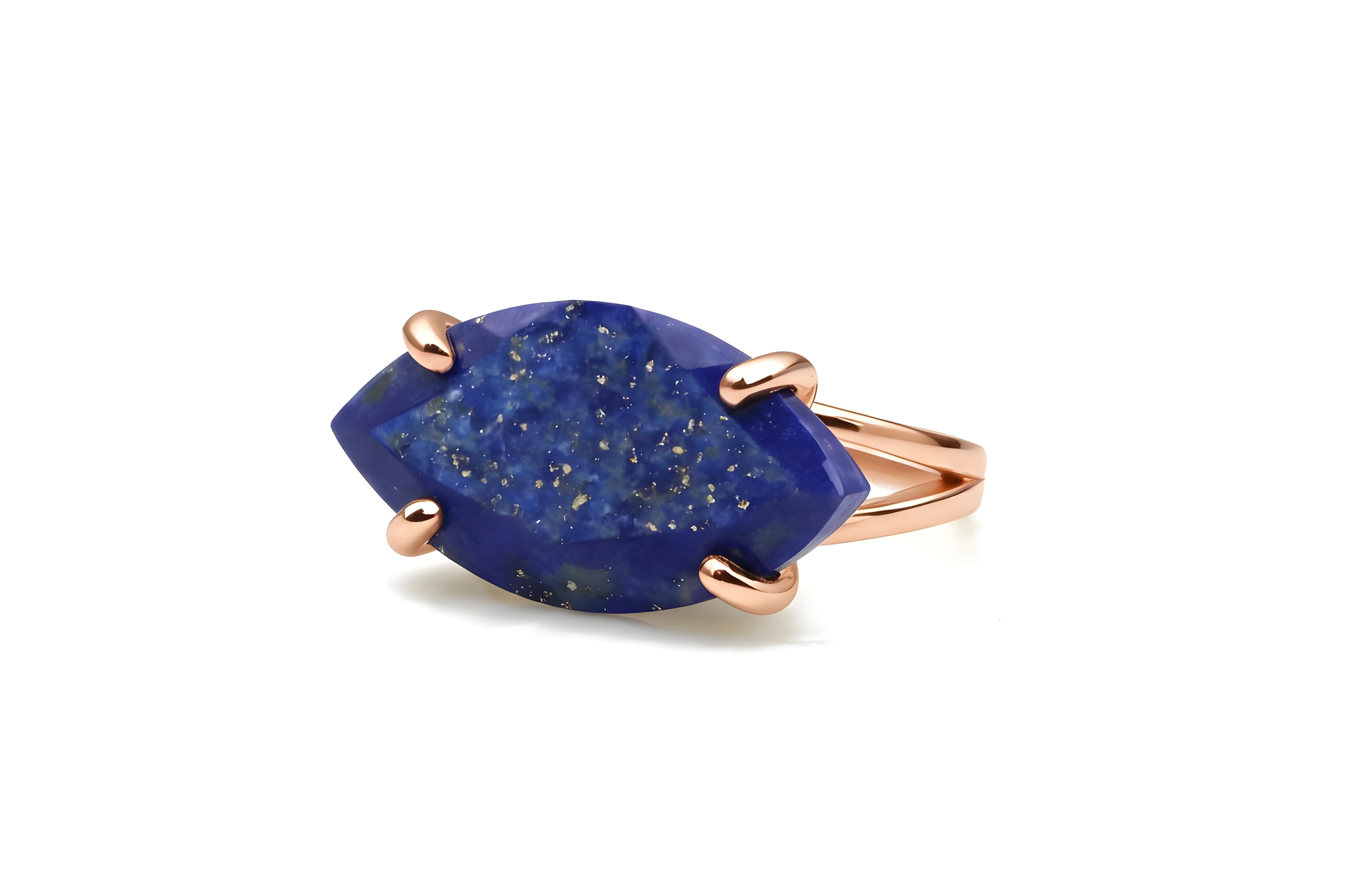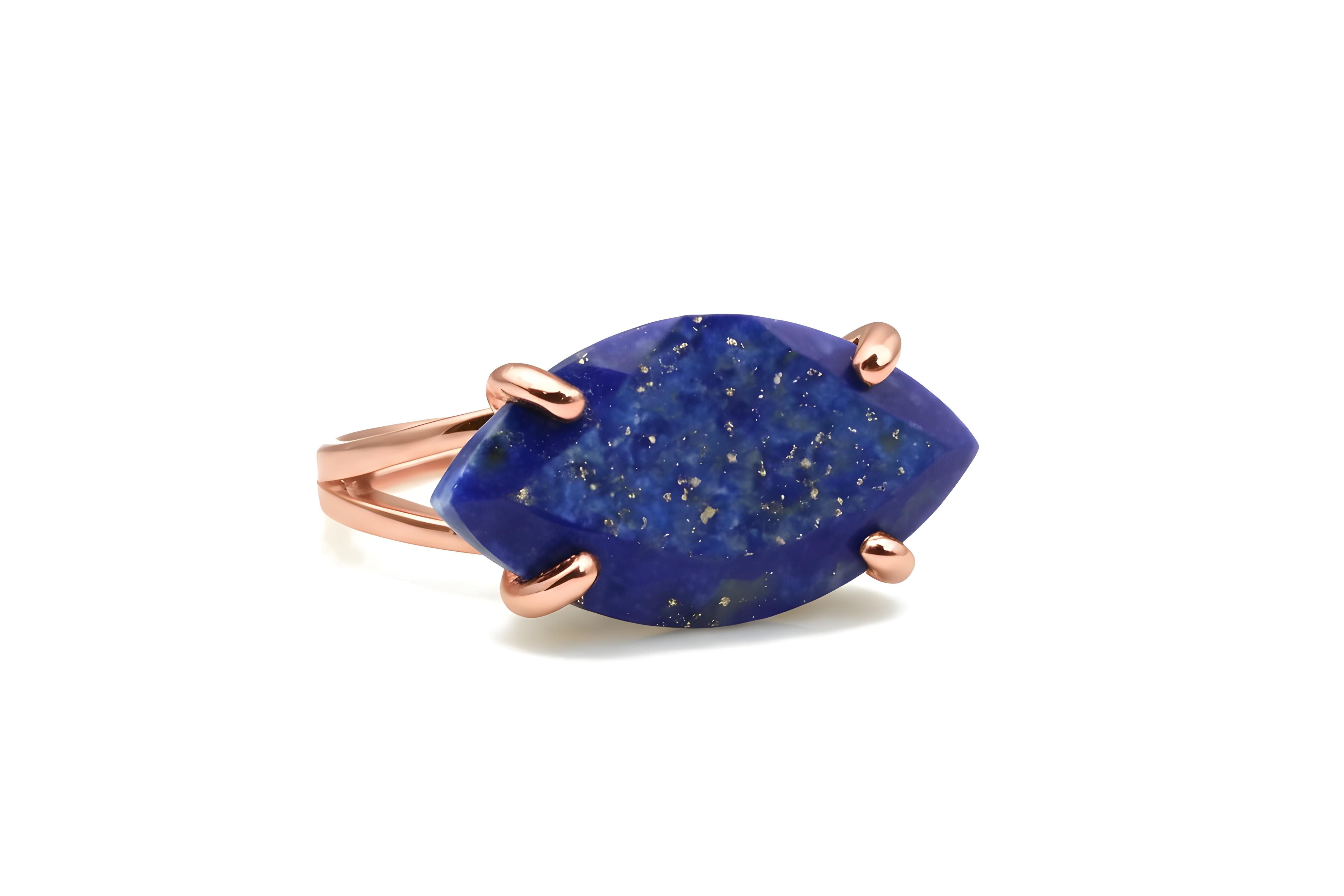 A vibrant marquise-cut lapis lazuli gleams with golden pyrite sparkles, elegantly set in polished rose gold. This handmade ring celebrates September’s birthstone with a perfect blend of sophistication and natural allure. Designed for daily wear or gifting, it’s a striking piece that complements any style.