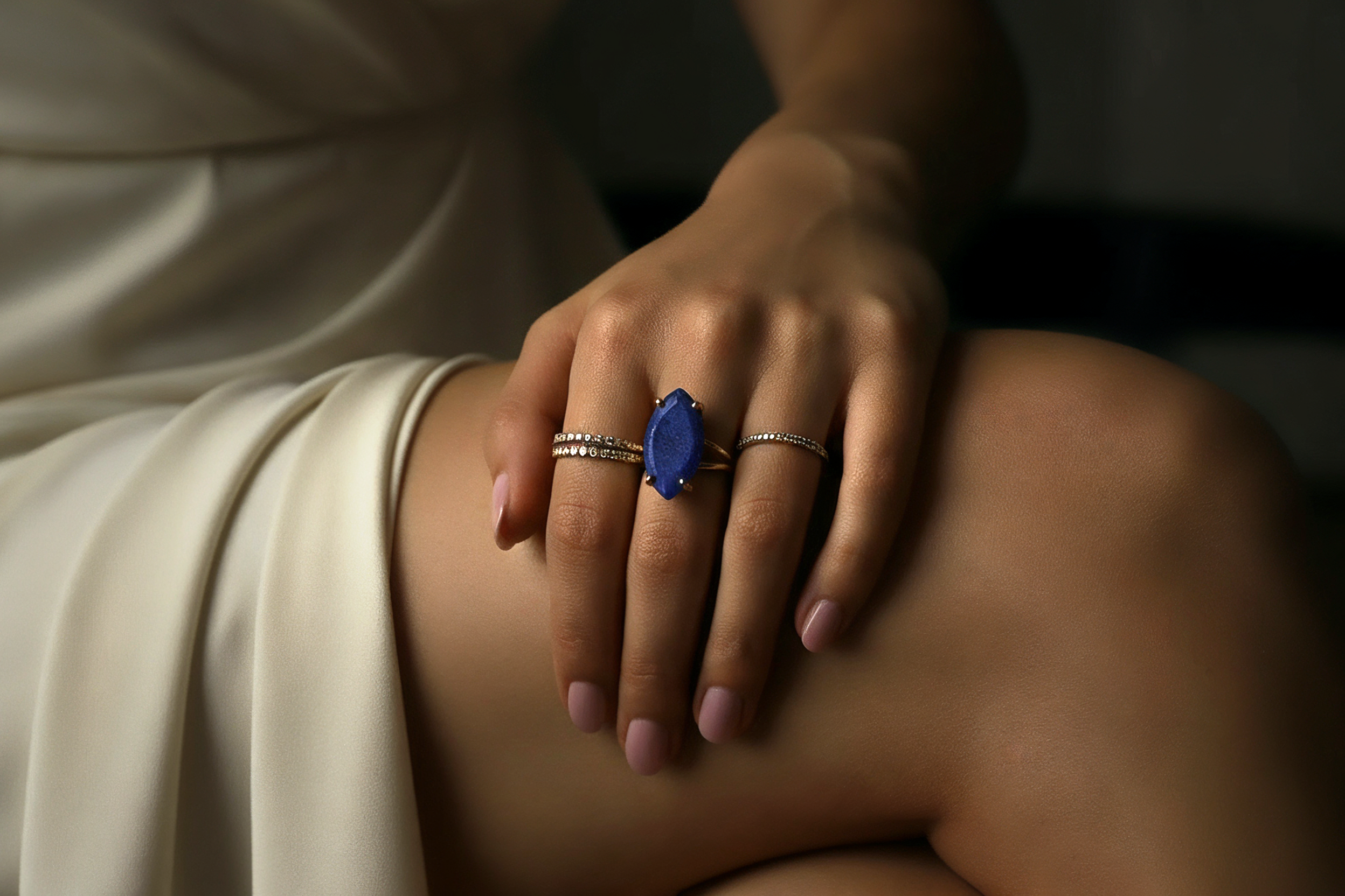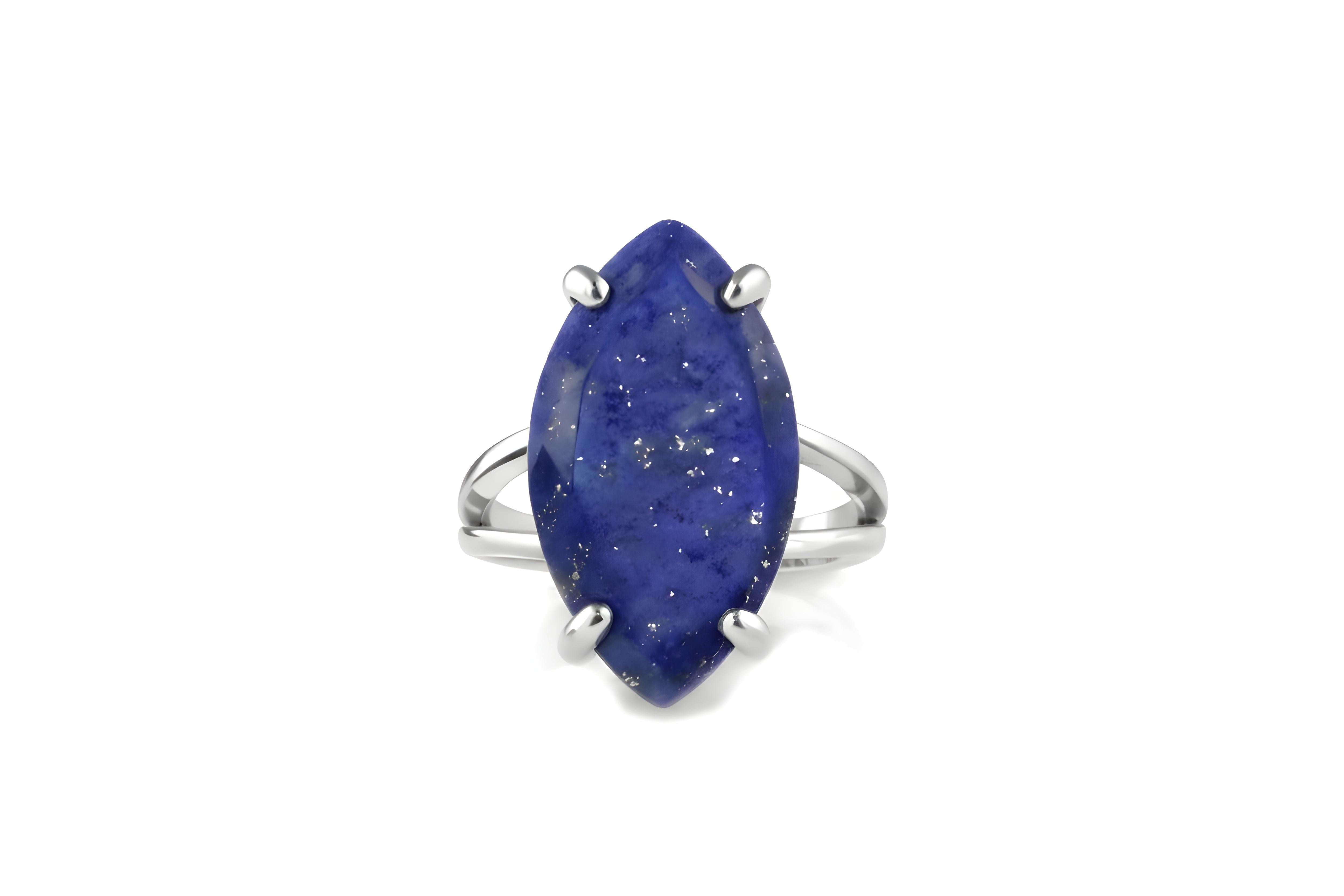 A beautifully faceted marquise-cut lapis lazuli shines with deep celestial blue tones and natural golden flecks, cradled in a polished 925 sterling silver setting. Elegant and bold, this statement piece captures the essence of September’s birthstone with refined simplicity and timeless style.