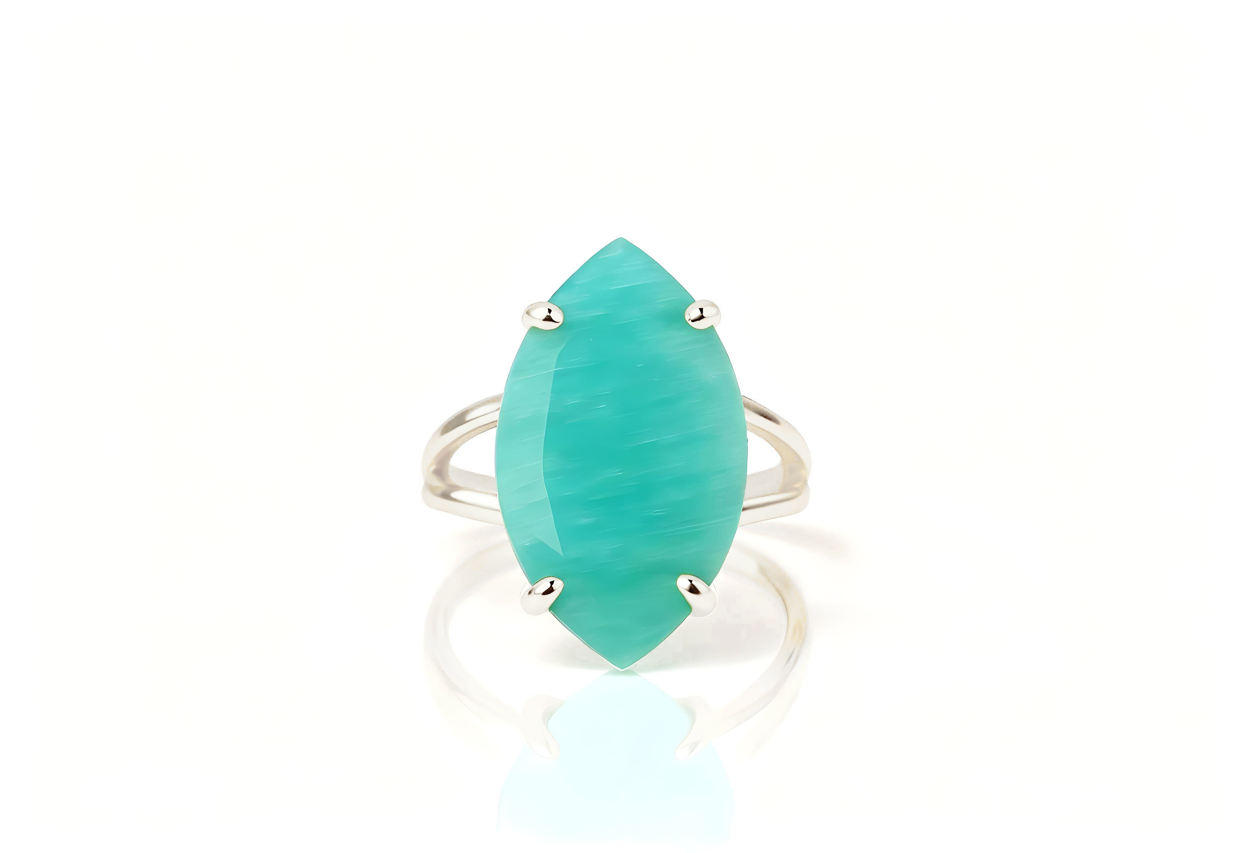 This 925 silver amazonite ring features a beautifully faceted marquise cut gemstone that radiates calming blue-green hues. The sterling silver band enhances the stone’s tranquil glow, creating a refined and timeless piece. Each ring is individually handcrafted to highlight the natural beauty of amazonite, perfect for daily wear or as a thoughtful gift for someone special.