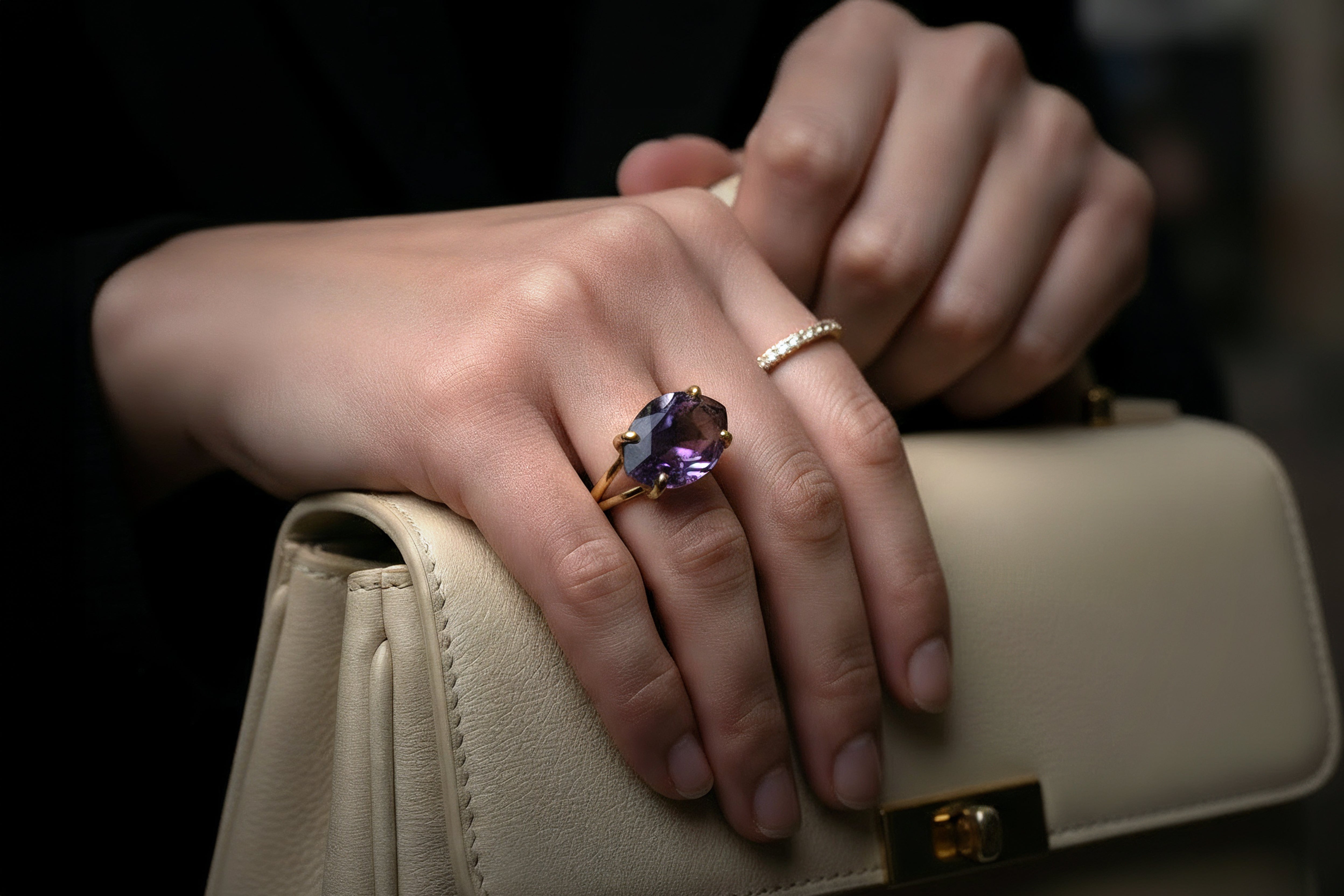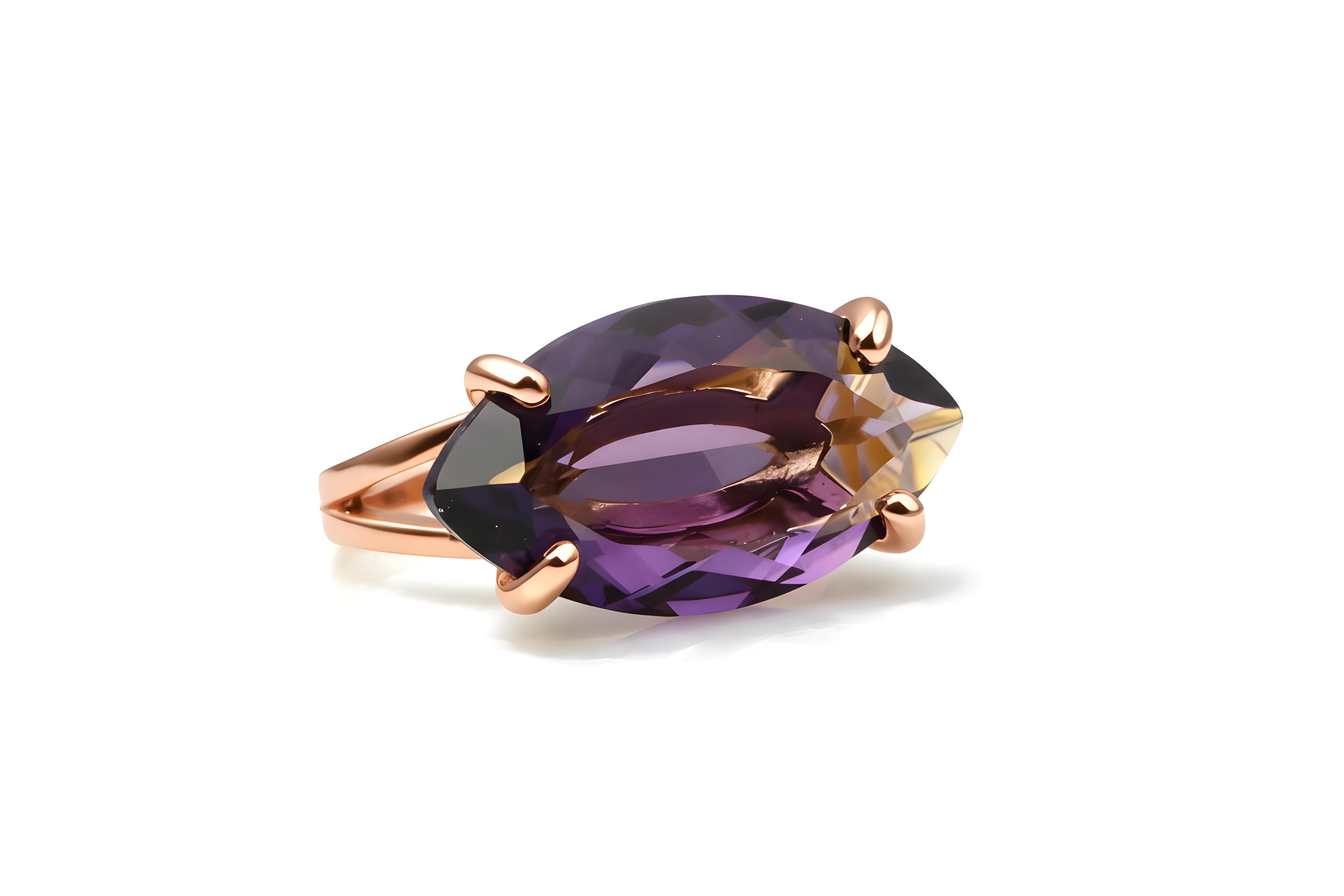 This pink gold amethyst ring is a perfect fusion of warmth and sophistication. Crafted in 14k rose gold, it features a beautifully faceted purple amethyst — the February birthstone known for peace and creativity. Its vintage-inspired design brings timeless elegance to any look, while the handmade quality ensures each piece is truly special.