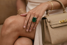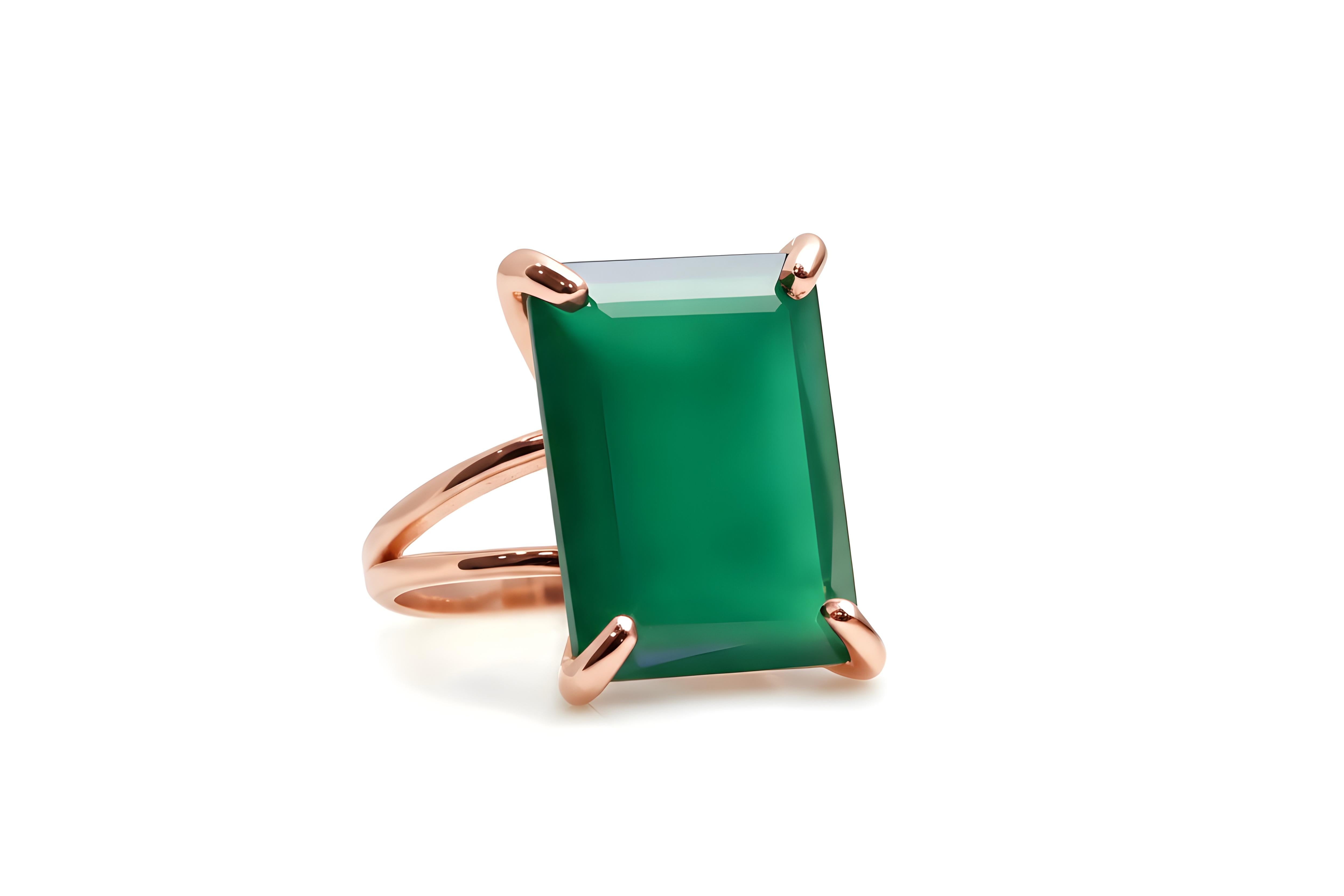 This handcrafted 14k rose gold ring features a deep green onyx gemstone in a bold rectangular cut. Its polished rose gold band highlights the stone’s vivid emerald hue, creating a luxurious and modern statement. Perfect as a cocktail ring, birthstone jewelry, or thoughtful gift, this elegant piece is available in custom sizes and metal options.