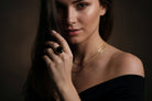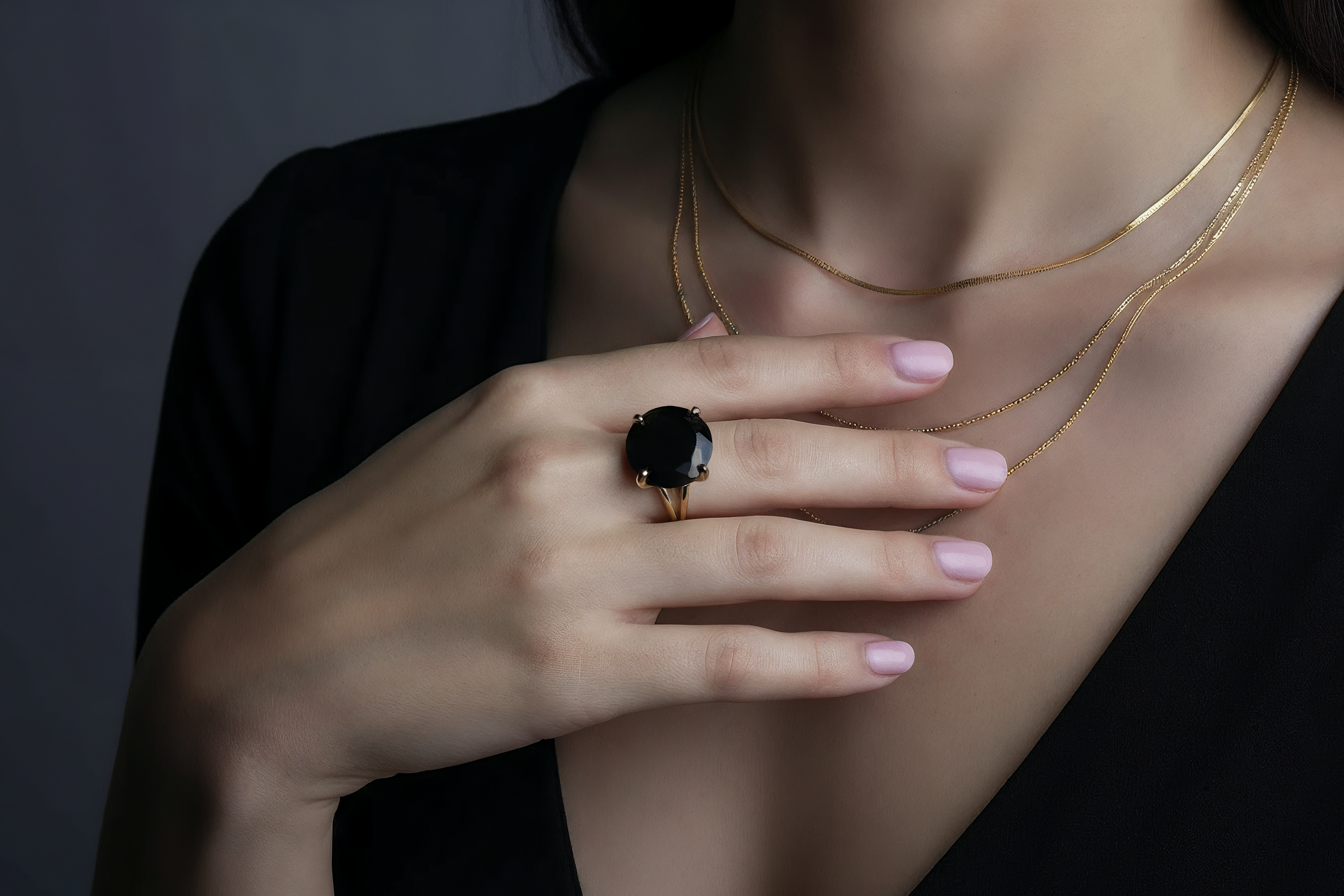 This rose gold black onyx ring is designed as a bold statement piece, featuring a polished gemstone set in a 14k rose gold band. The deep black of onyx contrasts beautifully with the warm rose tones, creating a striking cocktail ring perfect for parties and special occasions. Handcrafted with care, this ring combines modern style with timeless appeal, making it a versatile addition to any collection and a memorable gift.