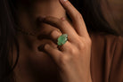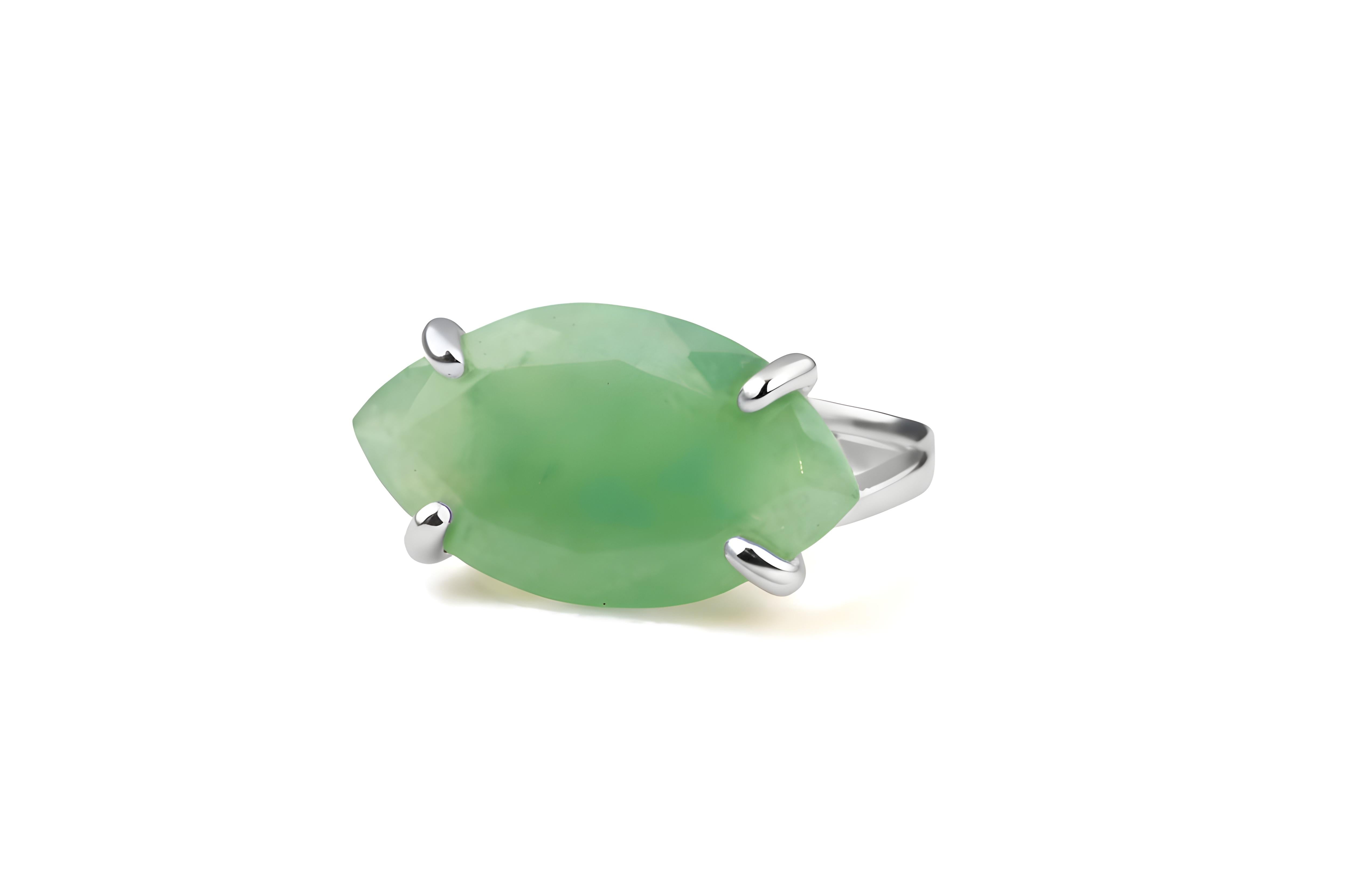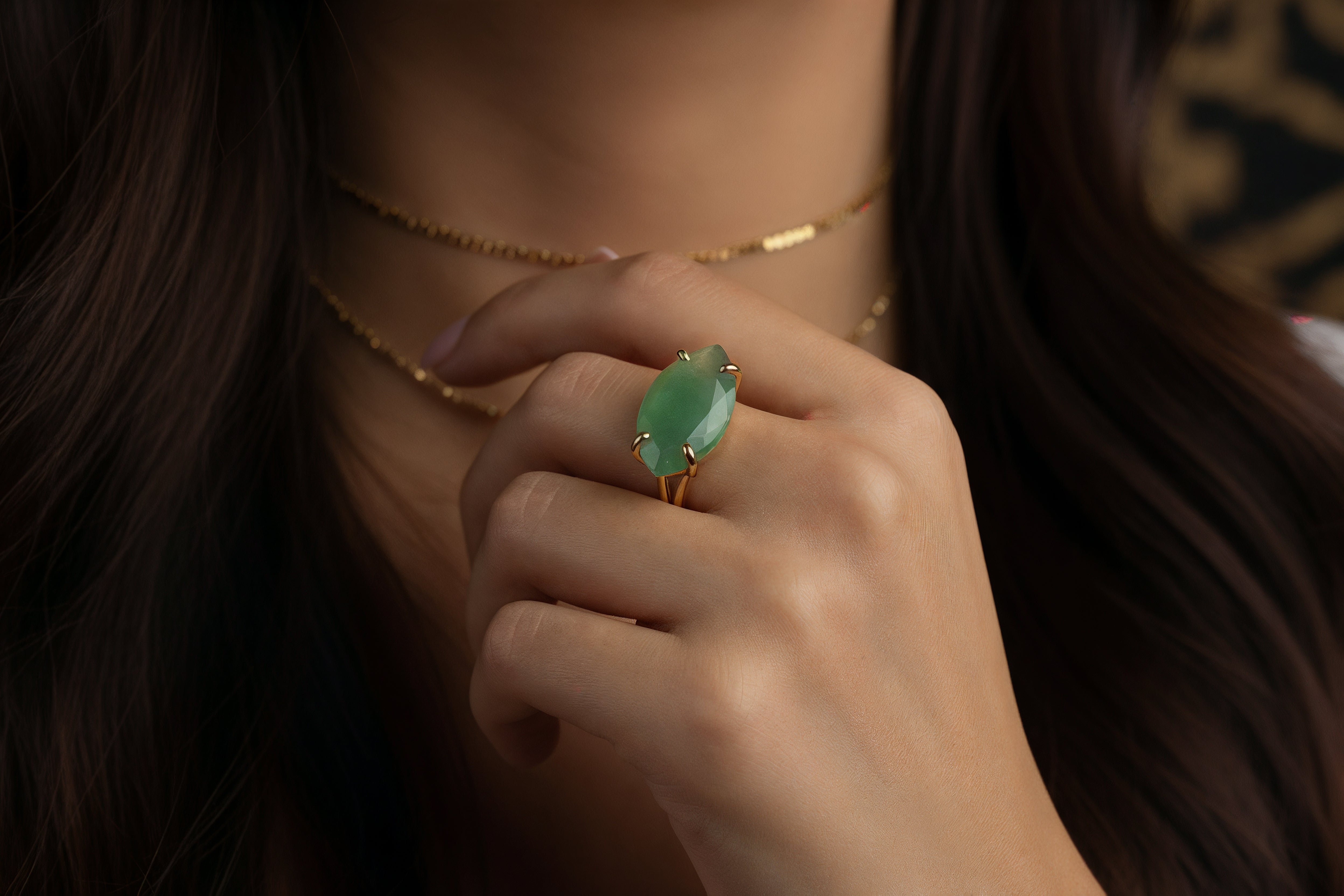 This wide marquise cut aventurine ring shines with a smooth, natural green gemstone set in 14k gold filled metal. The elongated shape enhances the hand’s silhouette, making it an elegant and confident statement piece. Perfect for women who love refined, handcrafted gemstone jewelry with a touch of nature’s charm.