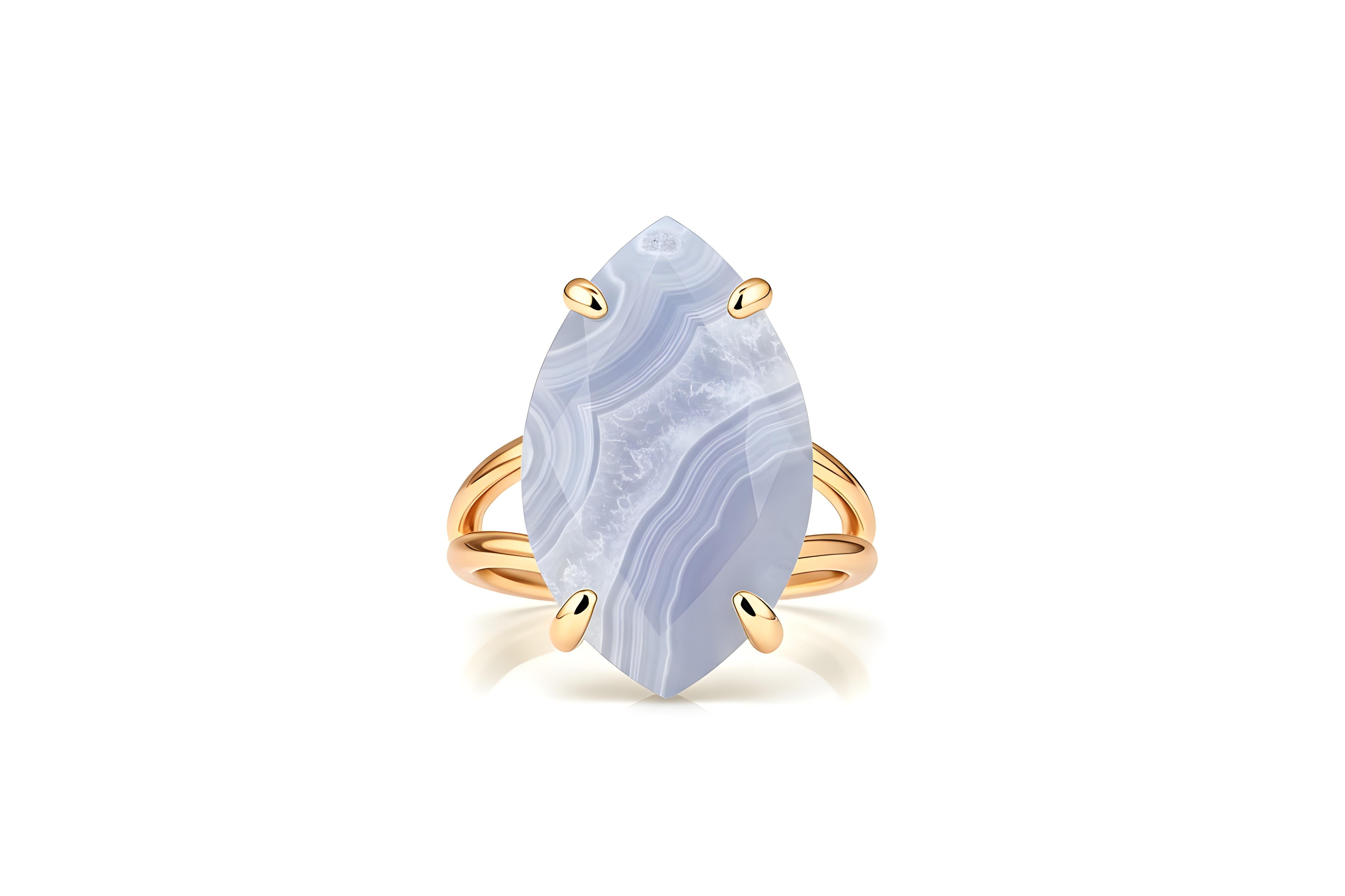 This marquise lace agate ring features a vertical-cut gemstone set in a polished rose gold band. The natural blue lace agate displays its soft layered patterns, symbolizing calm and clarity. Designed as a cocktail-style gemstone ring, it is both bold and meaningful. With customization options for engraving, this handmade ring is perfect as an anniversary gift, a love-inspired keepsake, or a unique statement piece for women.
