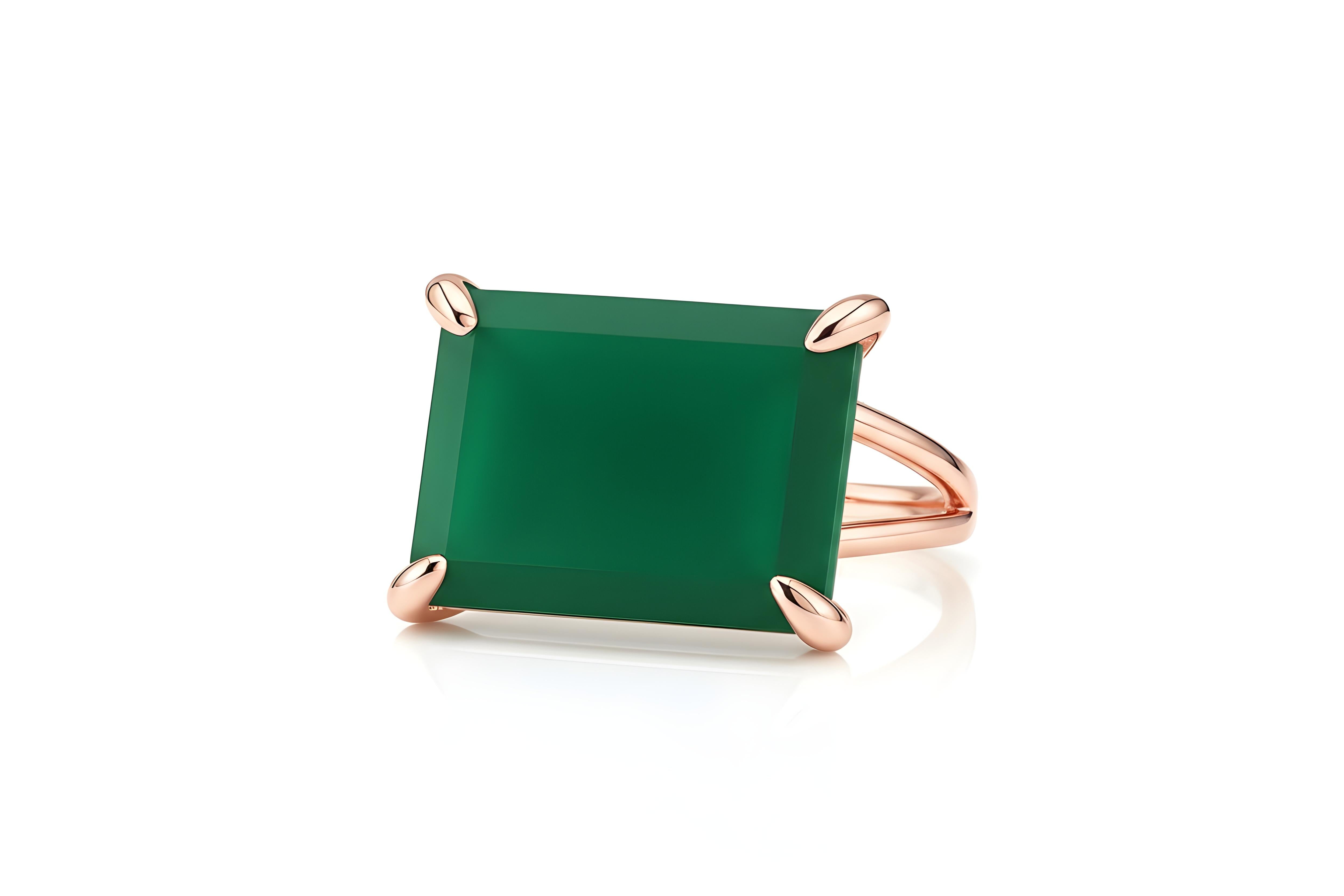 This exquisite rose gold ring showcases a rectangular-cut green onyx gemstone with a radiant emerald hue. The smooth, polished rose gold setting highlights the gemstone’s vibrant color, creating a feminine and modern look. Perfect for gifting, bridal wear, or everyday sophistication, this handcrafted ring is a stunning addition to any jewelry collection.