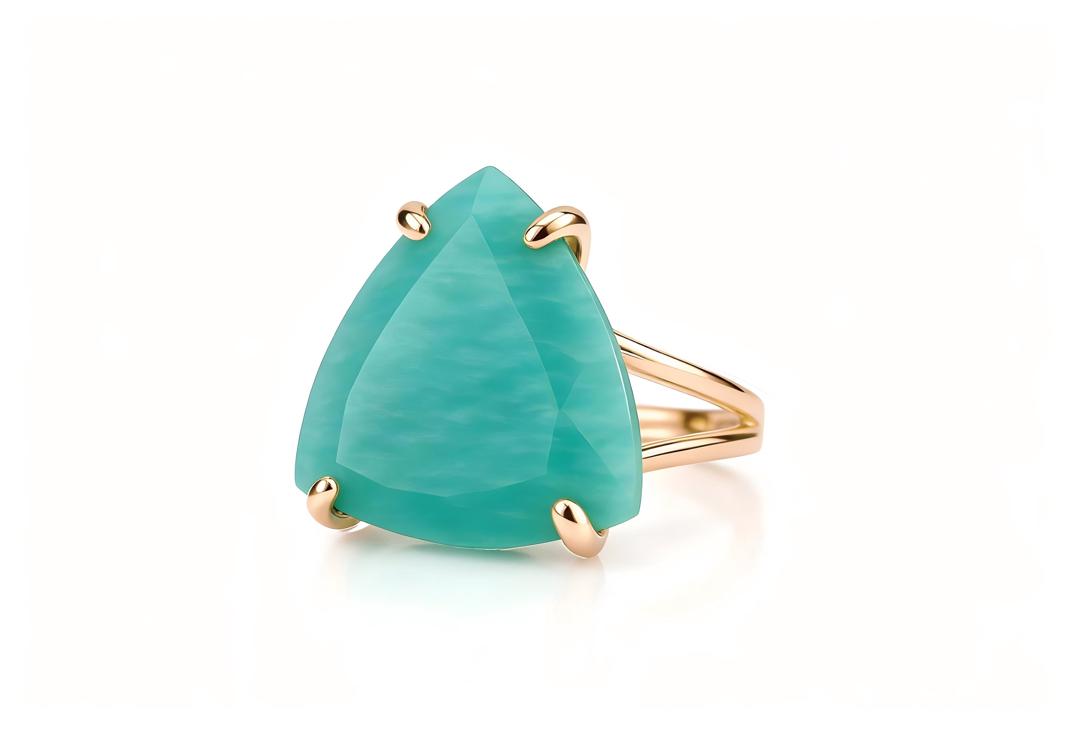 This stunning Amazonite ring features a rare trillion-cut gemstone set in 14k rose gold. Its smooth pastel hue glows with natural depth, while the polished prong setting adds a refined and artistic finish. Handcrafted with precision, each ring can be customized in size or metal type. A perfect balance of elegance and color for everyday wear or special occasions.
