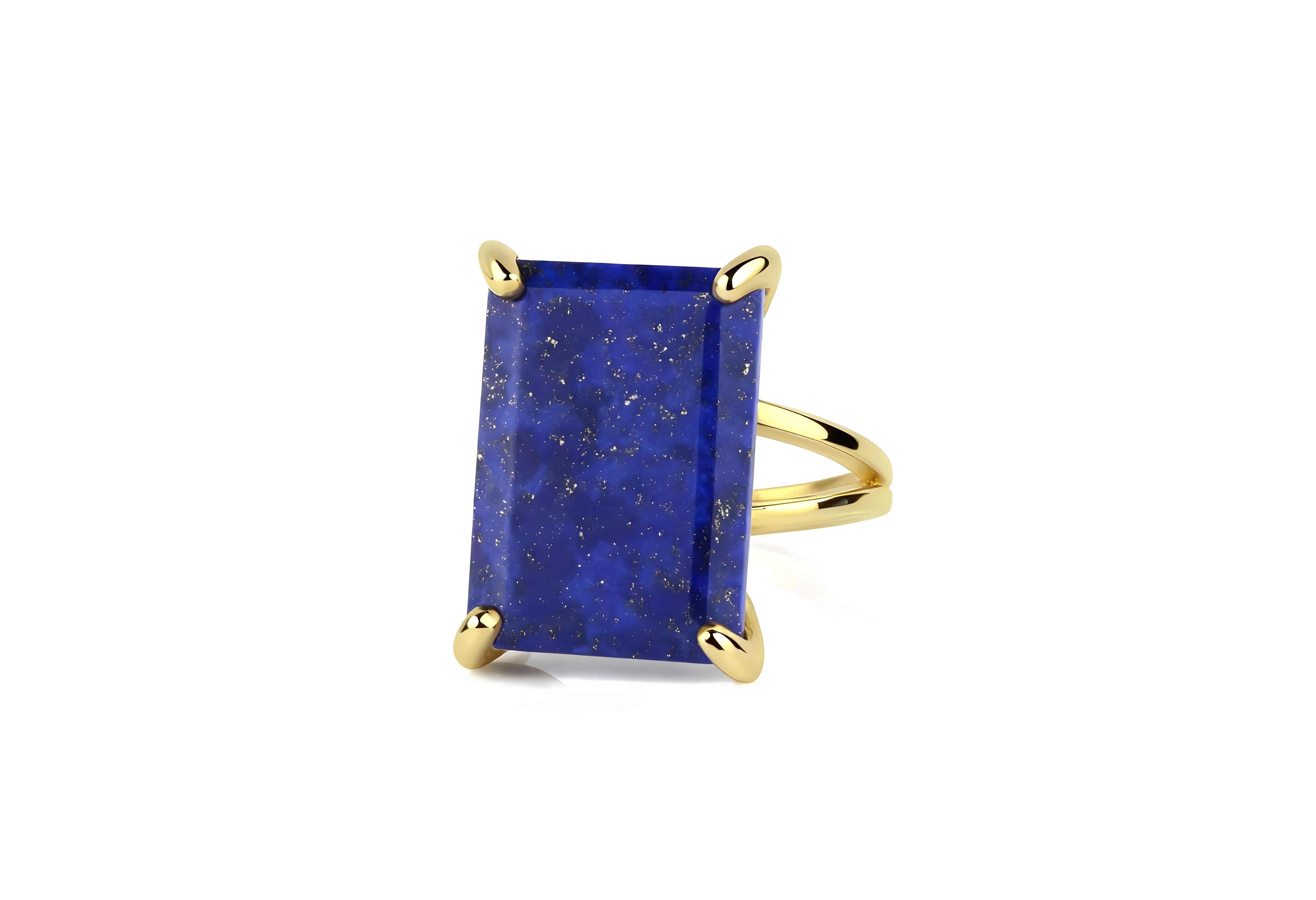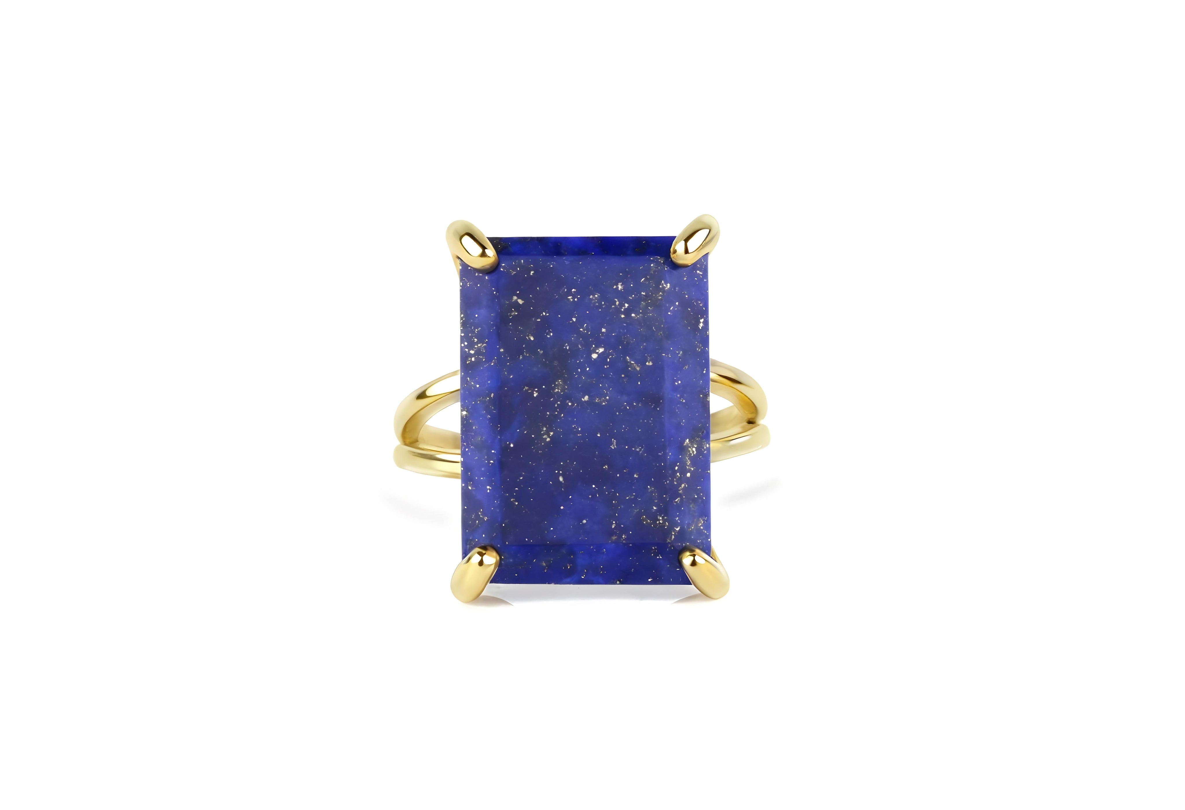 A rectangular lapis lazuli gemstone glimmers with gold-flecked detail, set in a polished 14k gold-filled band. Its bold geometric design captures sophistication and confidence, making it a striking September birthstone piece. Perfect for women who appreciate unique, handcrafted jewelry with natural allure.