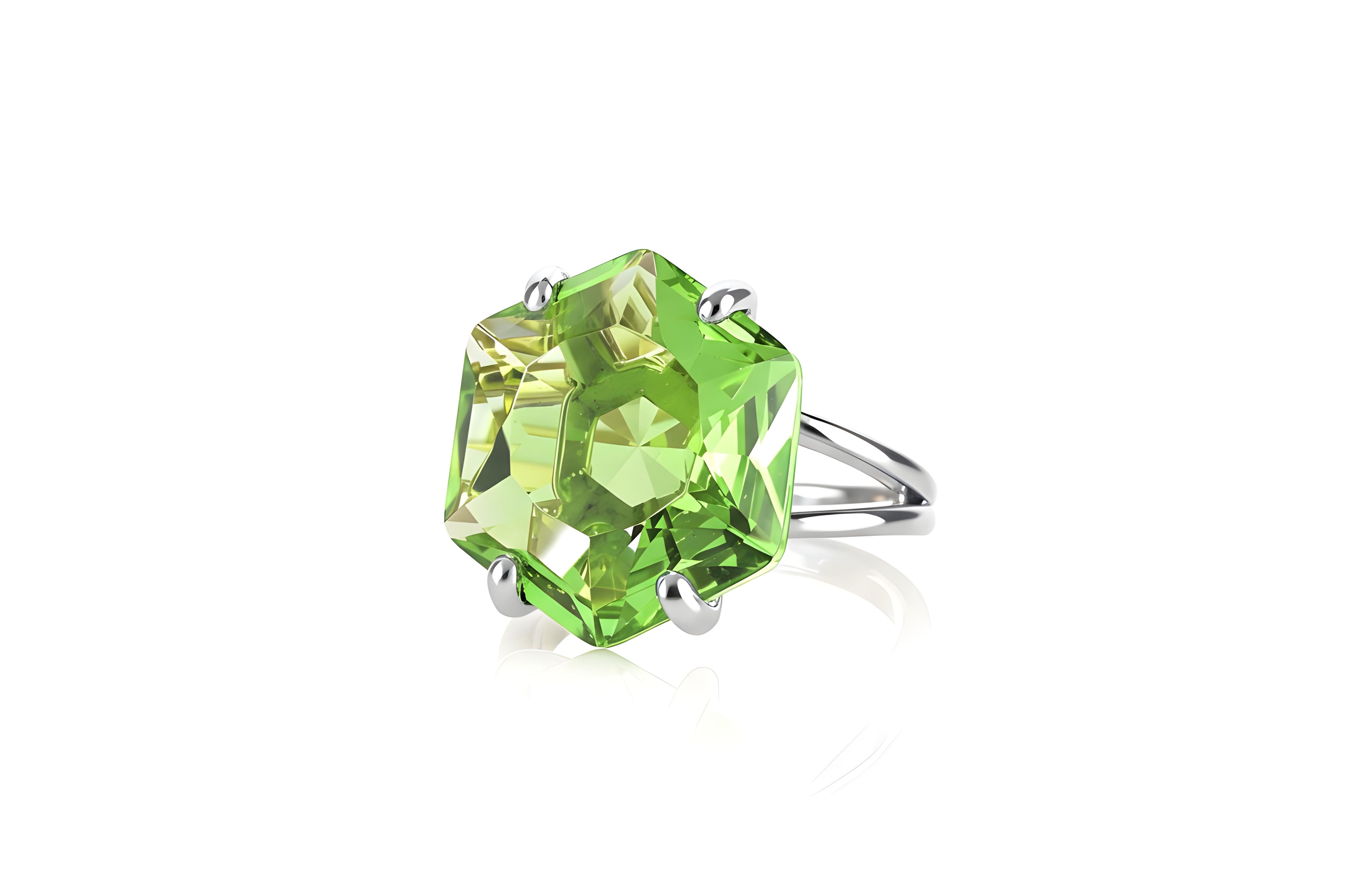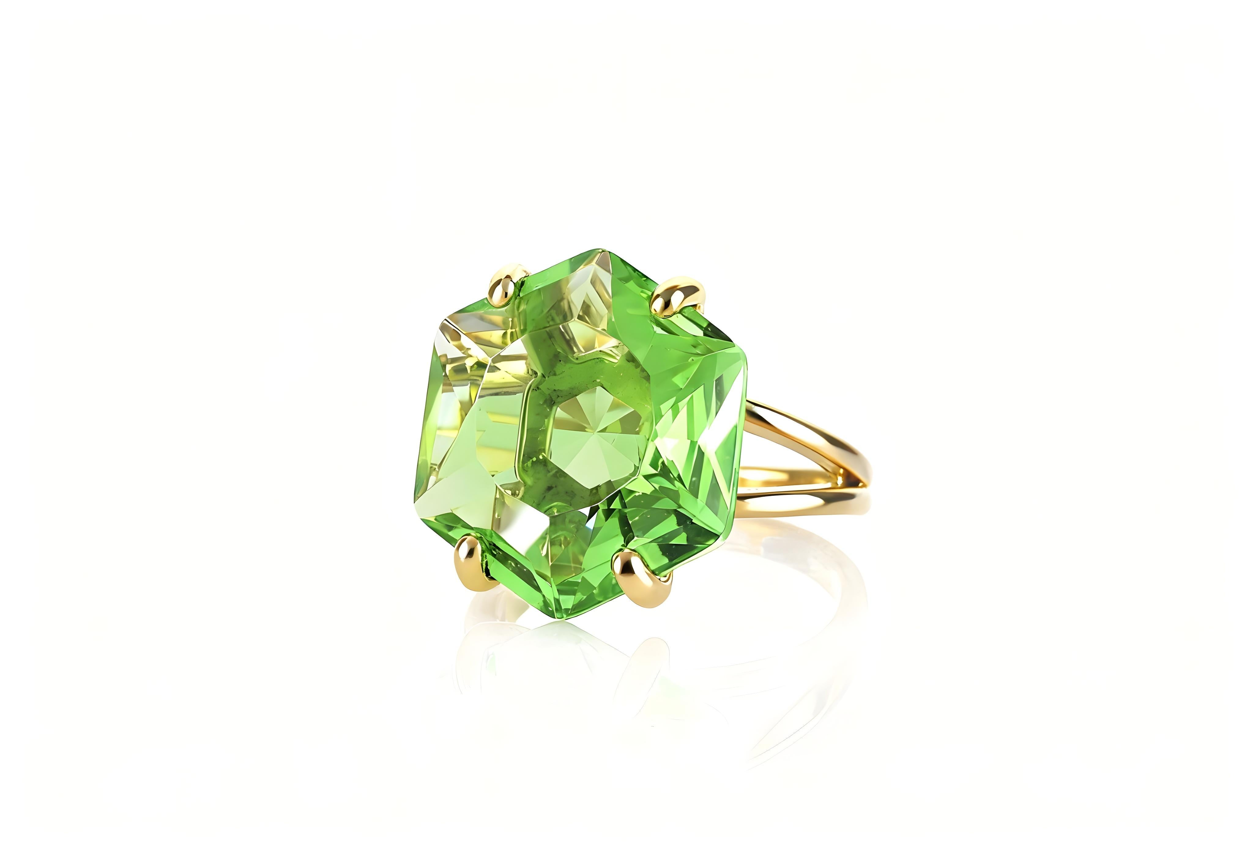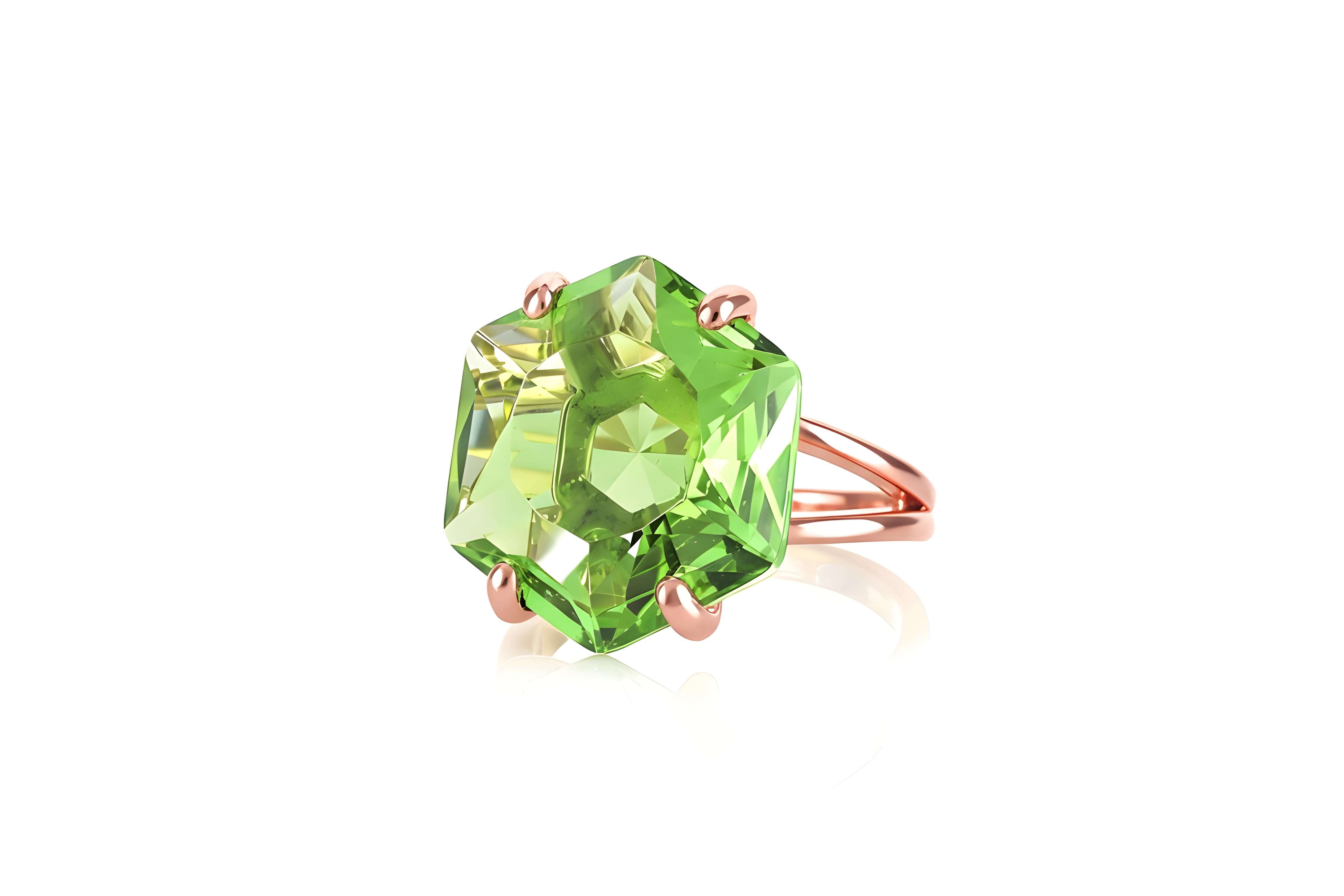 Elevate your evening wear with our Green Tourmaline Hexagon Cut Gemstone Ring. This stunning piece features a vivid green tourmaline, expertly cut into a hexagon shape and set in a classic gold prong setting, making it a perfect choice for sophisticated events or glamorous nights out. The ring's strong green color and shiny facets ensure it catches the light and captures attention. Ideal for those who desire a statement piece that combines elegance with a touch of modern flair.