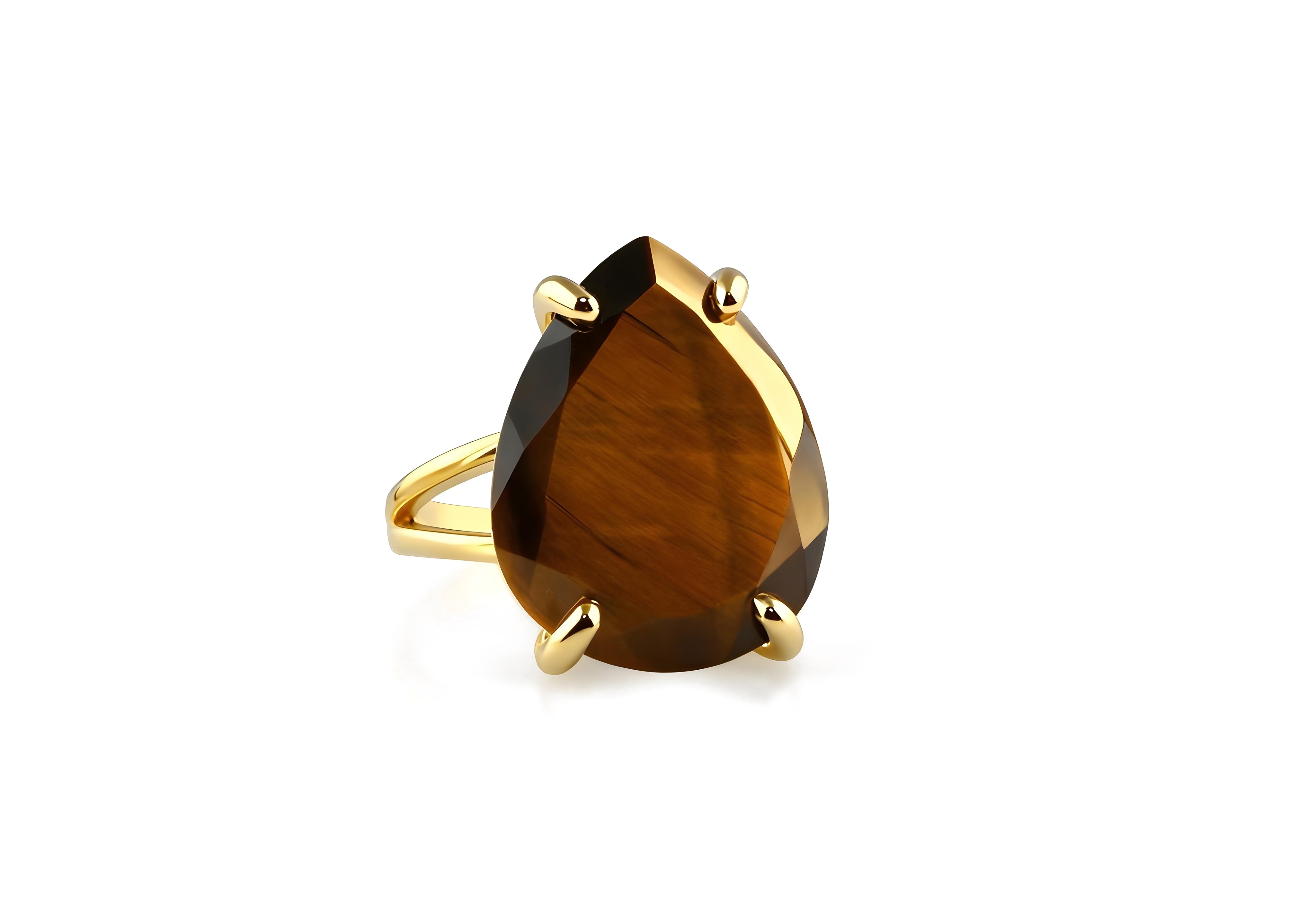 This handcrafted 14k gold ring features a beautifully faceted pear-cut tiger eye gemstone, known for its warm golden tones and elegant depth. The teardrop shape creates a flattering, elongated look that feels bold yet refined for everyday wear.Each ring is carefully handmade, offering a natural gemstone centerpiece with unique variations in pattern and color. A meaningful and stylish choice for gifting or adding a standout statement ring to your personal collection.