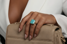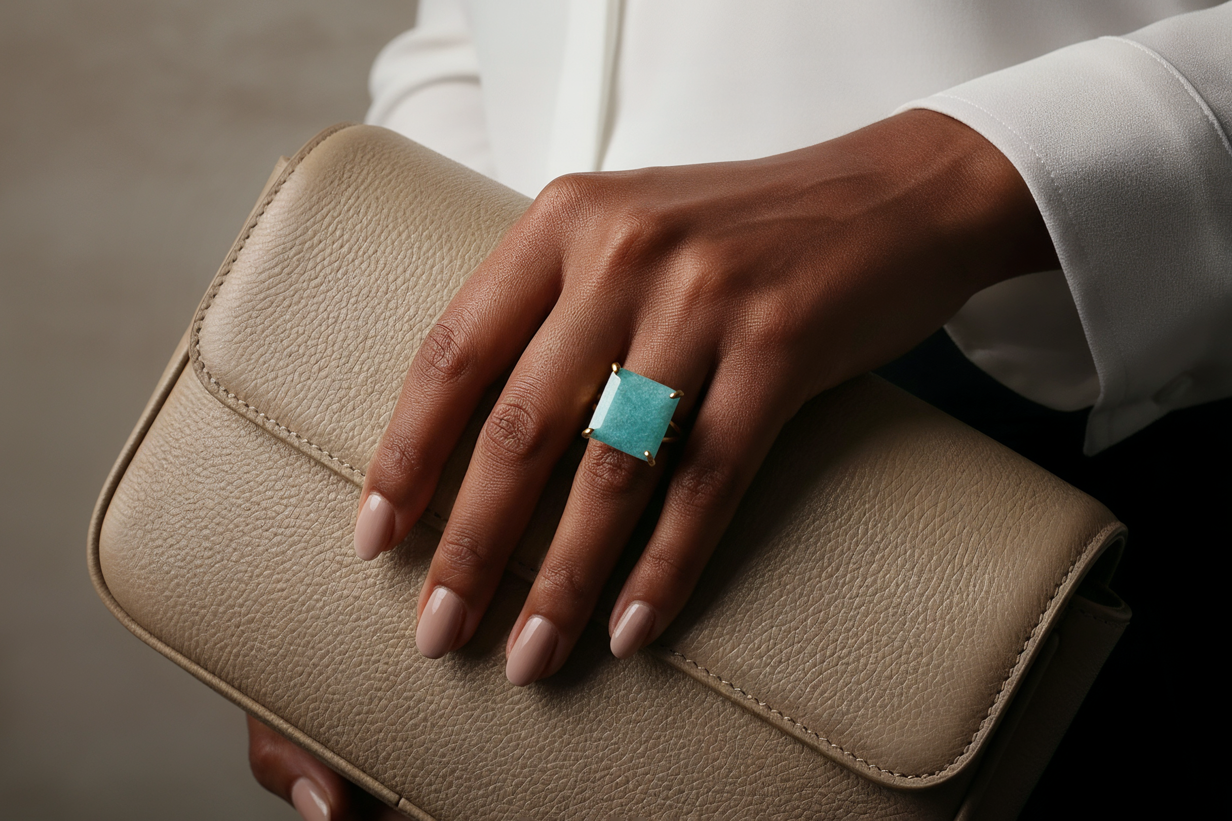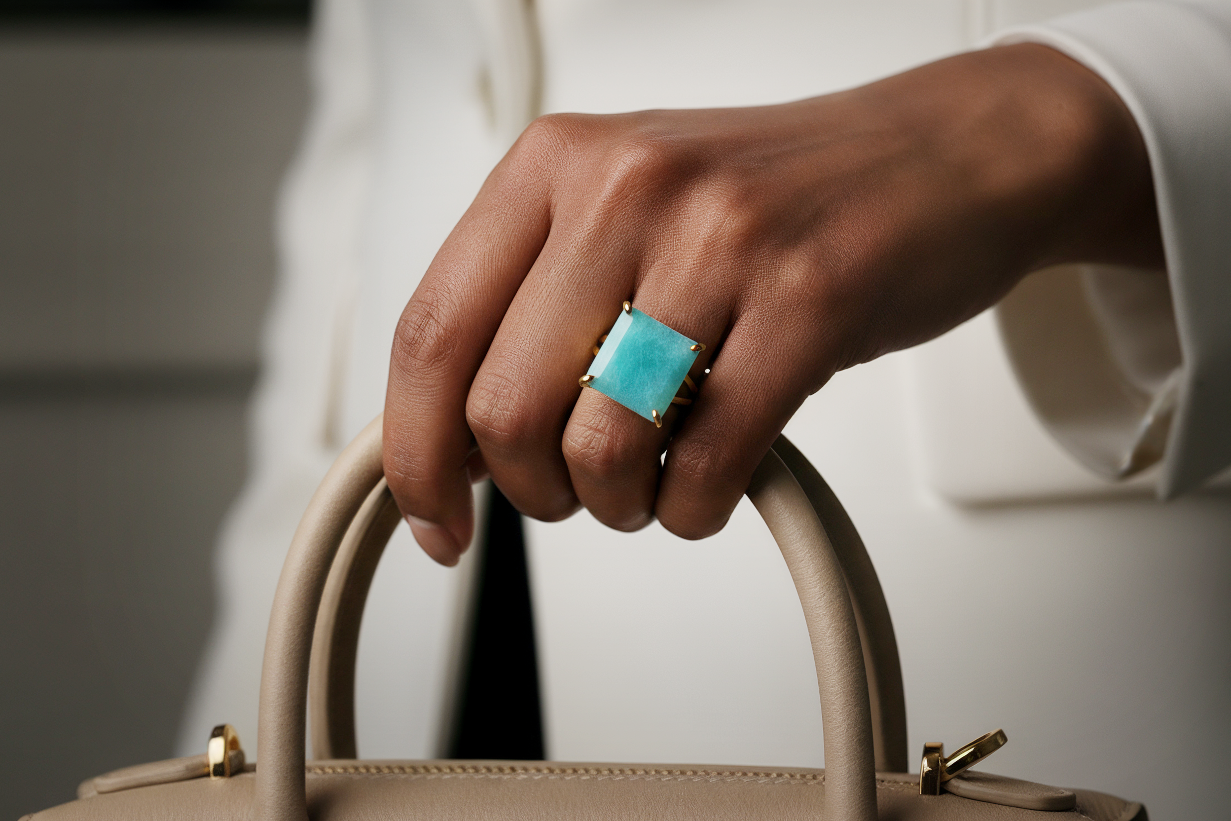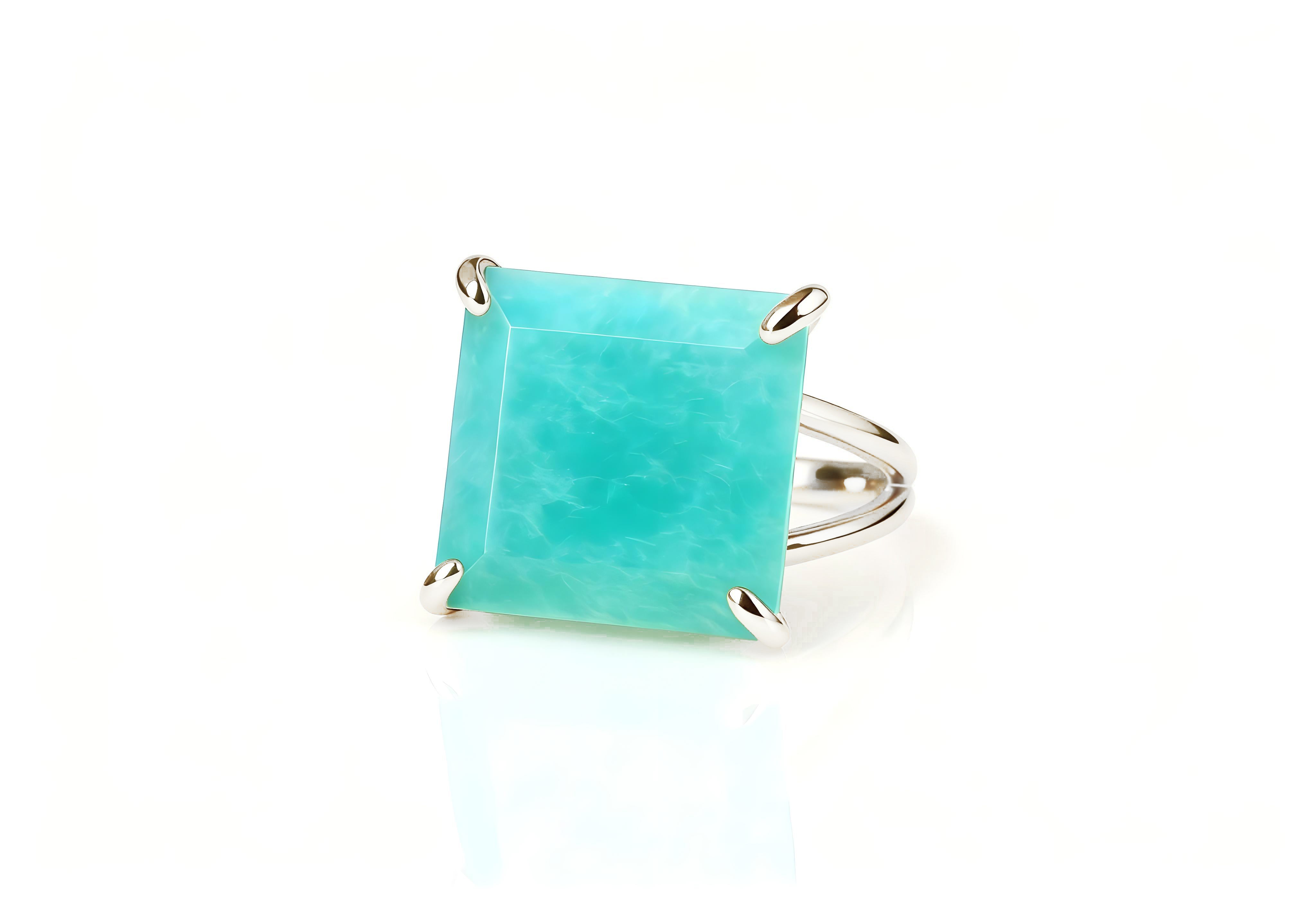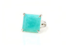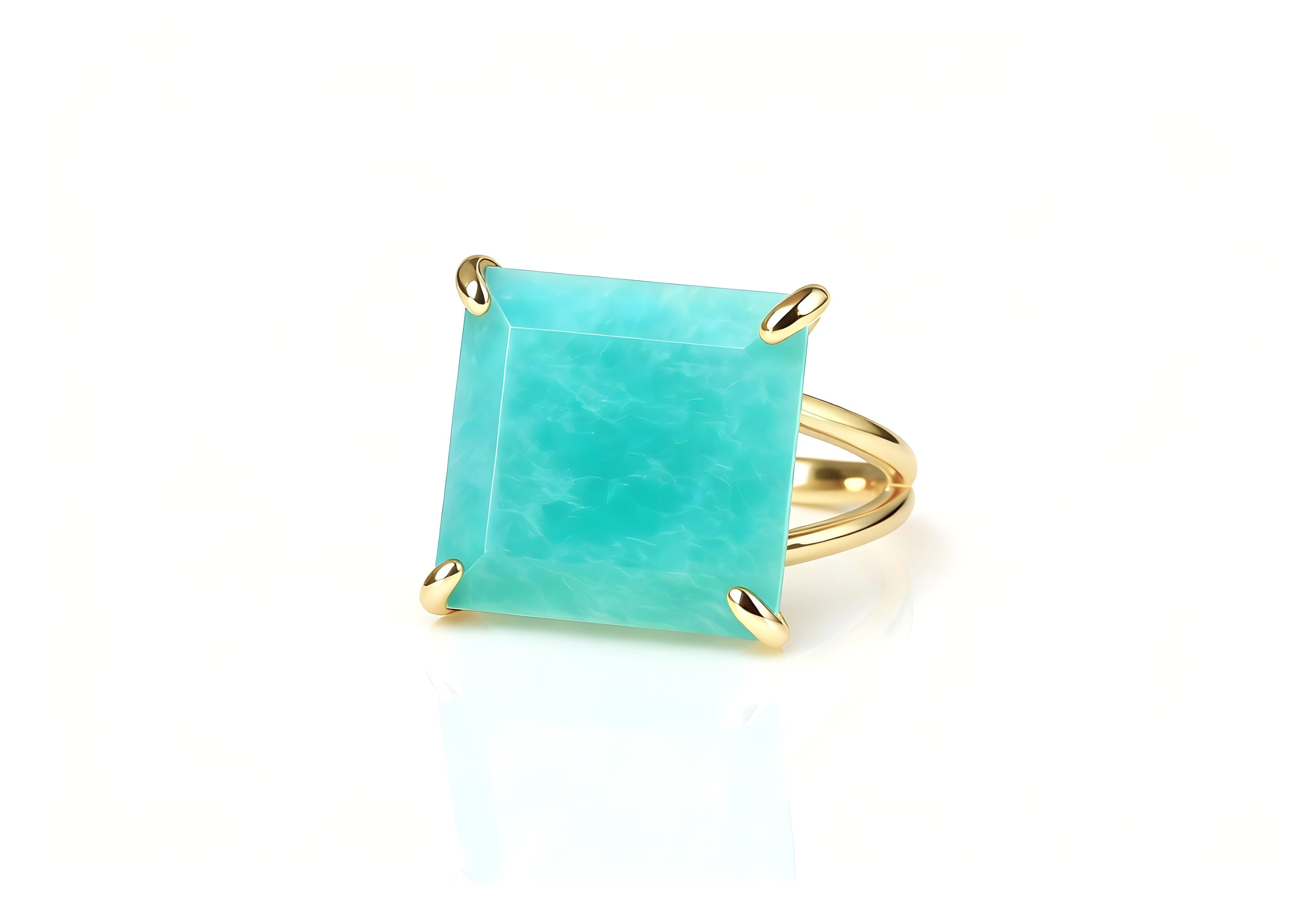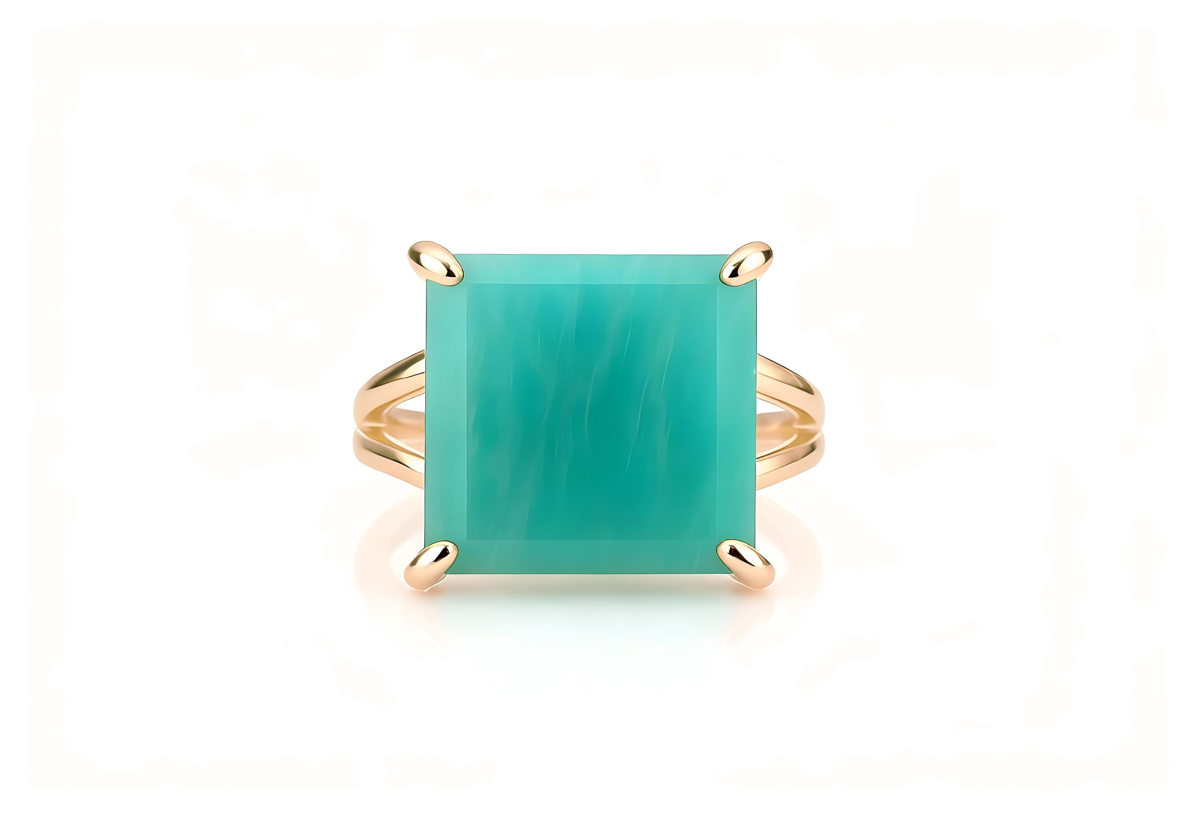 This rose gold amazonite ring features a radiant square-cut gemstone with a soothing turquoise hue. The polished rose gold setting enhances its soft color, creating a warm and modern statement piece. Handcrafted with care, this ring is perfect for those who love bold gemstone jewelry with a refined, feminine touch.