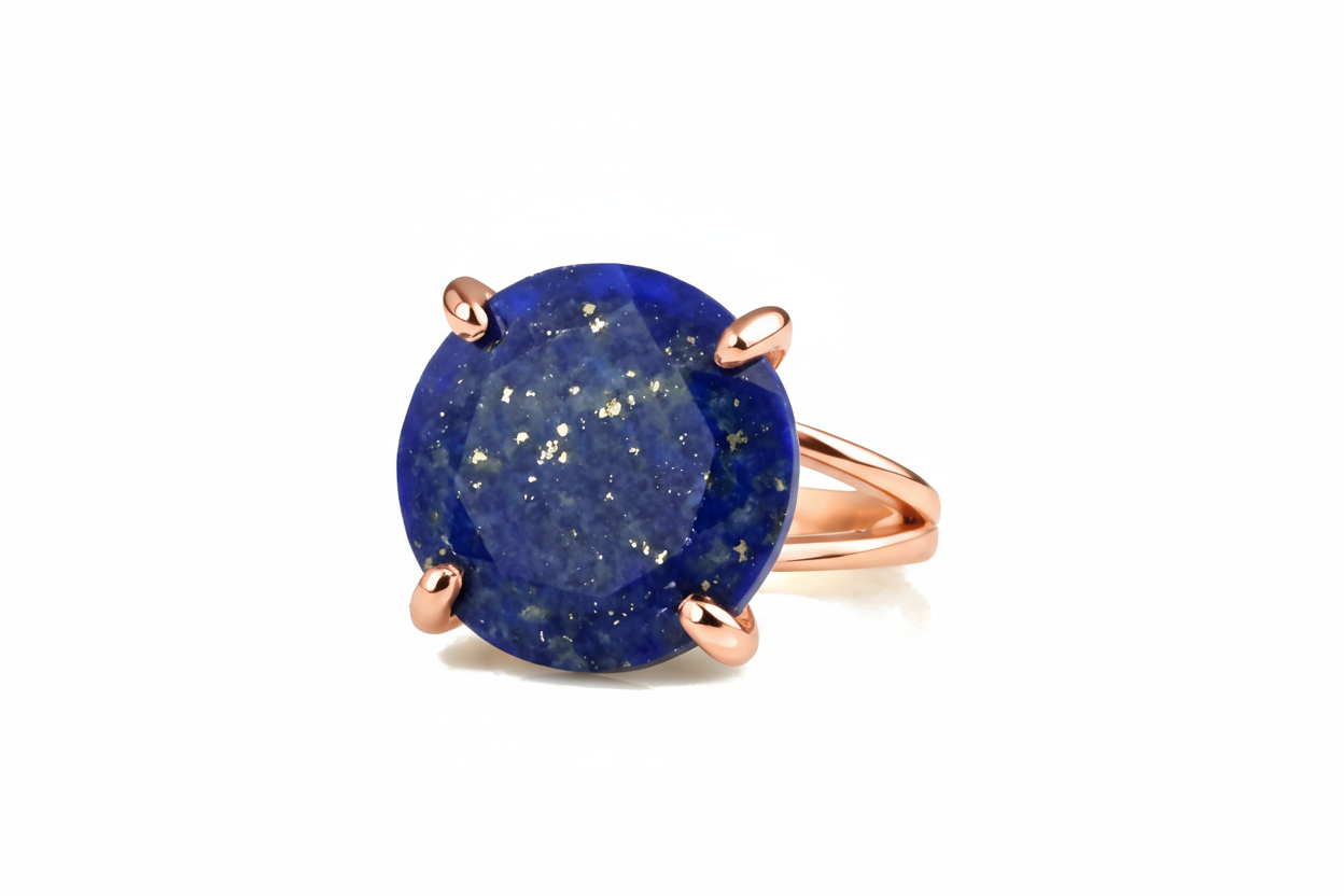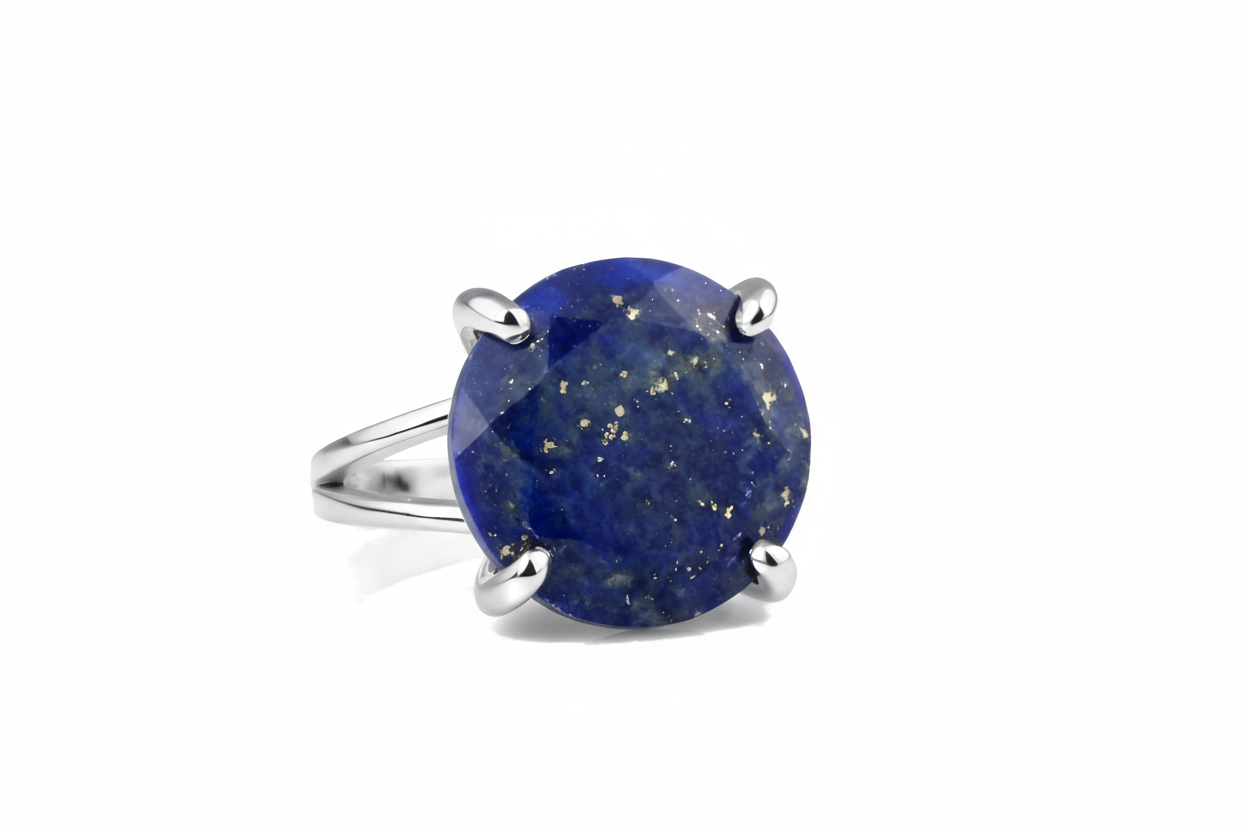 Handcrafted in 925 sterling silver, this lapis lazuli solitaire ring features a deep blue gemstone accented with golden inclusions that reflect the natural beauty of the stone. The faceted round cut sits elegantly on a sleek double band, creating a modern design that’s both strong and graceful. Each ring is made to order, with options to customize the metal and size for a personal touch.