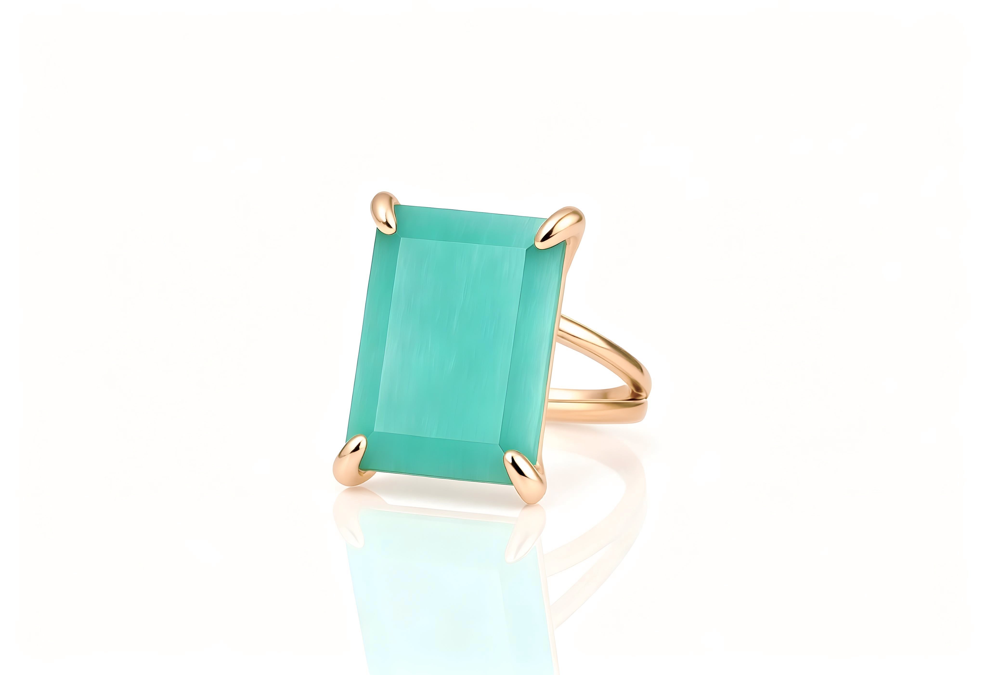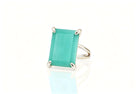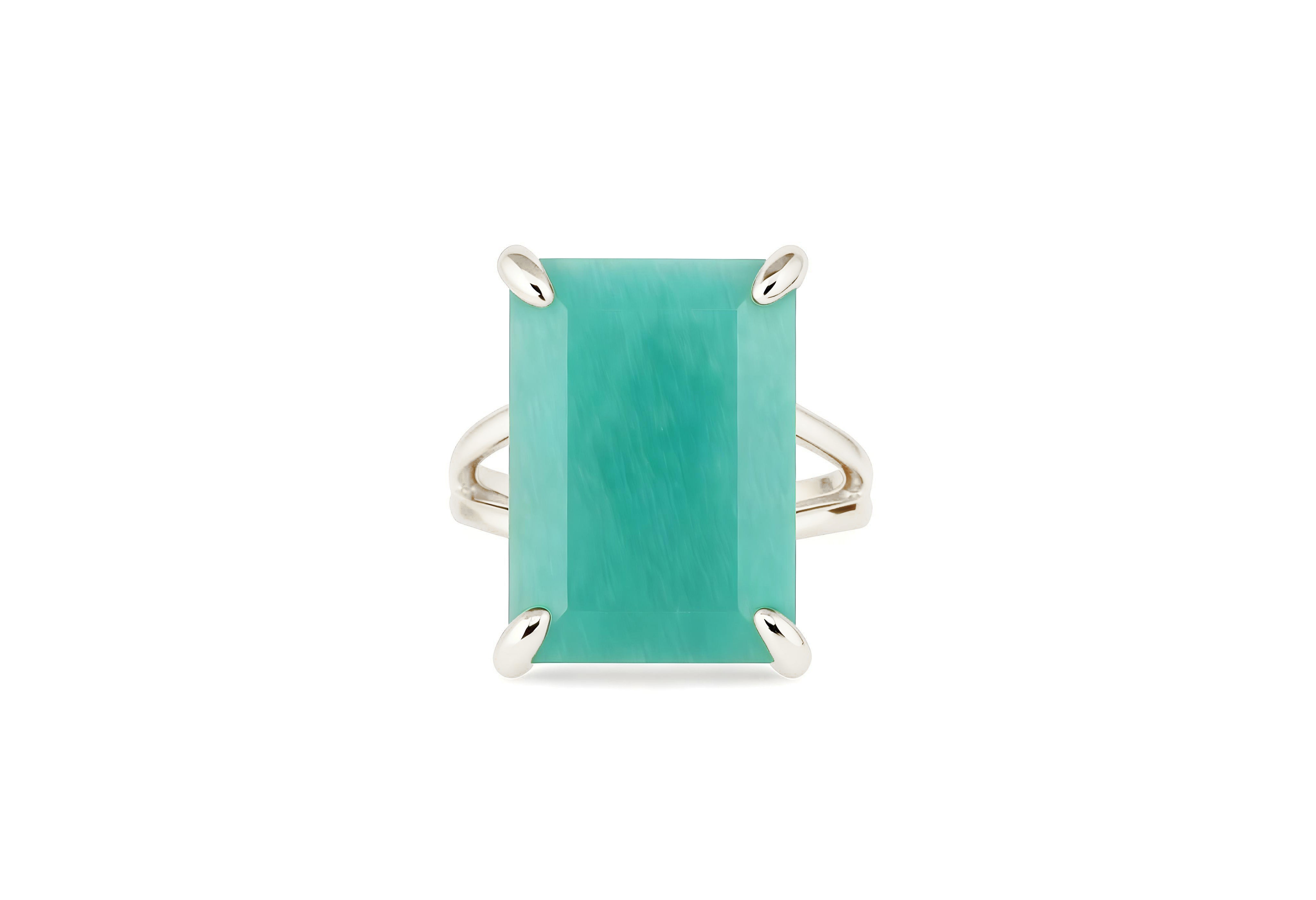 This silver amazonite ring brings a modern edge to timeless gemstone jewelry. Featuring a rectangular cut blue-green amazonite, it’s set in a sleek sterling silver band that enhances the stone’s calm and luminous tone. The handcrafted prong setting provides durability while keeping the look refined — a stunning ring for any outfit or occasion.
