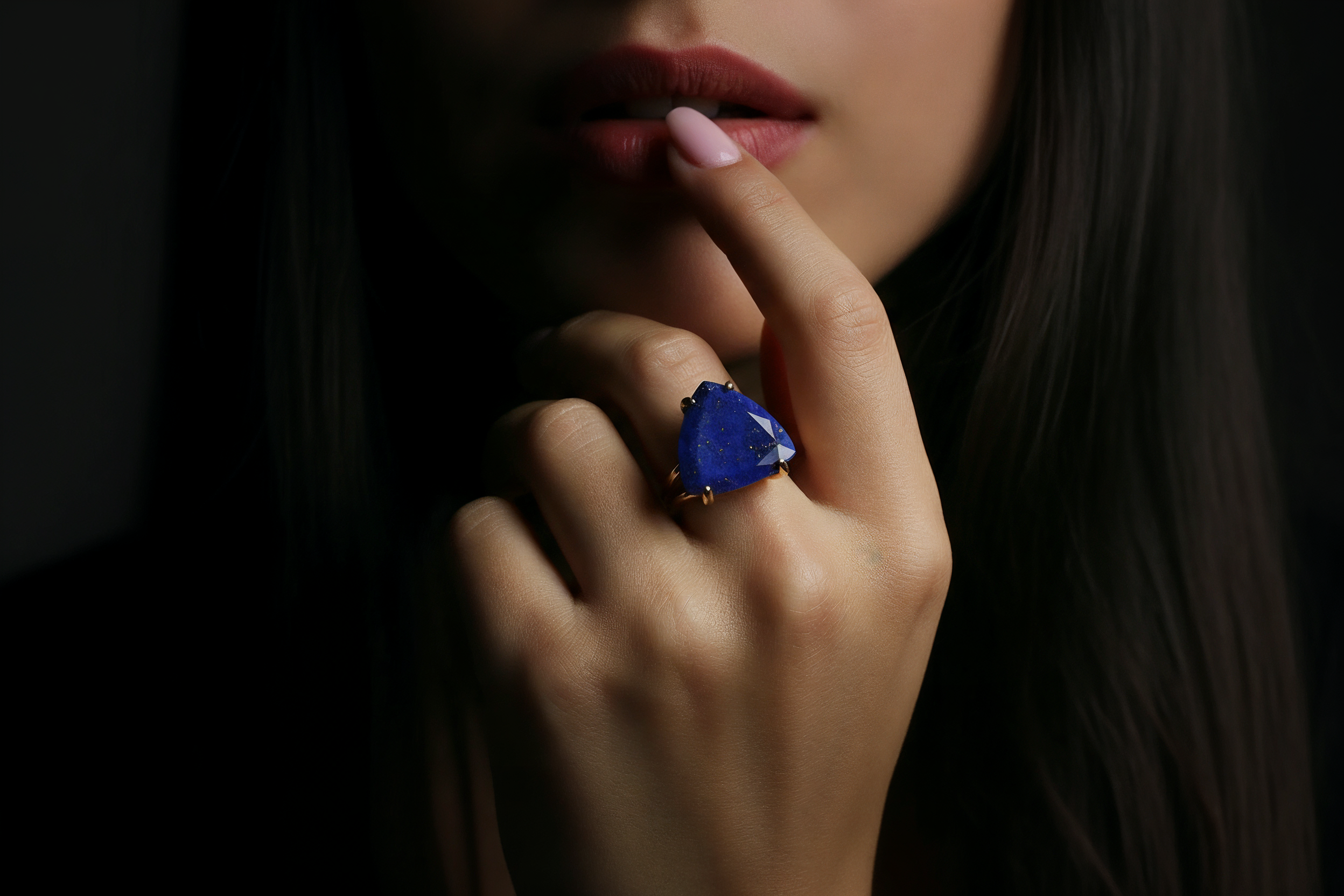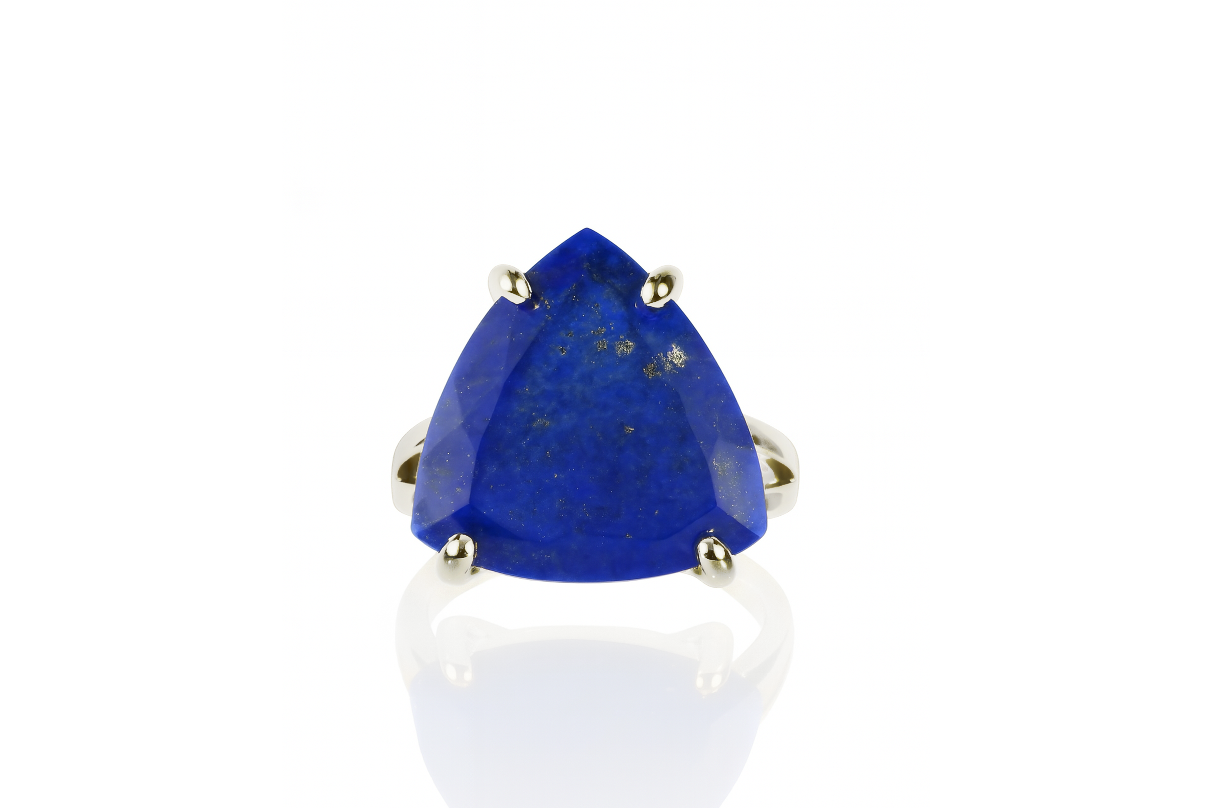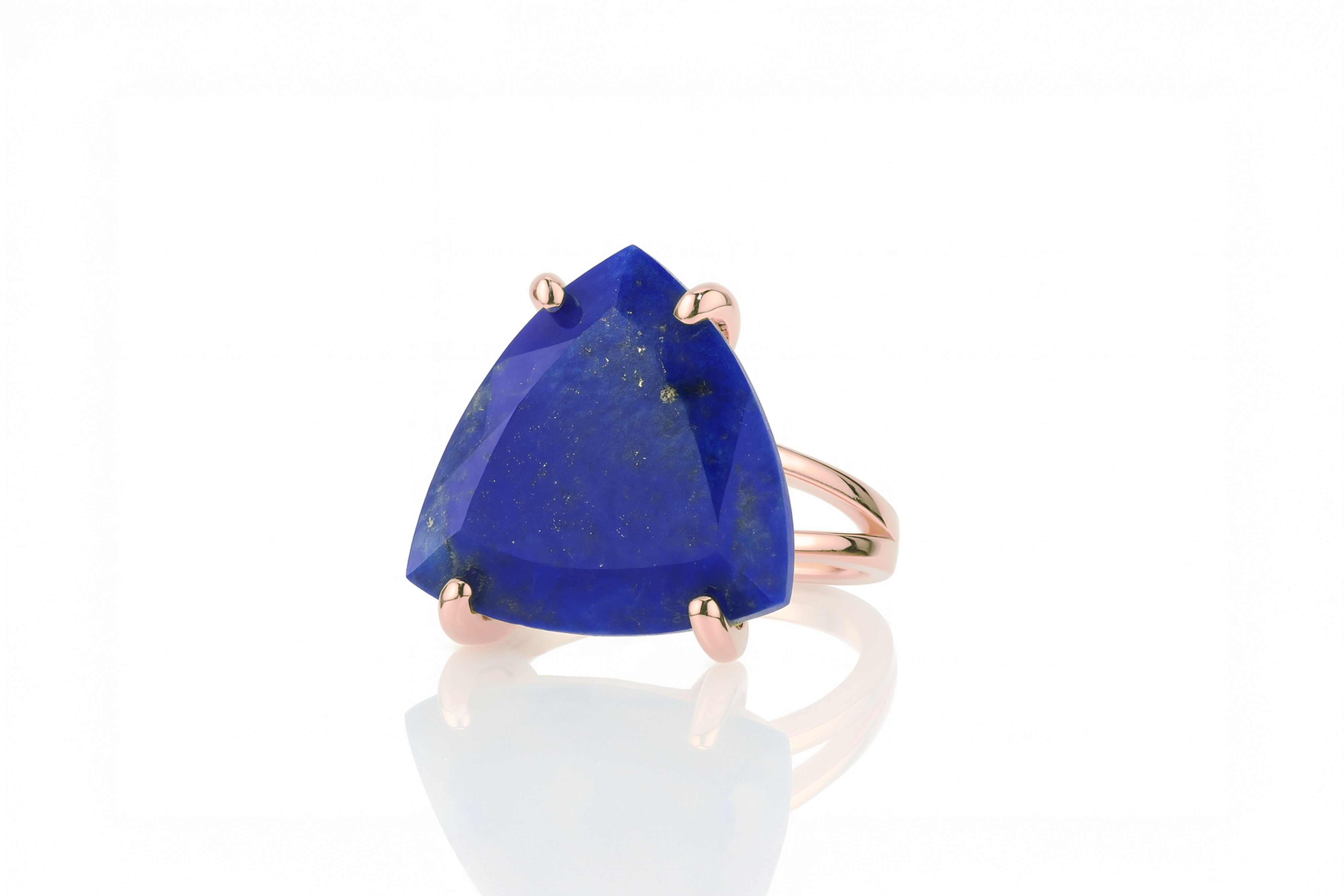 This striking triangular lapis lazuli ring showcases a faceted trillion-cut gemstone in a polished 925 sterling silver band. The deep royal blue hue with natural golden specks gives each piece a unique, celestial charm. Ideal for September birthdays or anyone who loves bold, modern gemstone jewelry.