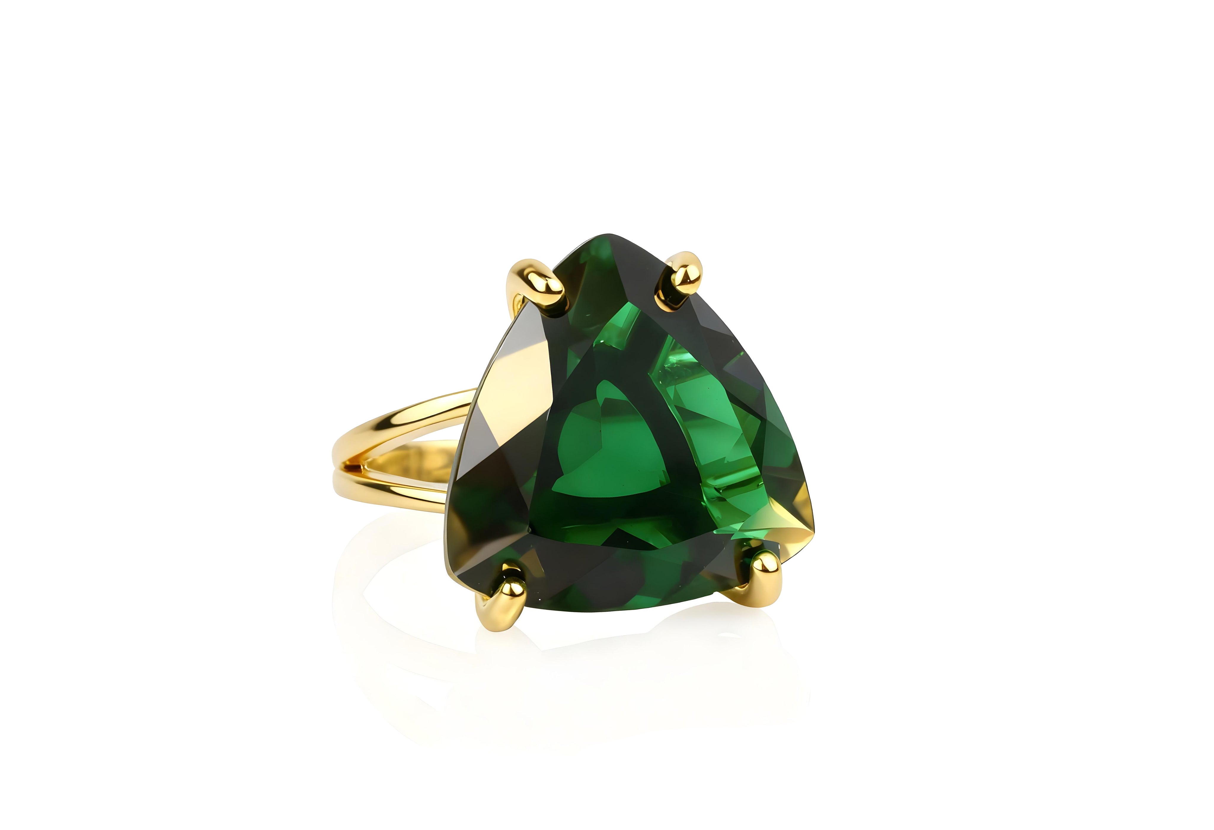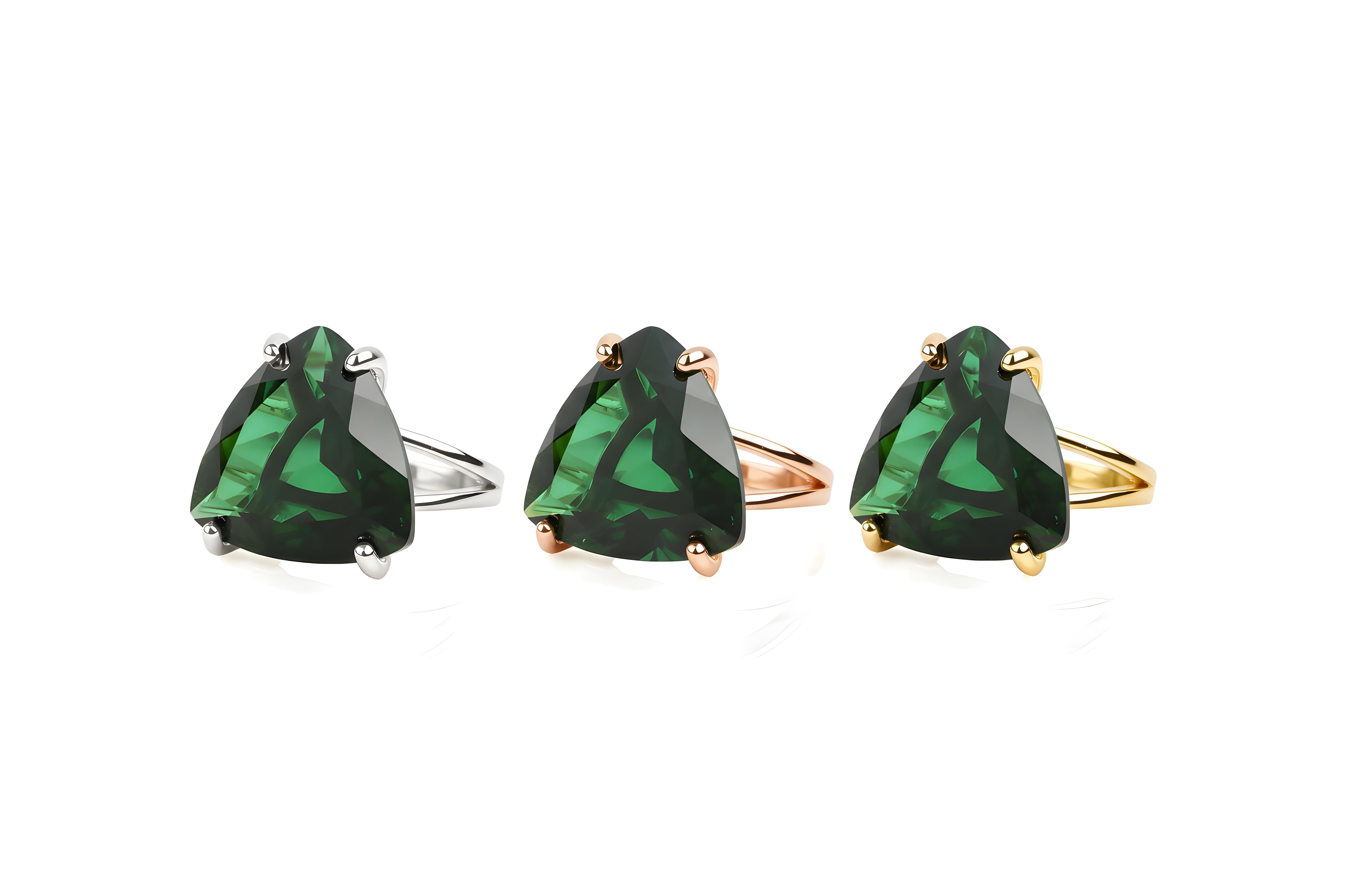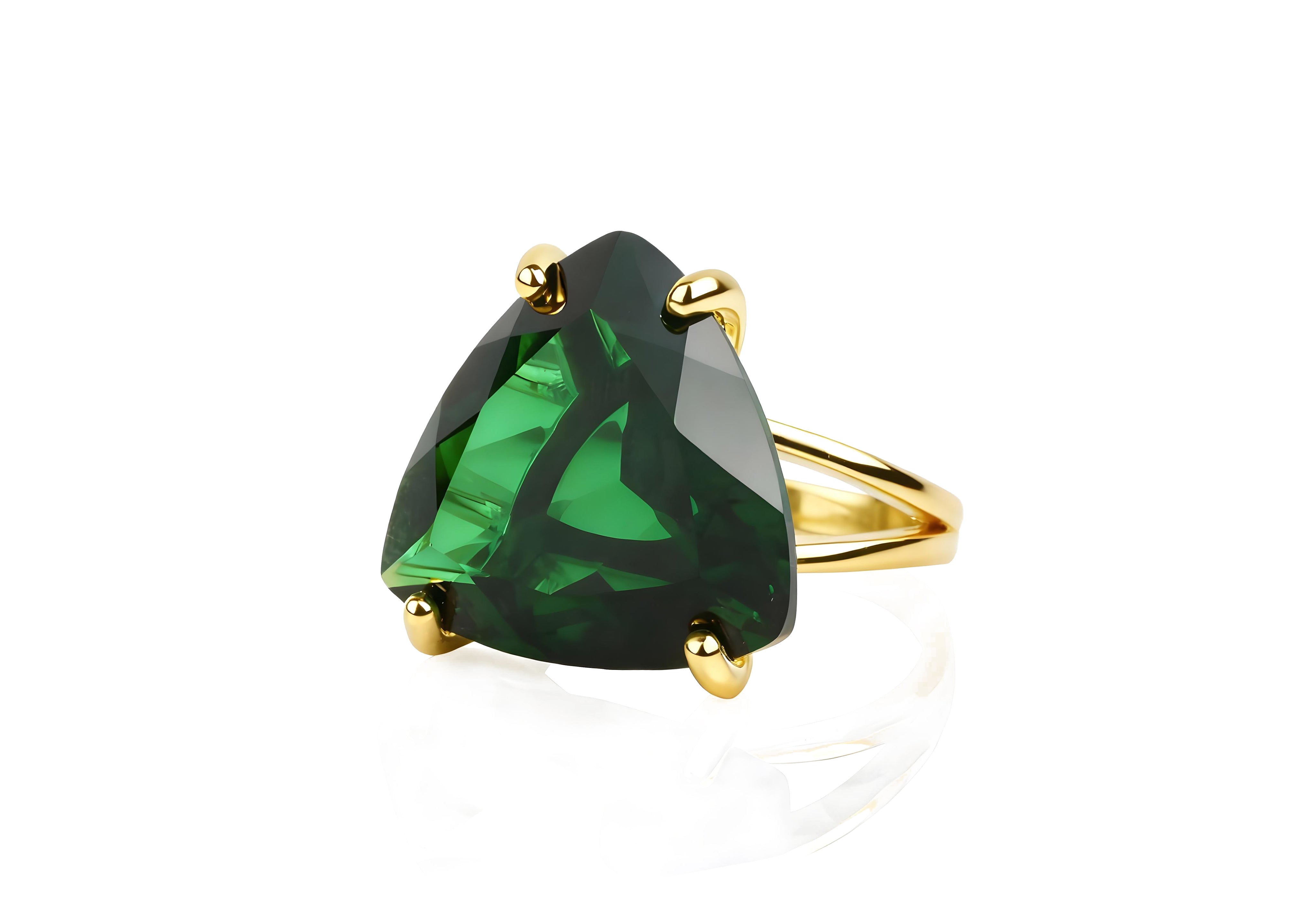 This striking trillion-cut emerald ring brings together geometric beauty and timeless charm. Set in polished gold, the vivid green gemstone shines from every angle, symbolizing May’s birthstone and renewal. Perfect as a statement piece or meaningful gift, it combines a bold triangular silhouette with the warmth of gold, making it an unforgettable choice for any occasion.