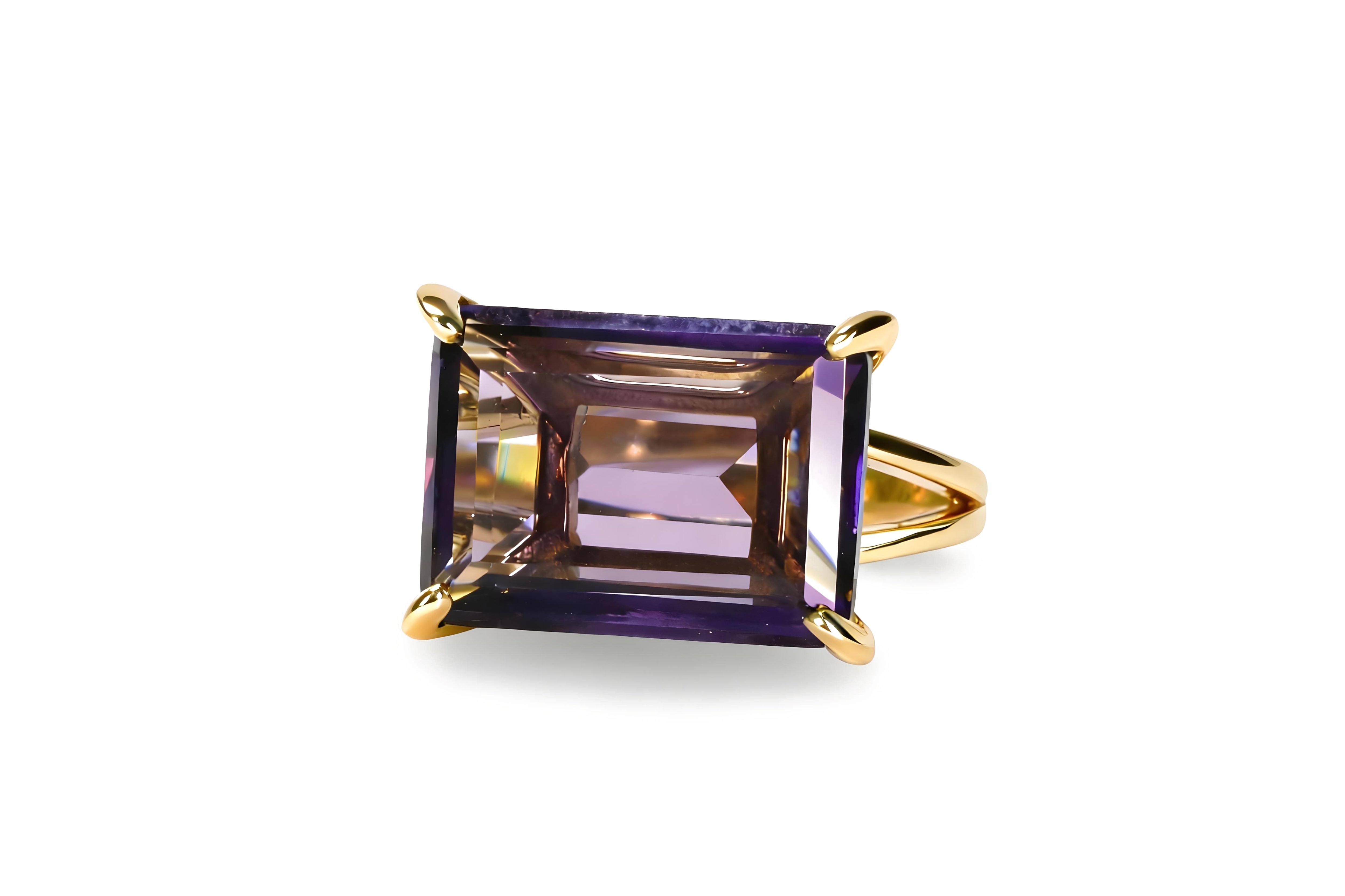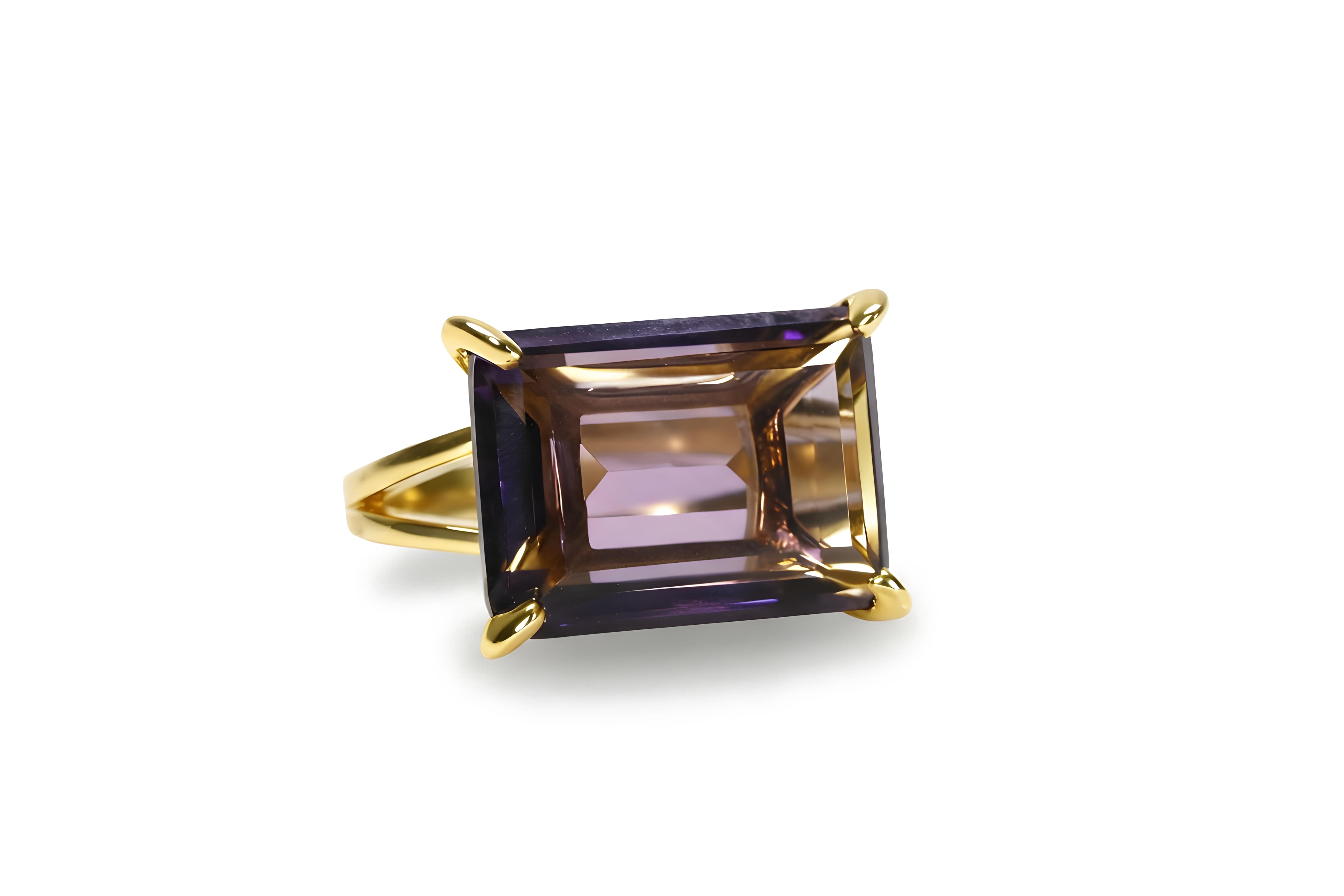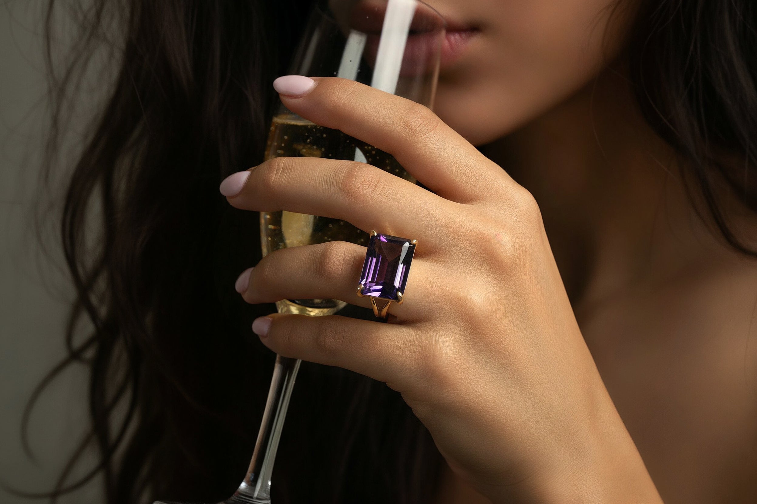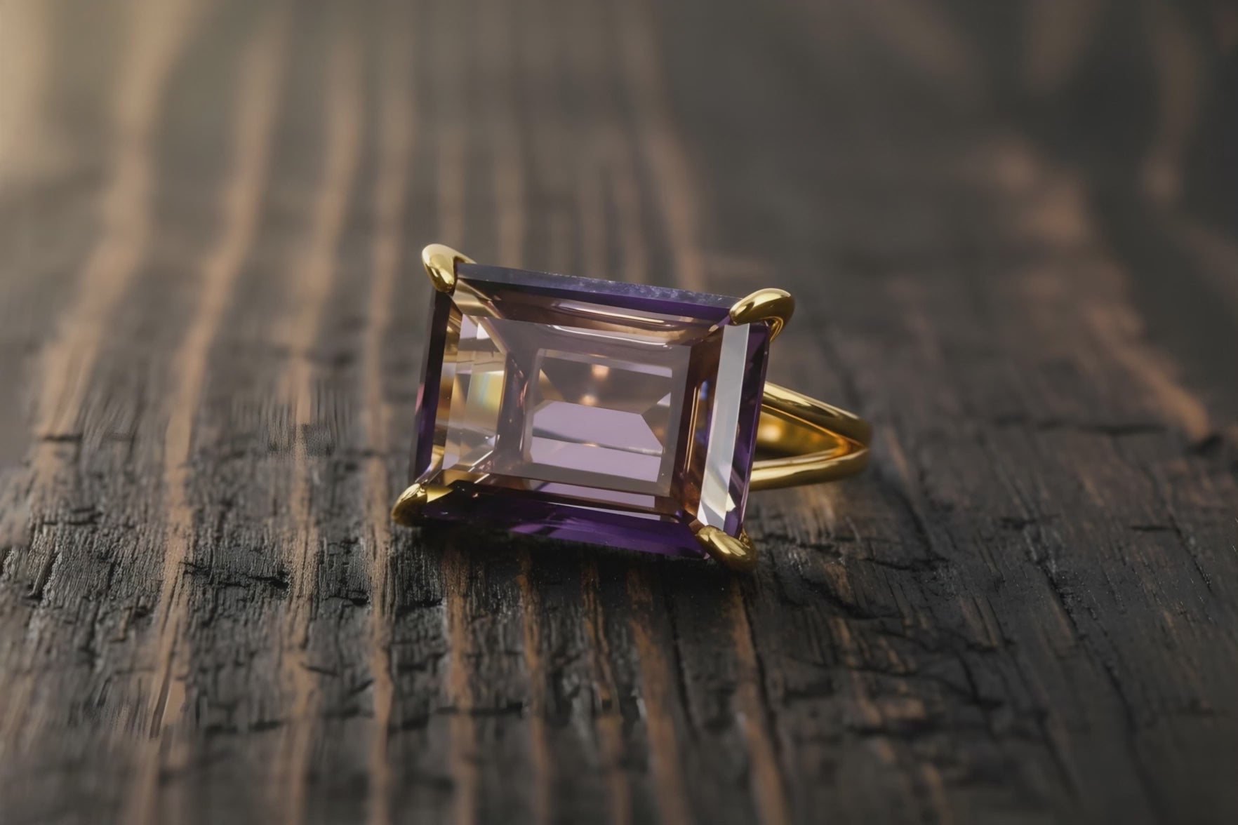 This handcrafted 14k gold ring showcases a radiant rectangular-cut amethyst, symbolizing balance and inner strength. The rich purple gemstone reflects the spirit of February’s birthstone, enhanced by the warm glow of gold. Its minimalist yet bold design makes it a perfect statement ring for daily wear or special occasions, embodying timeless sophistication and harmony.