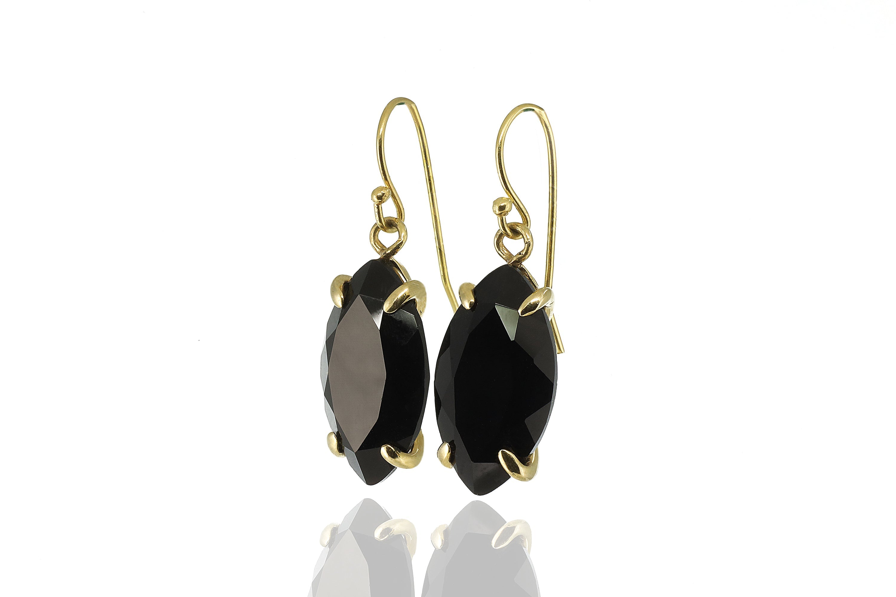 Embrace the dramatic allure of these marquise black onyx earrings. The eye-catching onyx gemstone is beautifully contrasted by the warmth of the long gold setting, creating a stunning visual effect. The elongated design adds a dash of elegance, while the gold dangle enhances movement for a dynamic finish. Whether you're dressing up for a special event or elevating your everyday look, these earrings are sure to make a lasting impression.