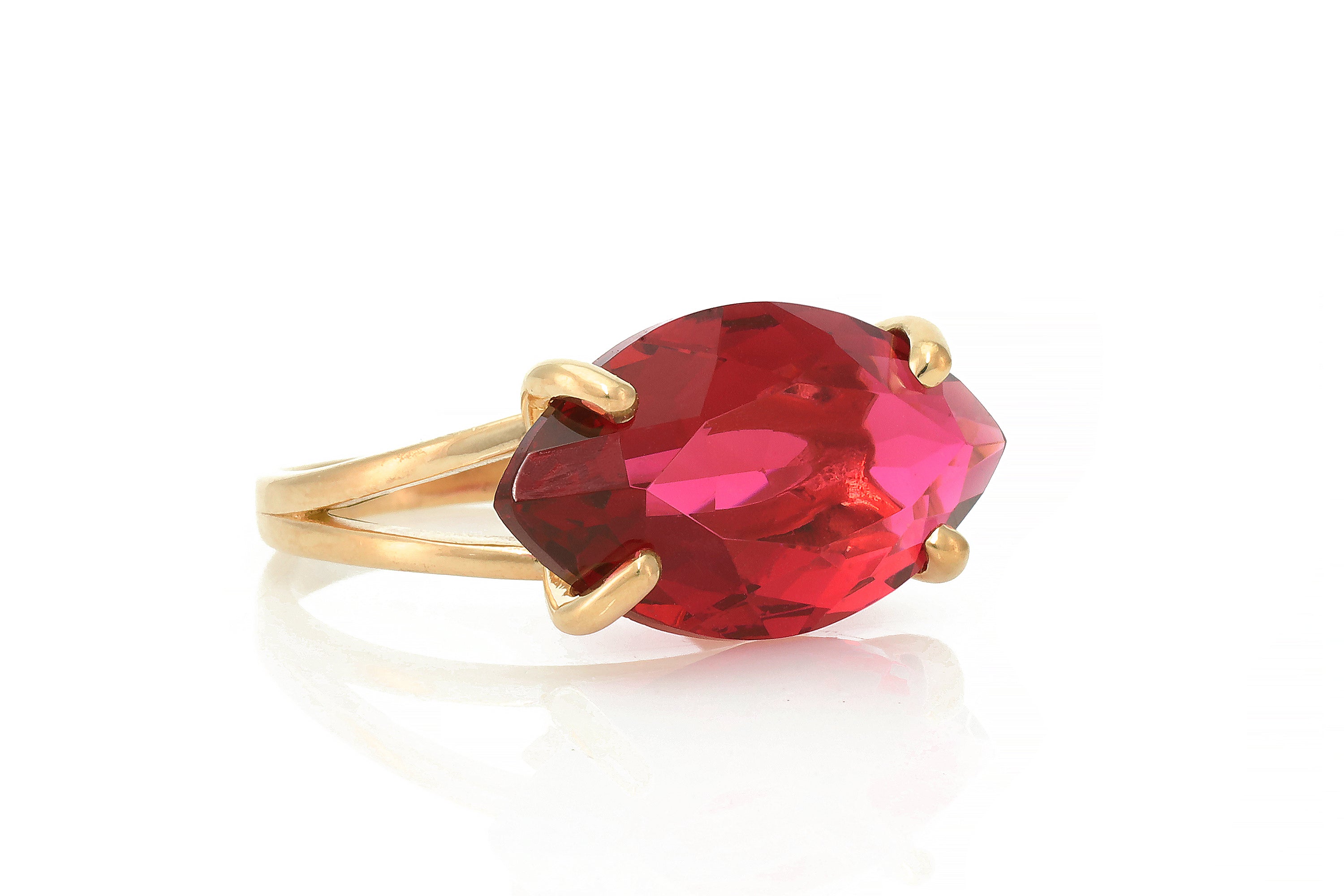 This horizontal marquise-cut pink tourmaline ring radiates bold color and modern allure. Handcrafted in 18k gold vermeil, it features a wide gemstone that shimmers with every movement. The rich pink tone of the faceted stone is perfectly framed by a mirror-shine gold finish, creating a striking contrast. Ideal for October birthdays or anyone drawn to vibrant, eye-catching jewelry, this ring makes a stunning cocktail piece or gift. Its elegant silhouette and double band structure balance sophistication with everyday versatility.
