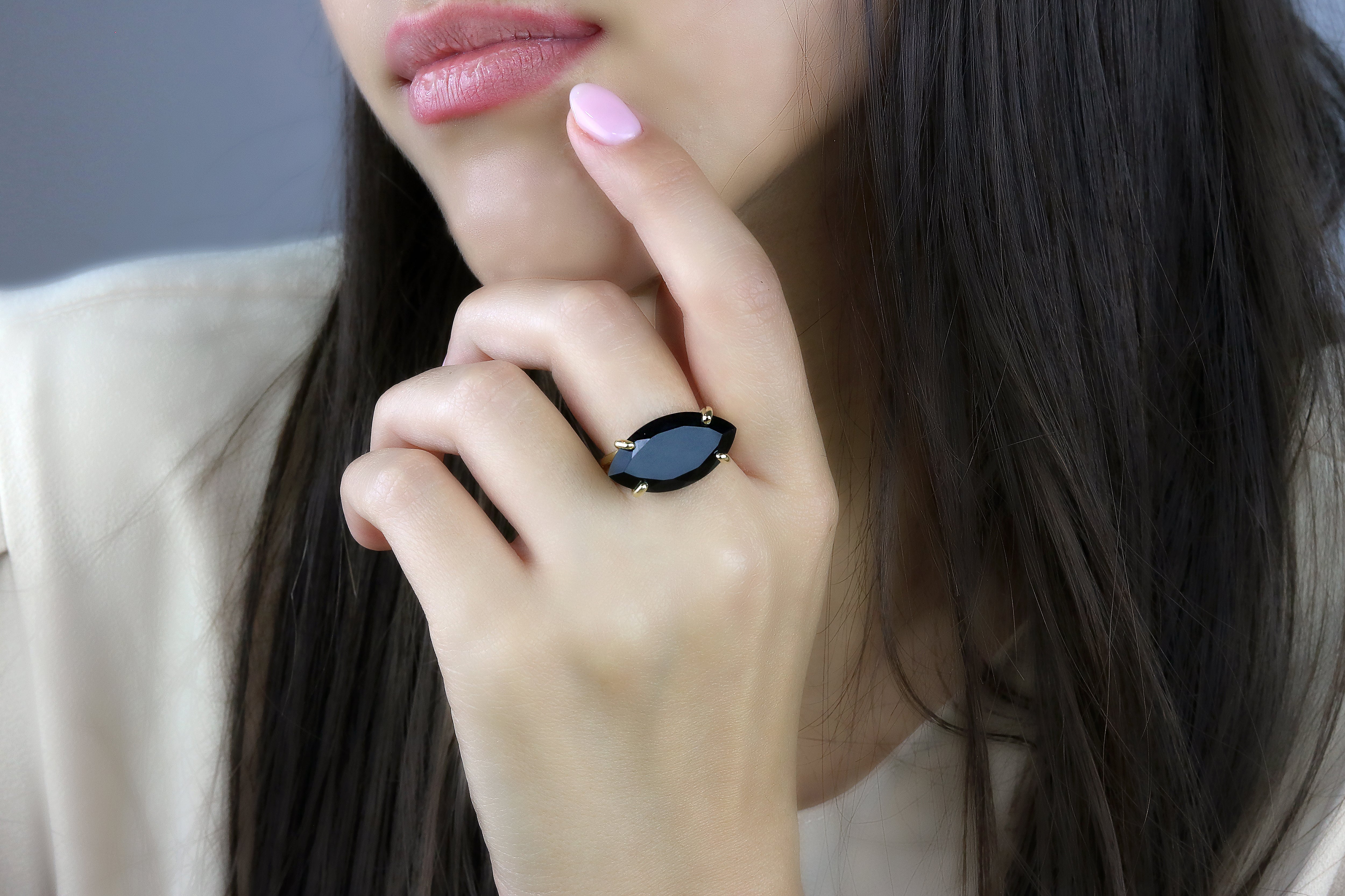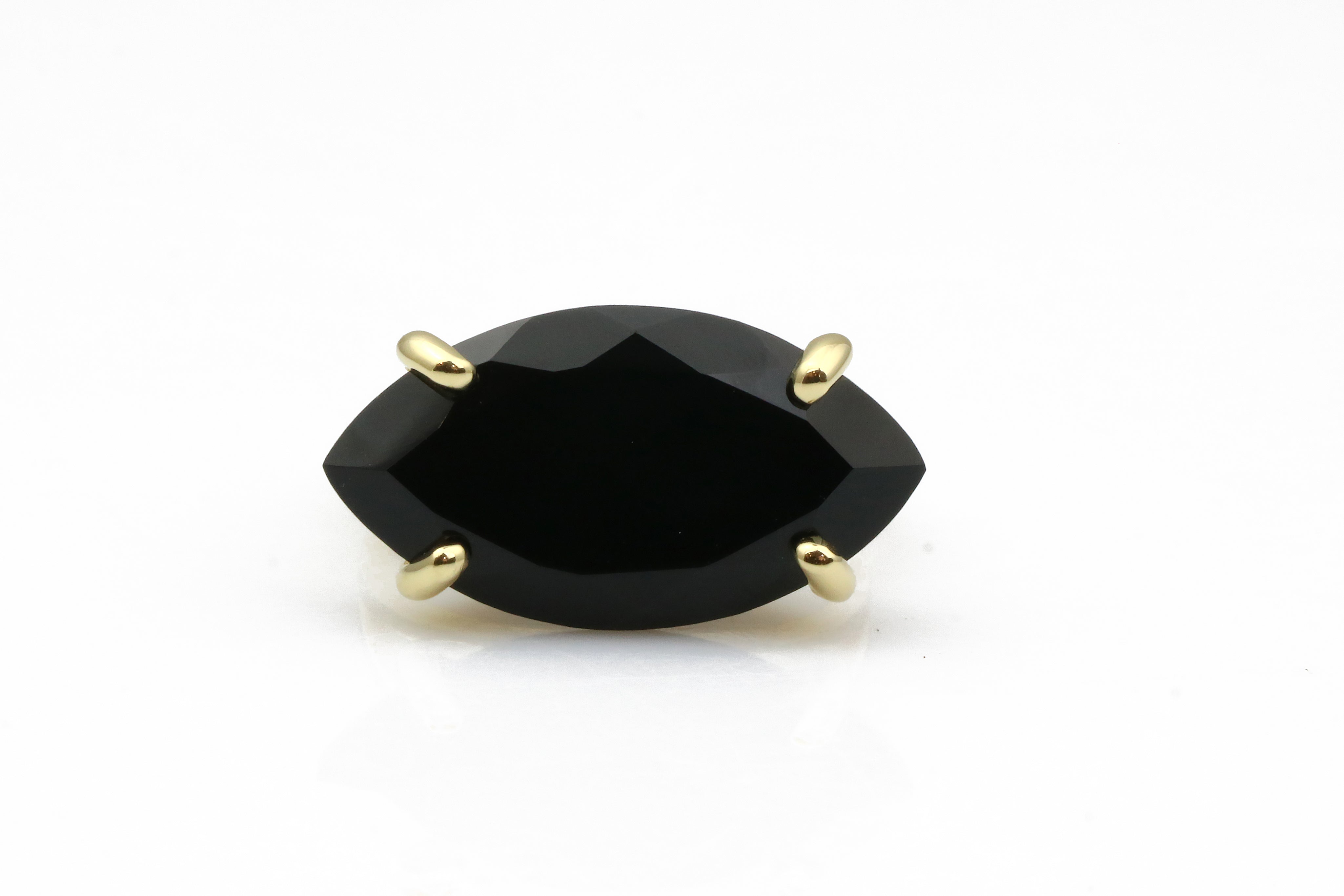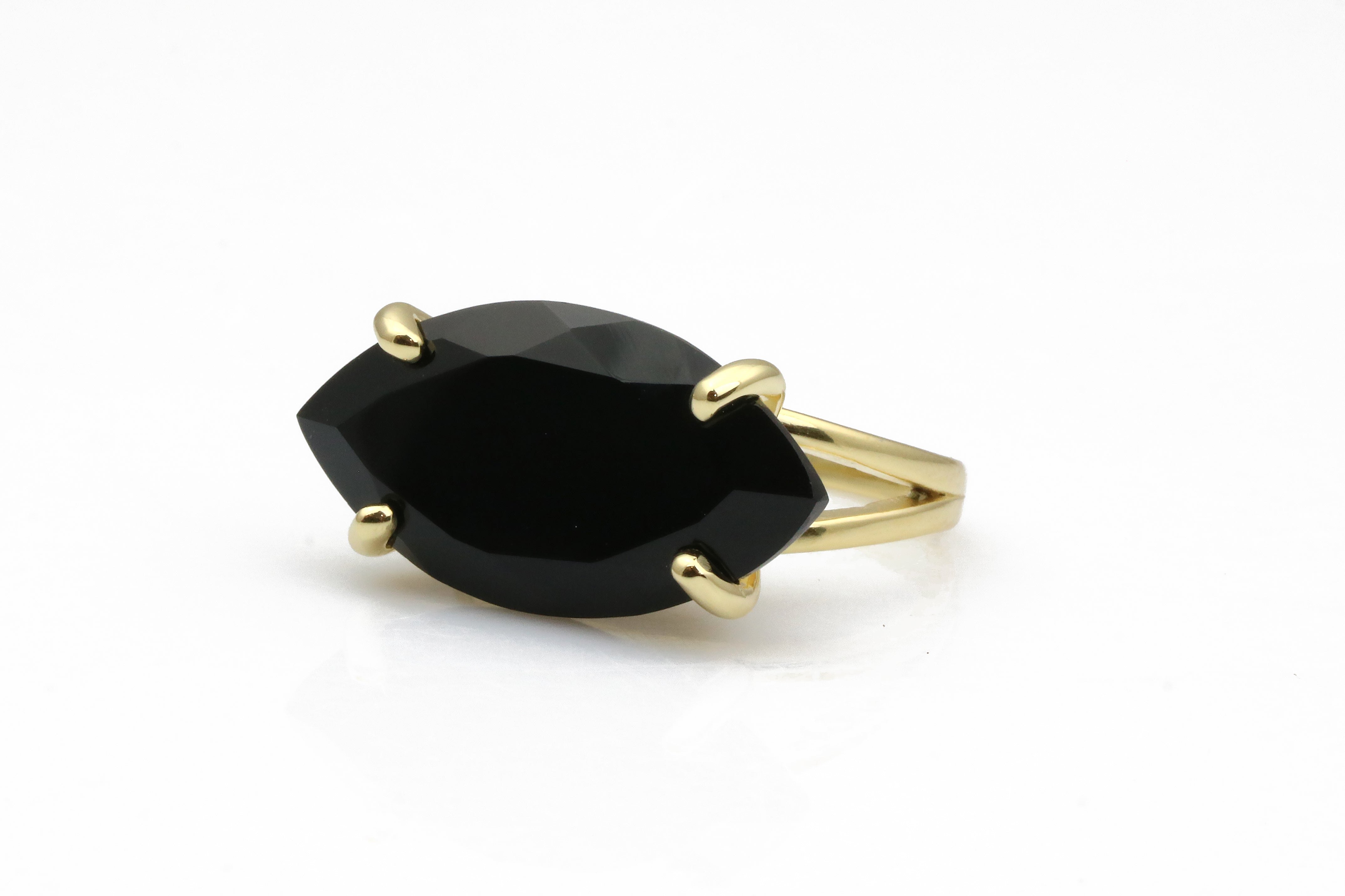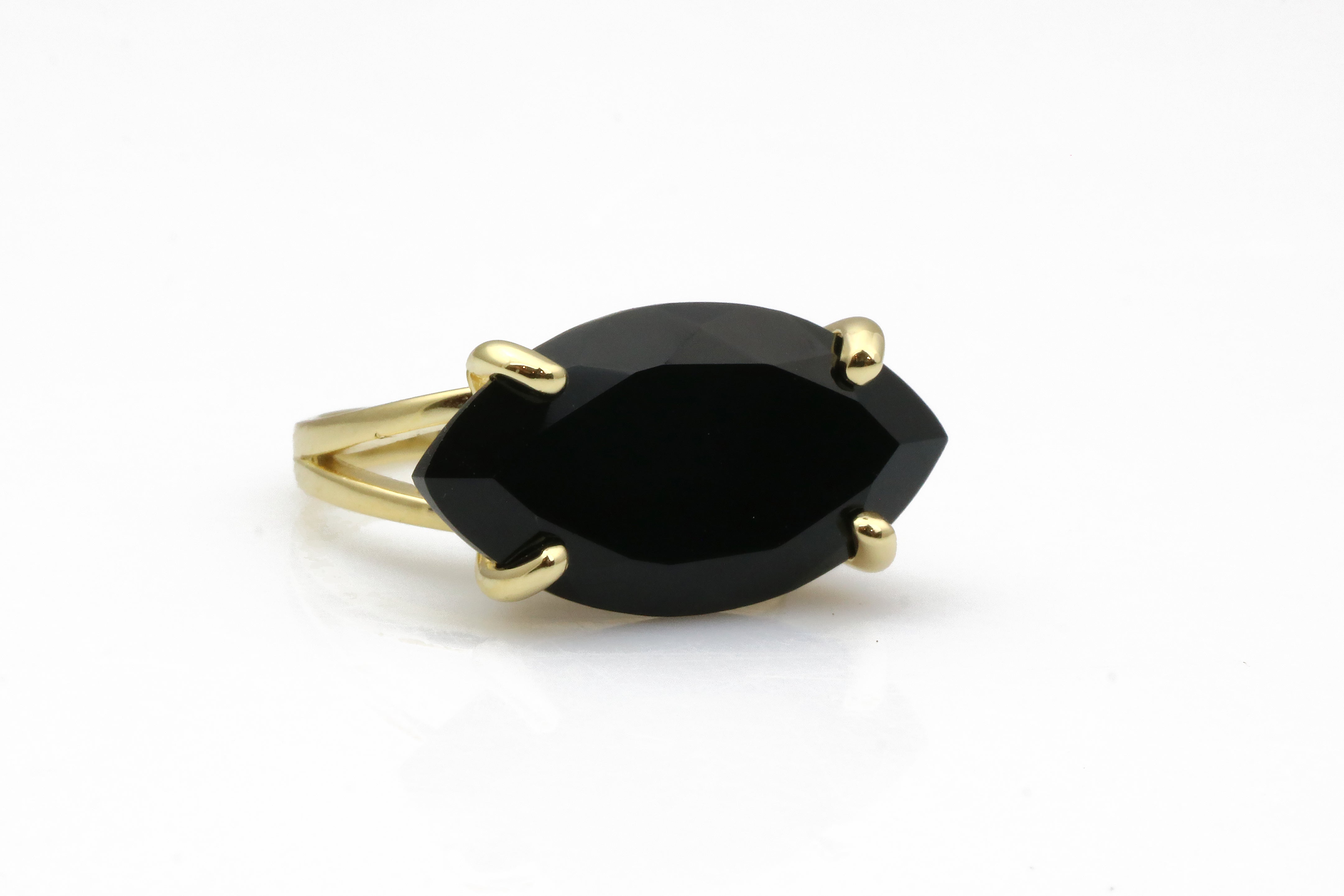 This black onyx marquise ring is crafted in polished gold, featuring a faceted semiprecious gemstone with a sleek elongated silhouette. The deep black tones of onyx resemble the bold look of black diamonds, making it a striking and versatile ring. Handcrafted with care, this gemstone ring is perfect as a cocktail statement piece, a daily wear accessory, or a meaningful gift. Elegant yet modern, it’s a timeless addition to any jewelry collection.