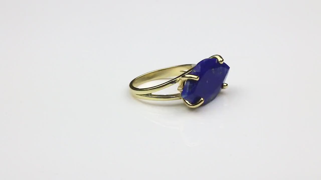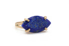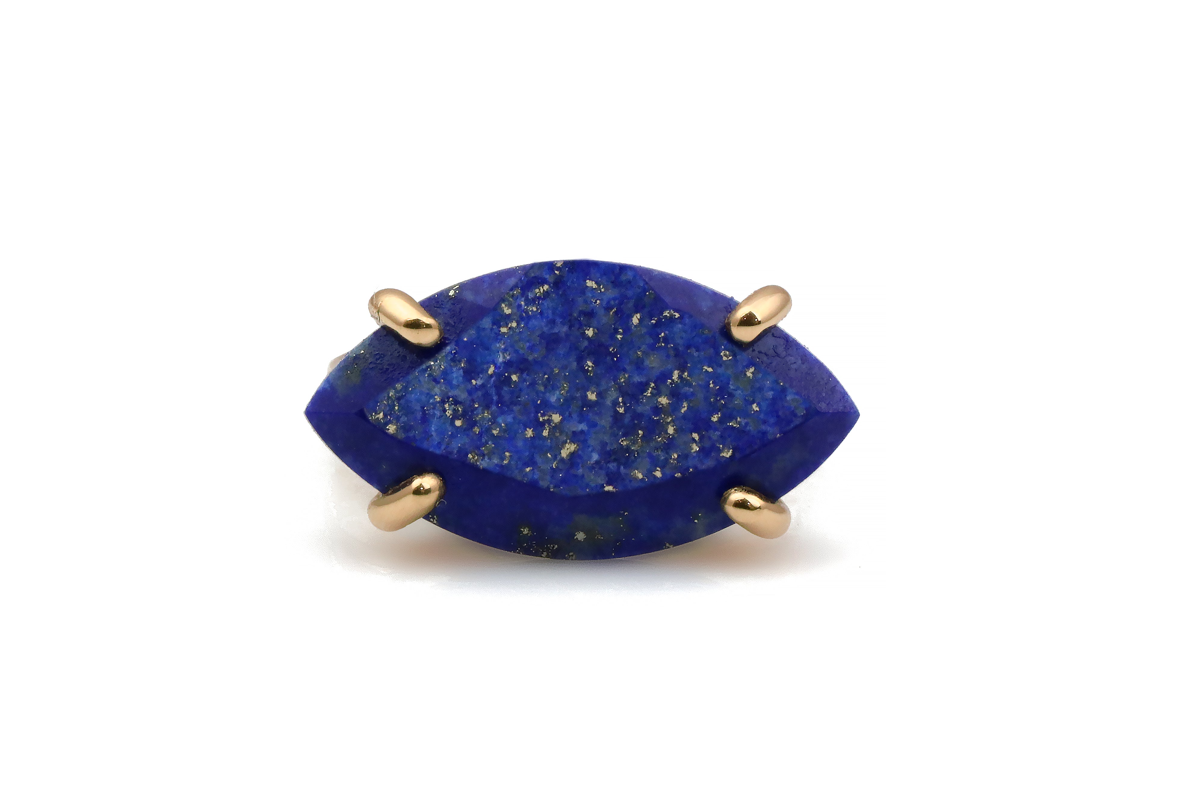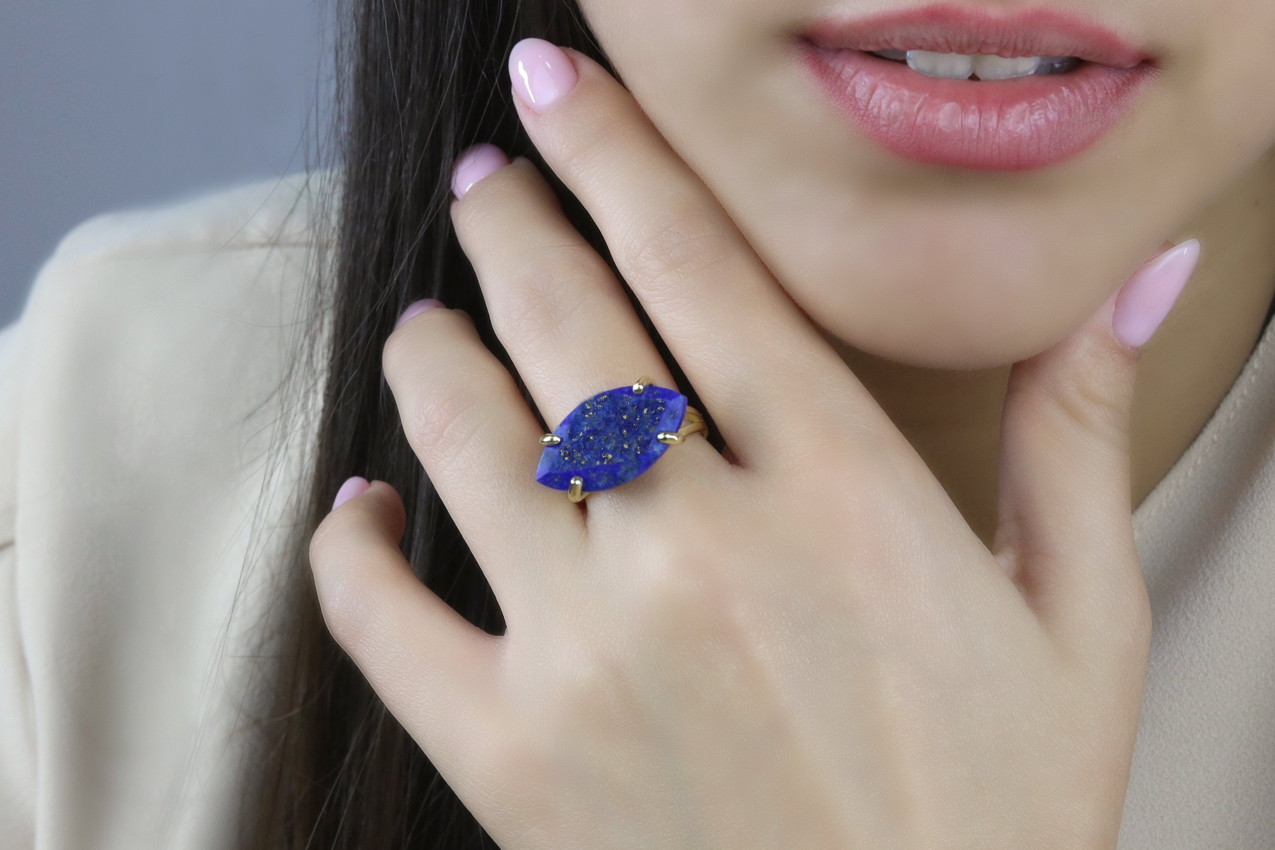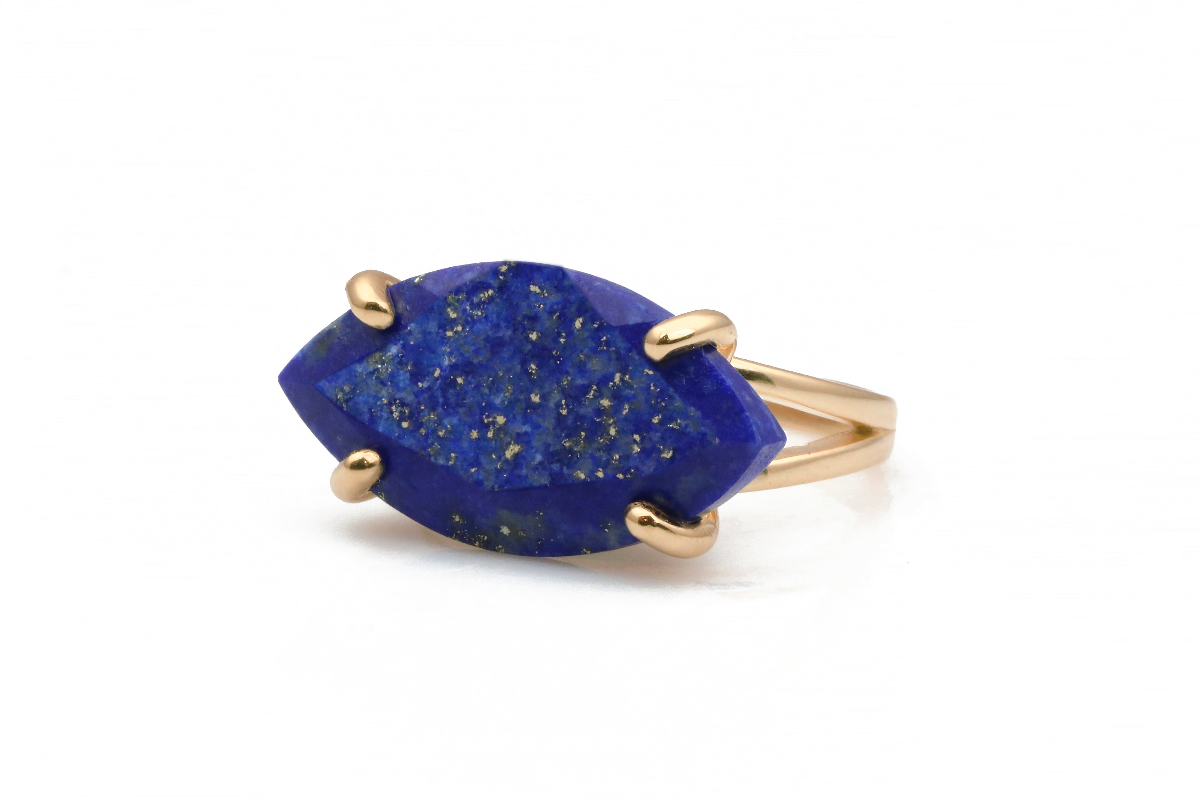 A vibrant marquise-cut lapis lazuli gleams with golden pyrite sparkles, elegantly set in polished rose gold. This handmade ring celebrates September’s birthstone with a perfect blend of sophistication and natural allure. Designed for daily wear or gifting, it’s a striking piece that complements any style.