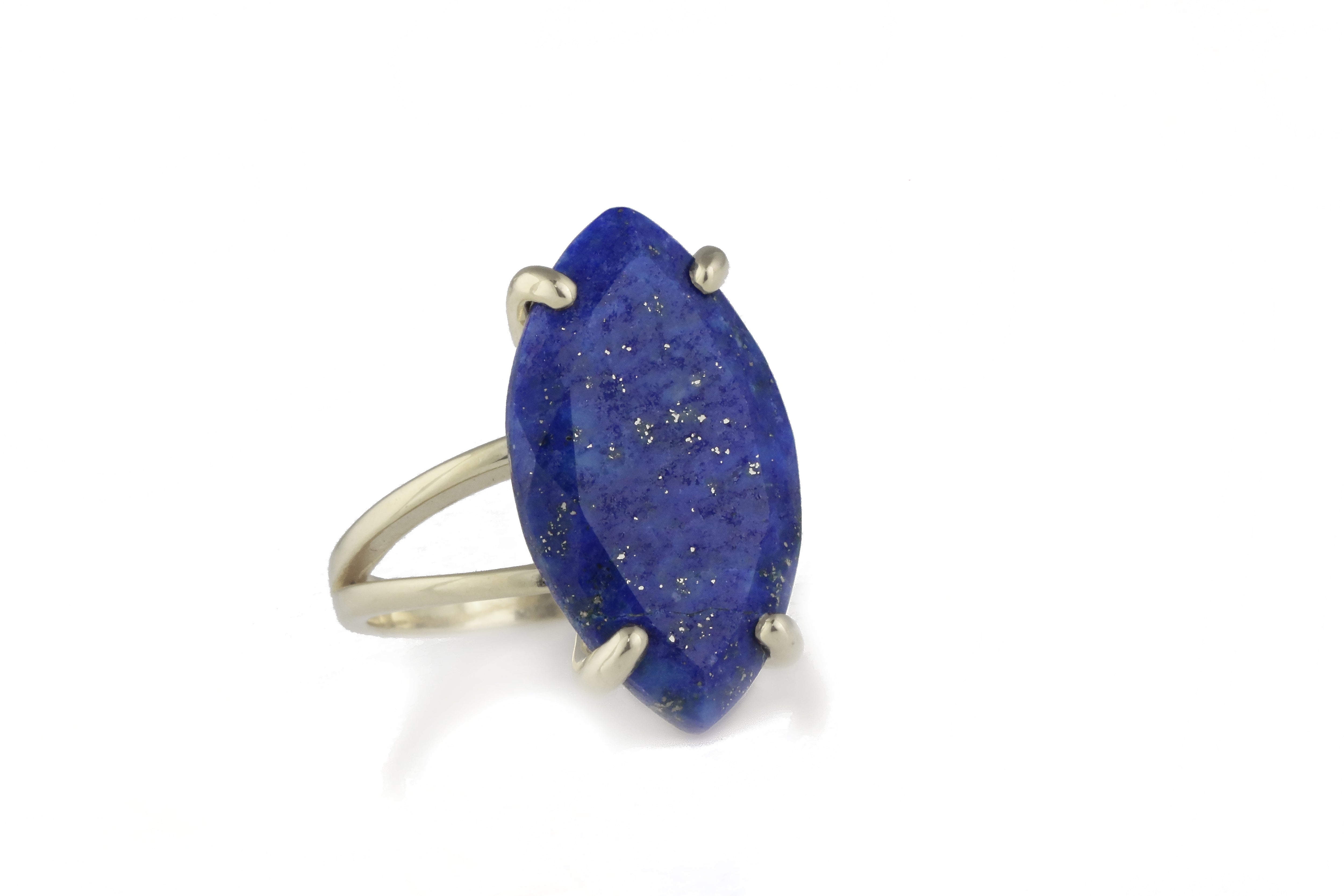A beautifully faceted marquise-cut lapis lazuli shines with deep celestial blue tones and natural golden flecks, cradled in a polished 925 sterling silver setting. Elegant and bold, this statement piece captures the essence of September’s birthstone with refined simplicity and timeless style.