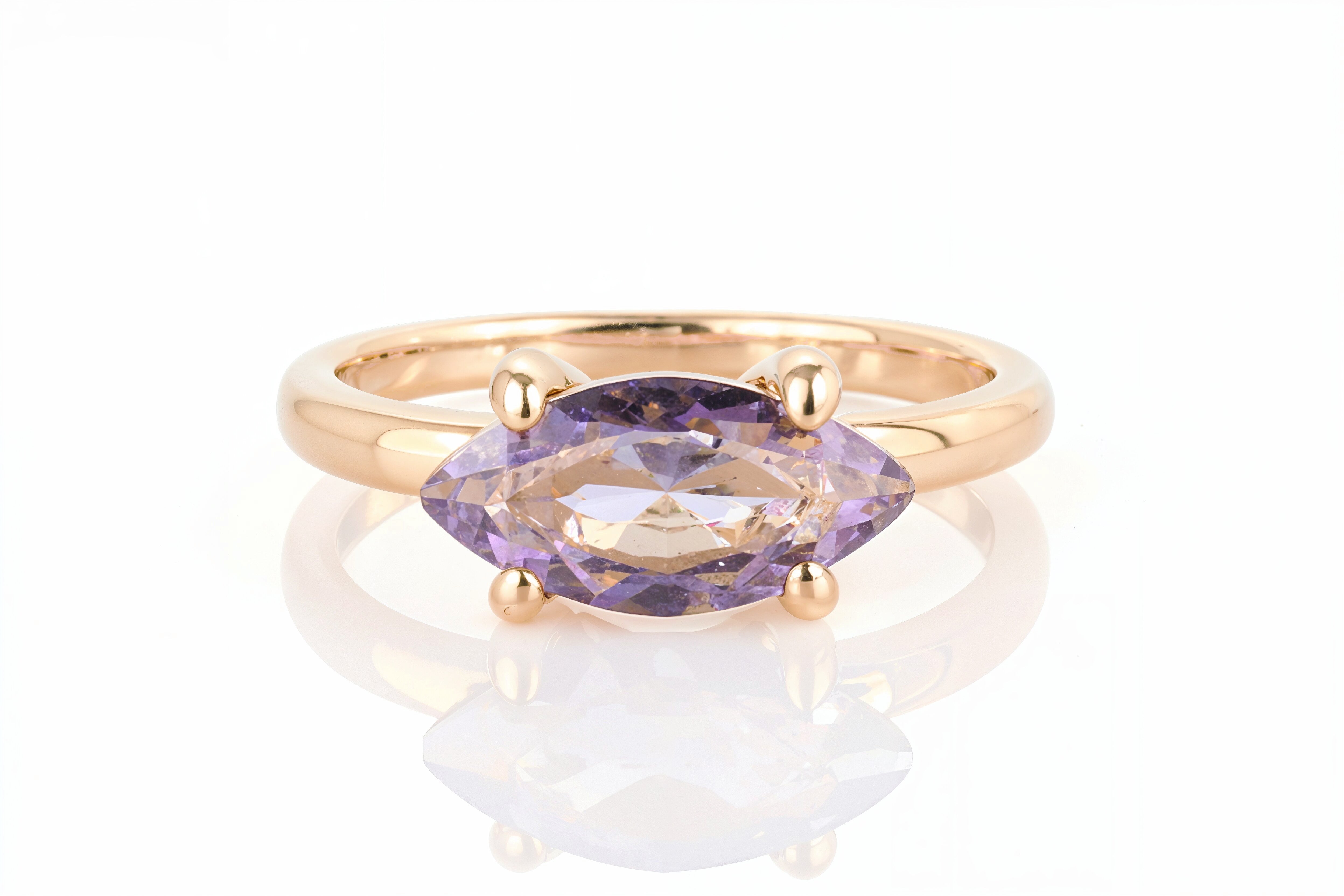 A chic and luxuriant, minimalist jewelry piece handmade with an Amethyst stone. This piece can capture heart as an Amethyst engagement ring, promise ring, or a dainty fashion piece you can stack with other delicate rings.