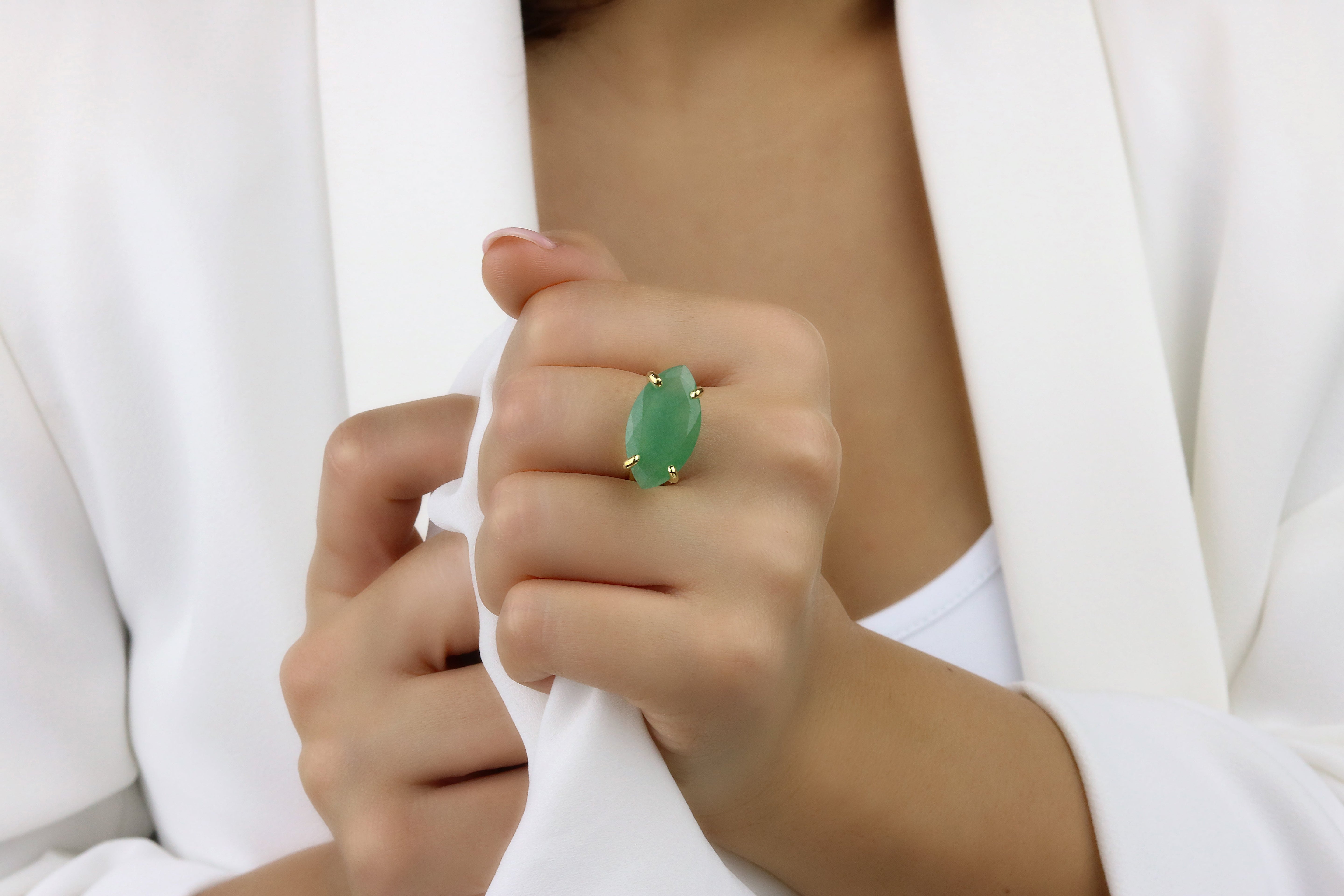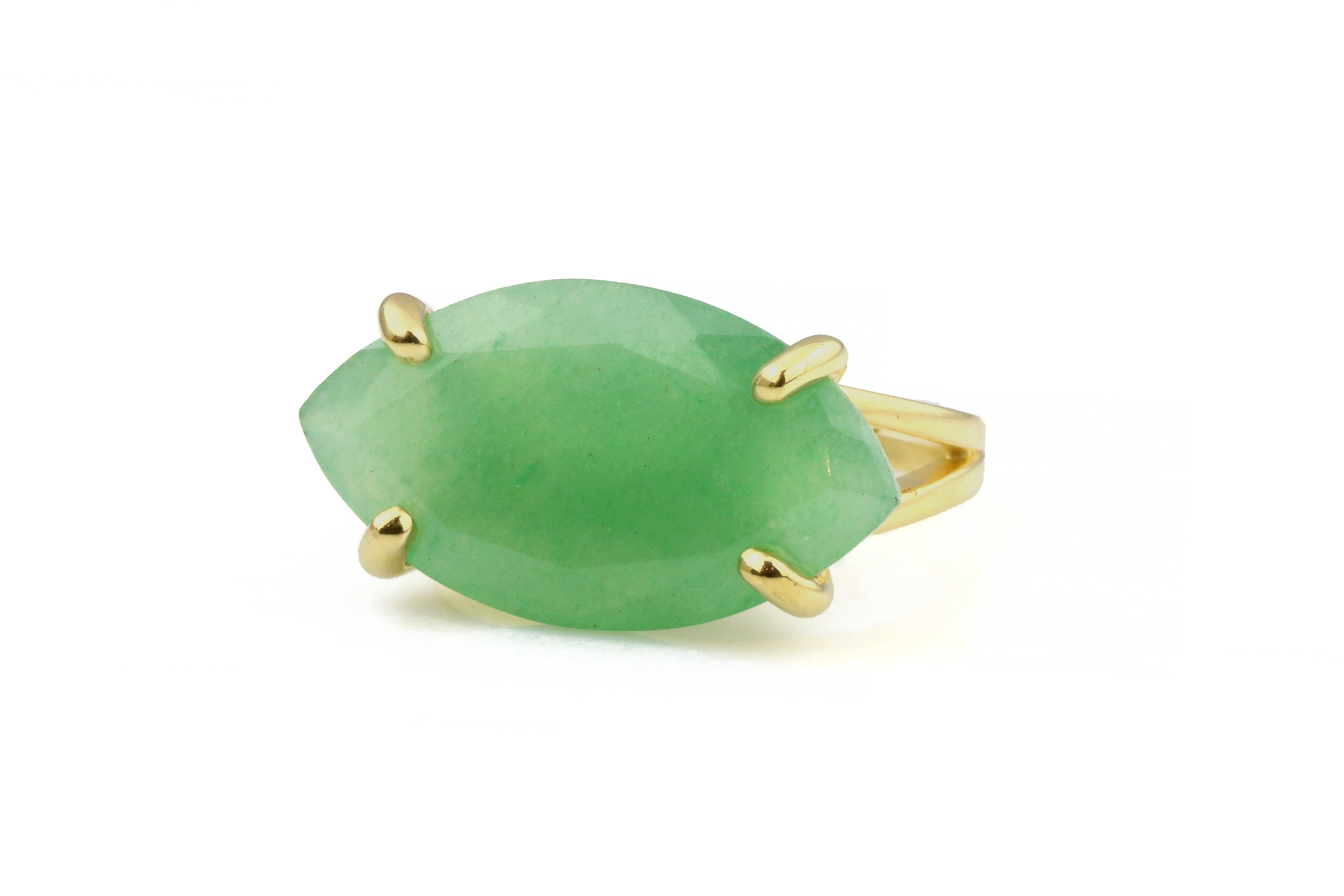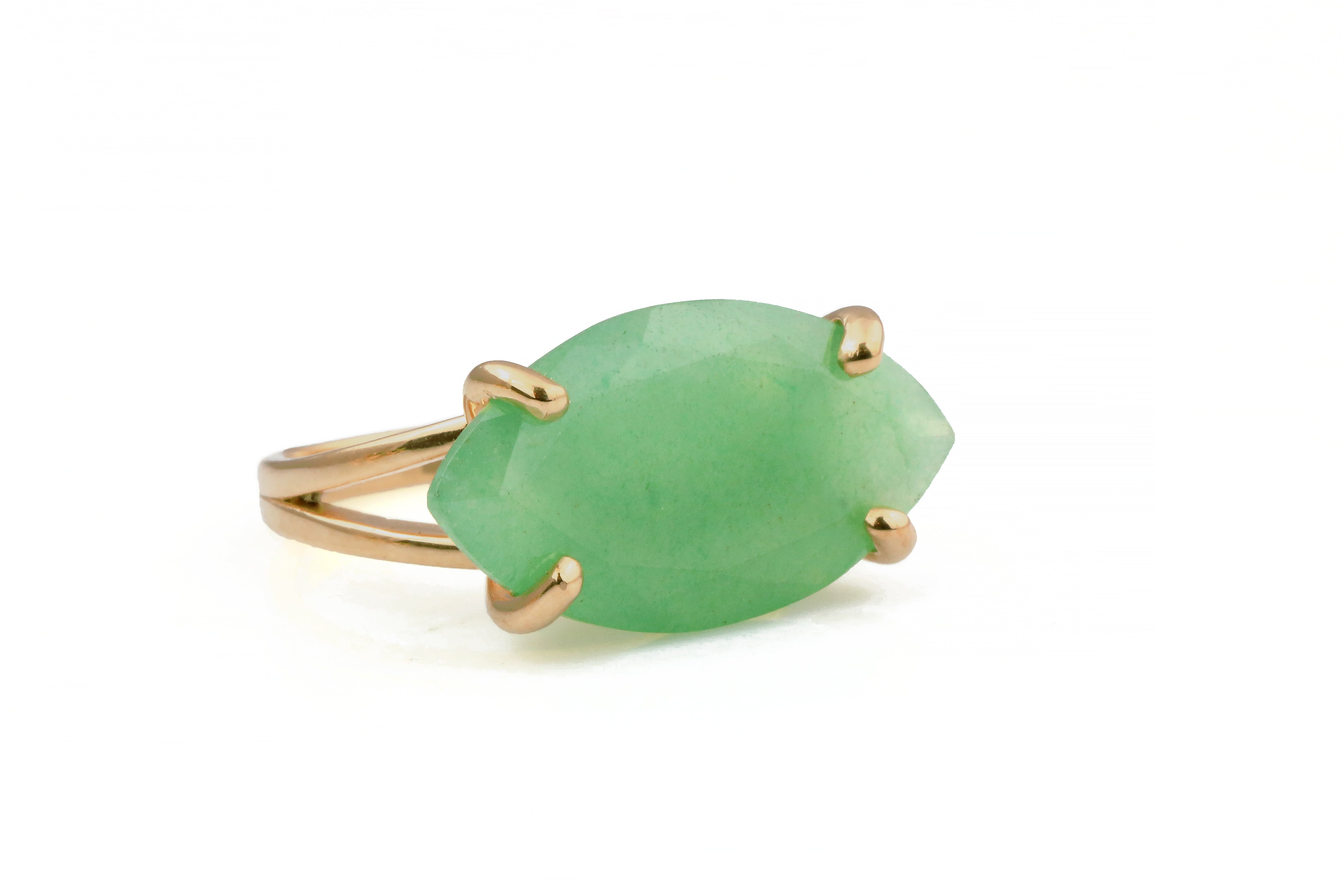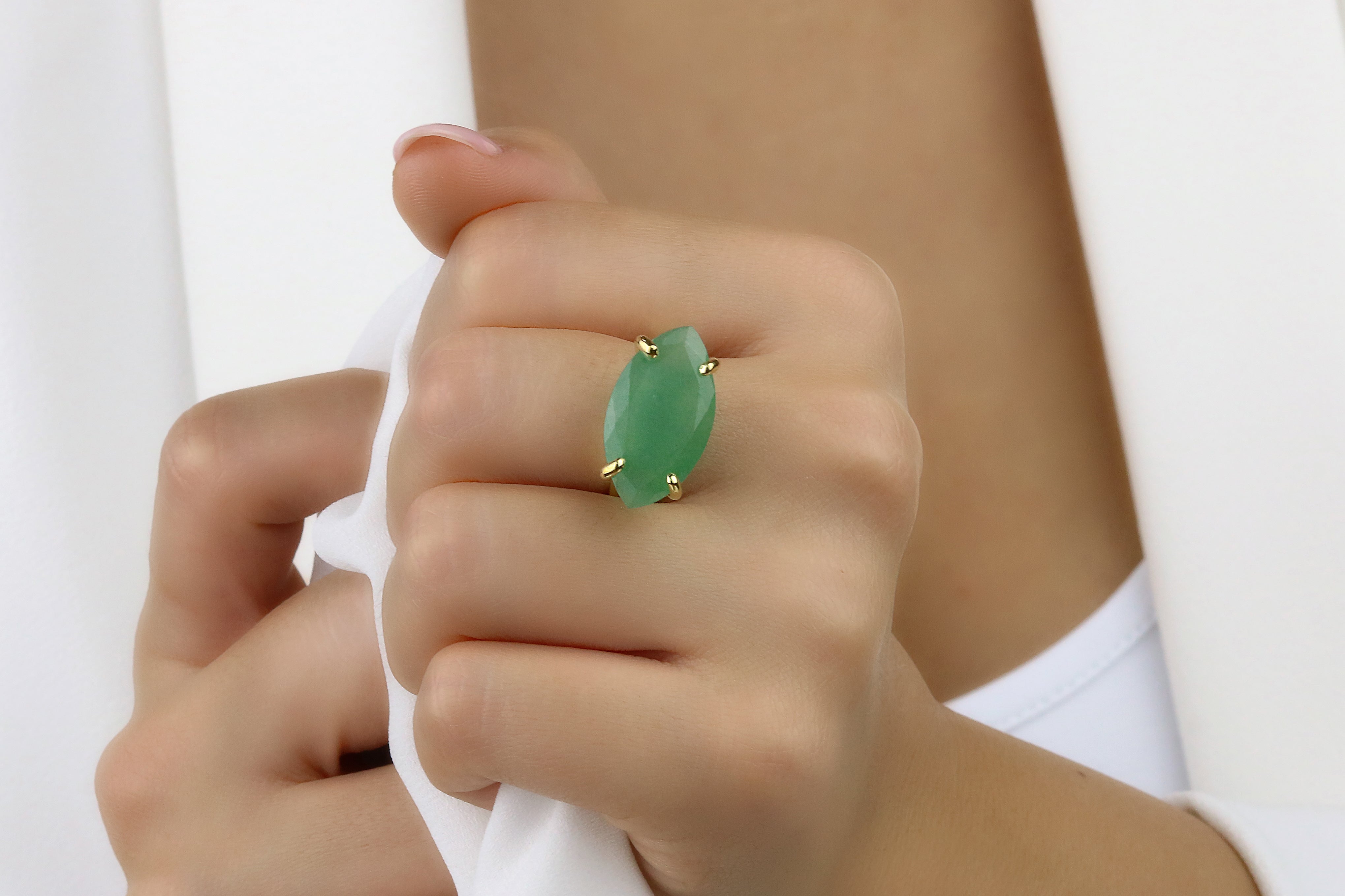 This wide marquise cut aventurine ring shines with a smooth, natural green gemstone set in 14k gold filled metal. The elongated shape enhances the hand’s silhouette, making it an elegant and confident statement piece. Perfect for women who love refined, handcrafted gemstone jewelry with a touch of nature’s charm.