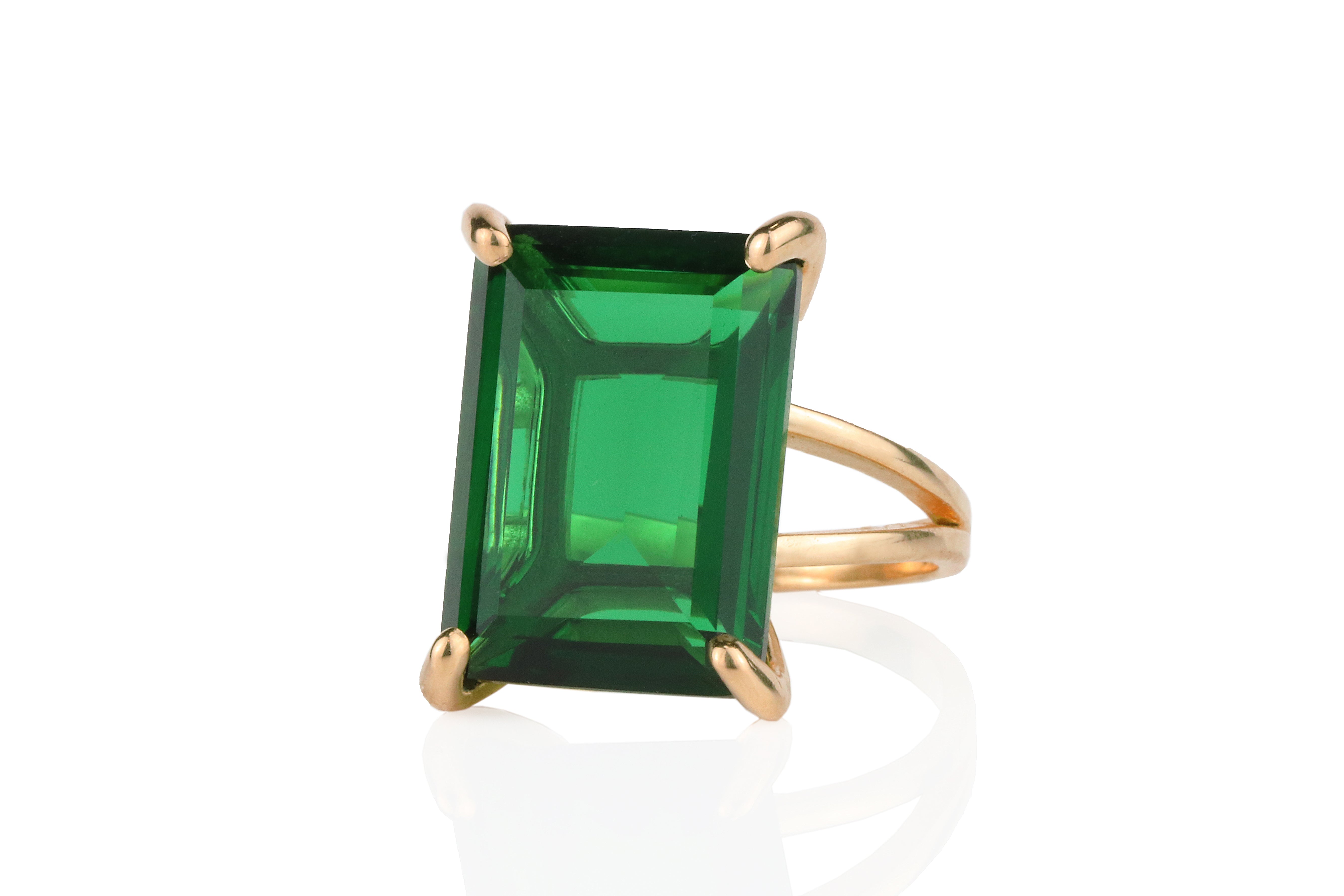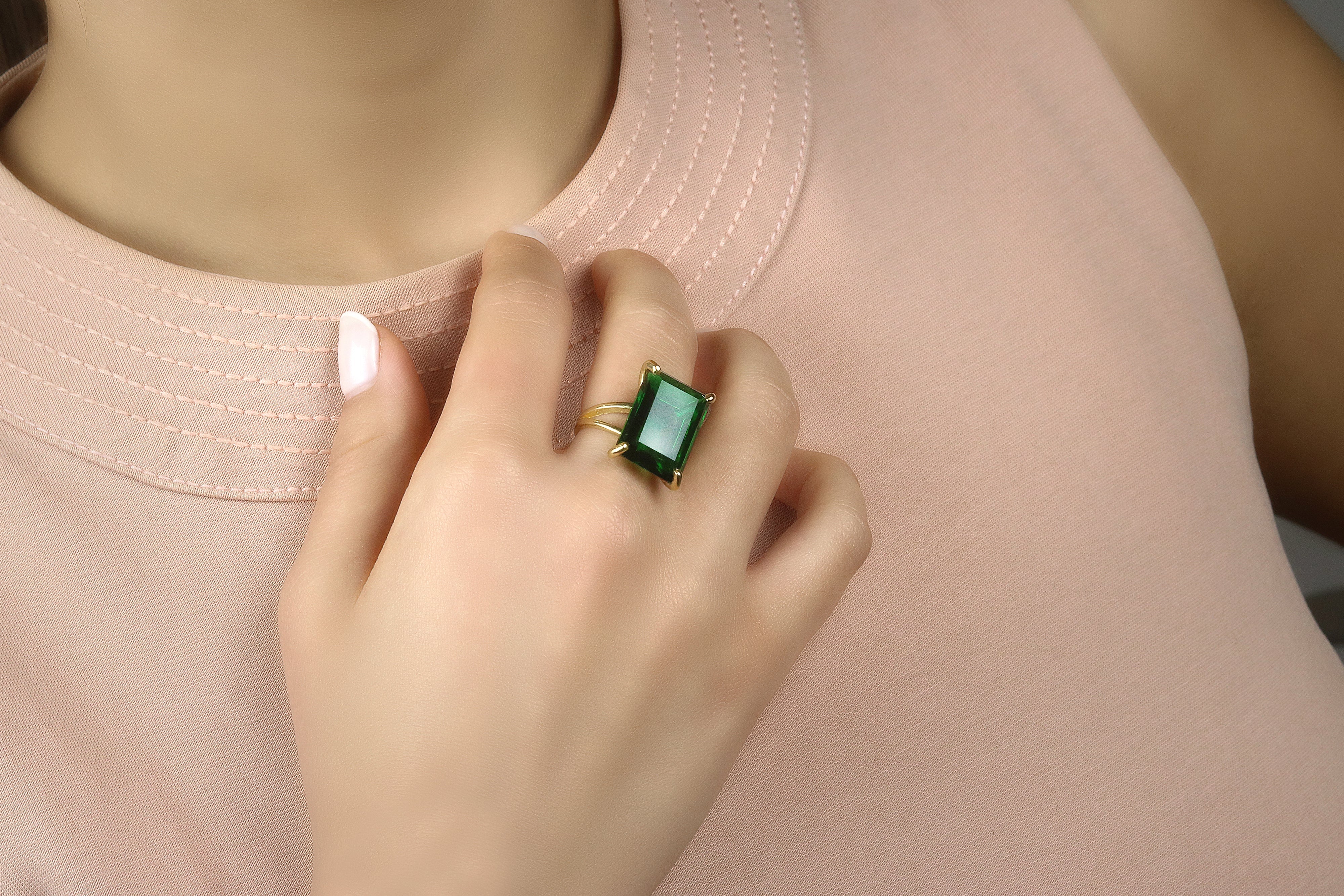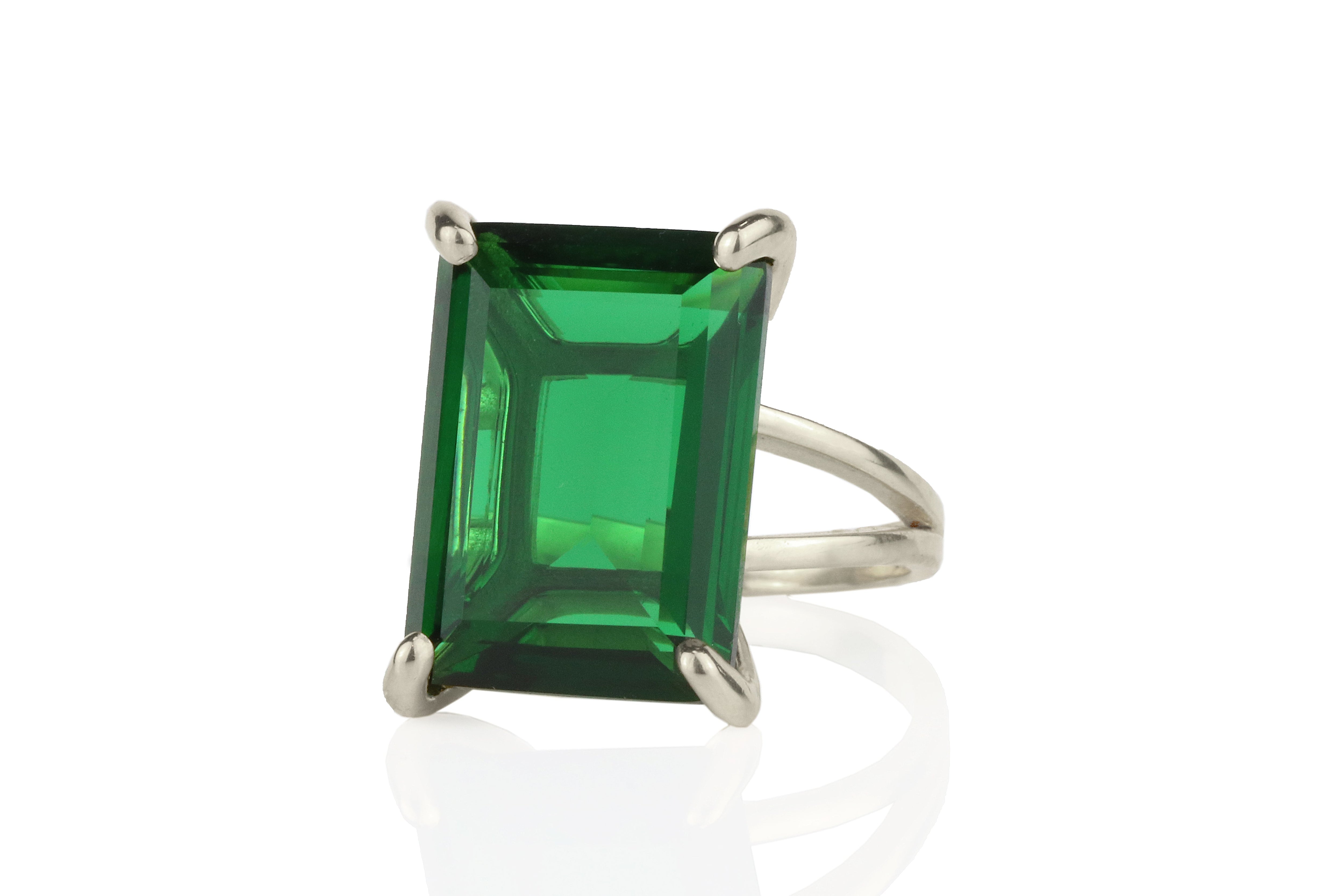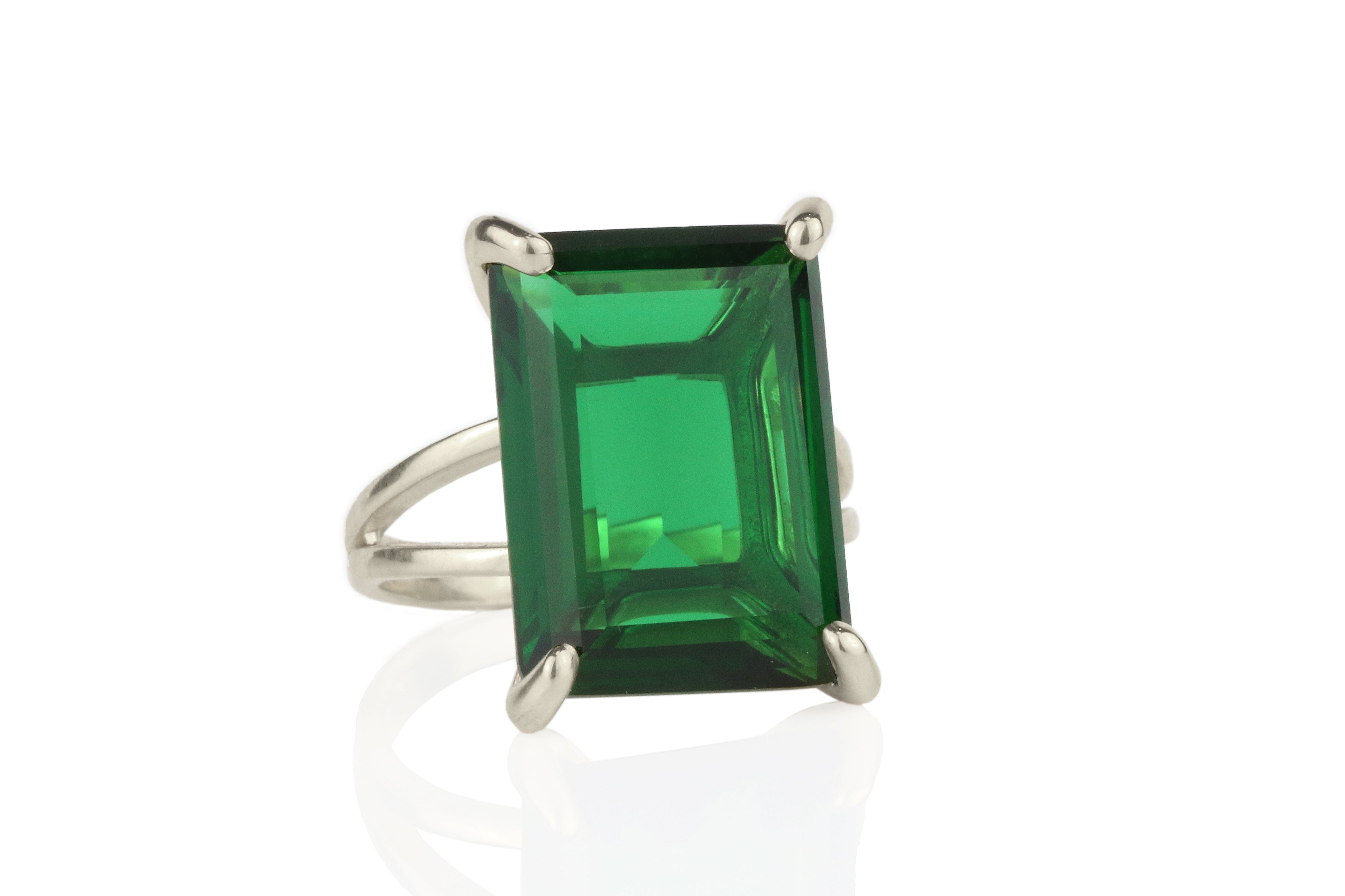 A radiant vertical-cut emerald is showcased in a mirror-polished sterling silver band, offering a refined combination of color and shine. Designed to celebrate May’s birthstone, this ring captures the timeless allure of the emerald with a modern silhouette and a sleek prong setting. Ideal for both everyday wear and special occasions, it’s a striking choice for anyone who loves elegant, vintage-inspired jewelry with a contemporary edge.