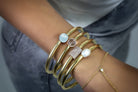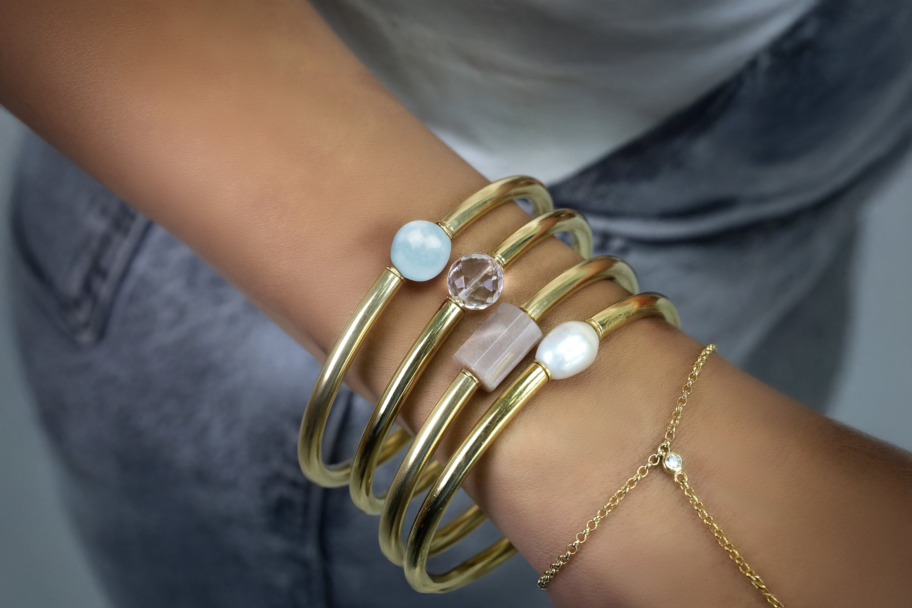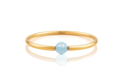 This 14k gold filled bracelet features a smooth round aquamarine bead set in a polished gold tube bangle. As the birthstone of March, aquamarine is cherished for its peaceful energy and associations with clarity and calm.