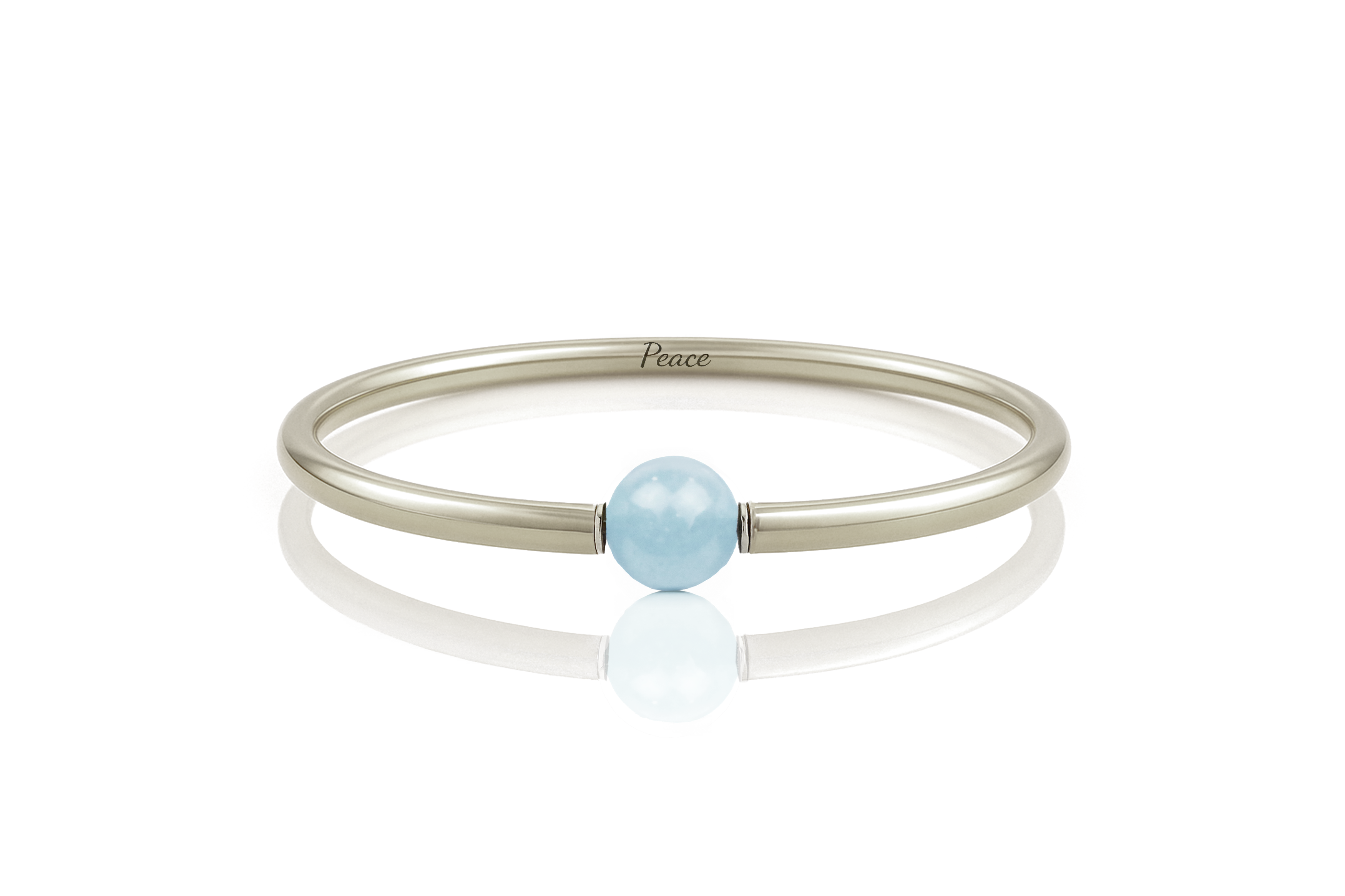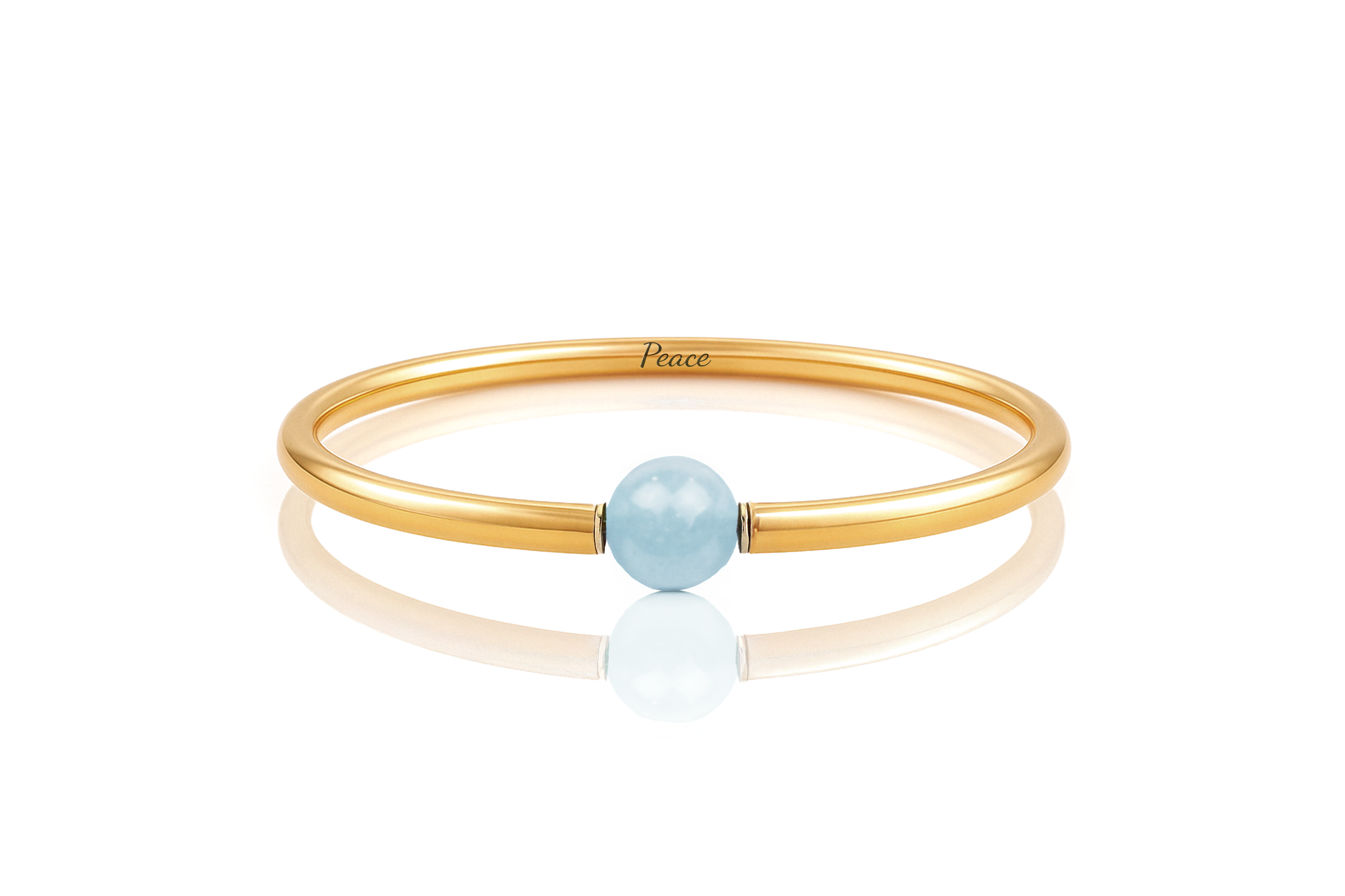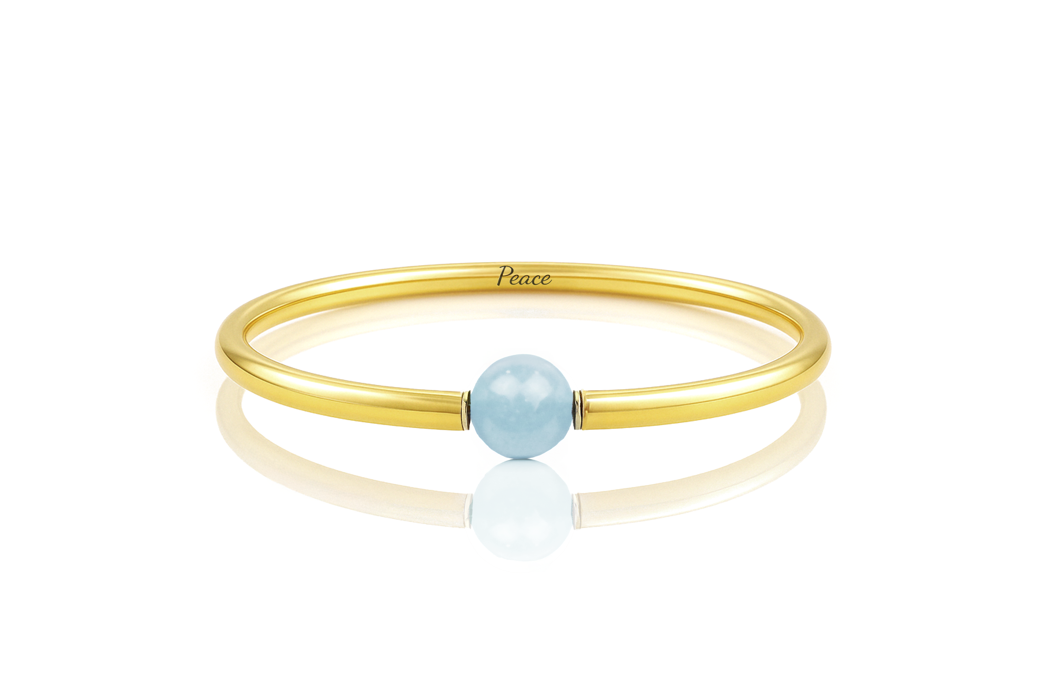 Aquamarine “Peace” Engraved Gold Bangle Bracelet