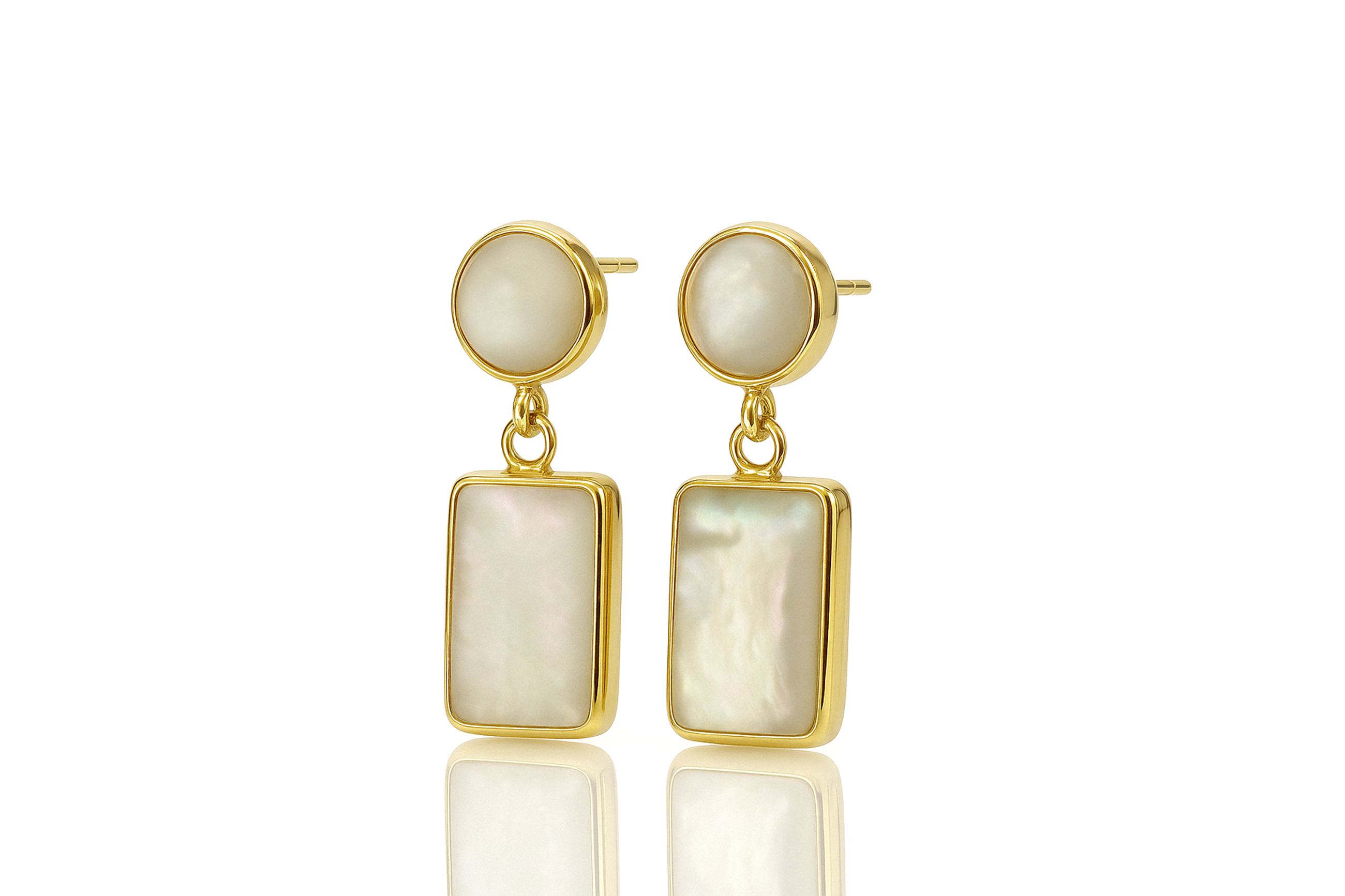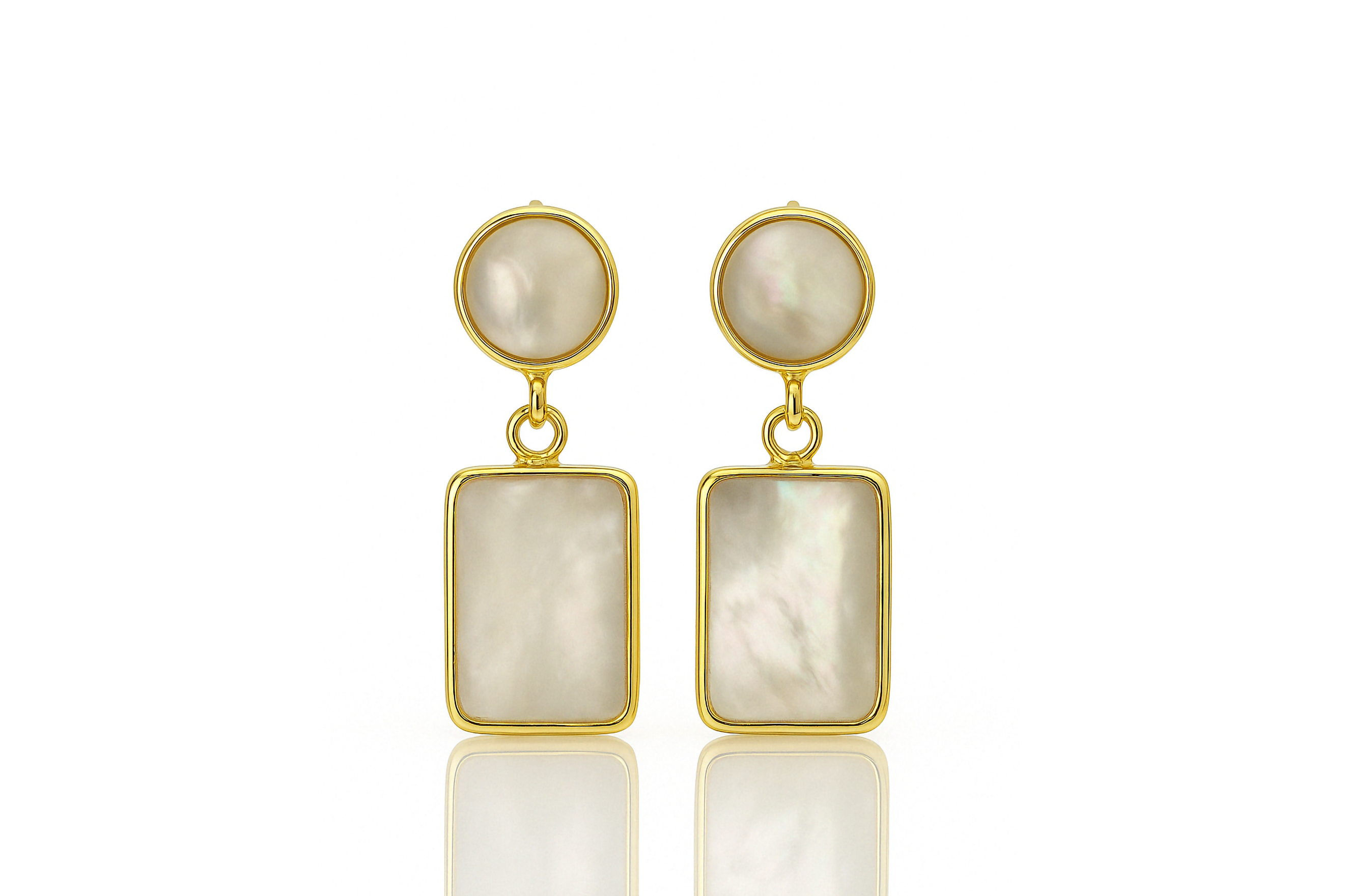 These elegant dangle earrings combine round and rectangular mother of pearl shell elements, set in smooth gold-filled bezels. The natural iridescence of the shell reflects light with a soft glow, adding both subtle shimmer and bold character to your look.