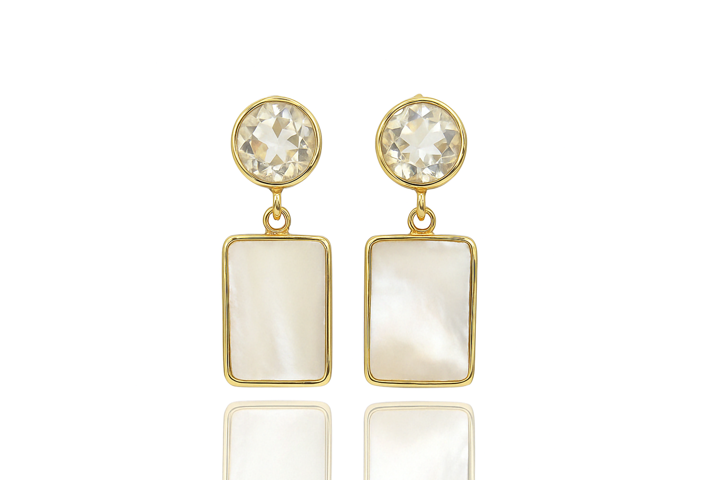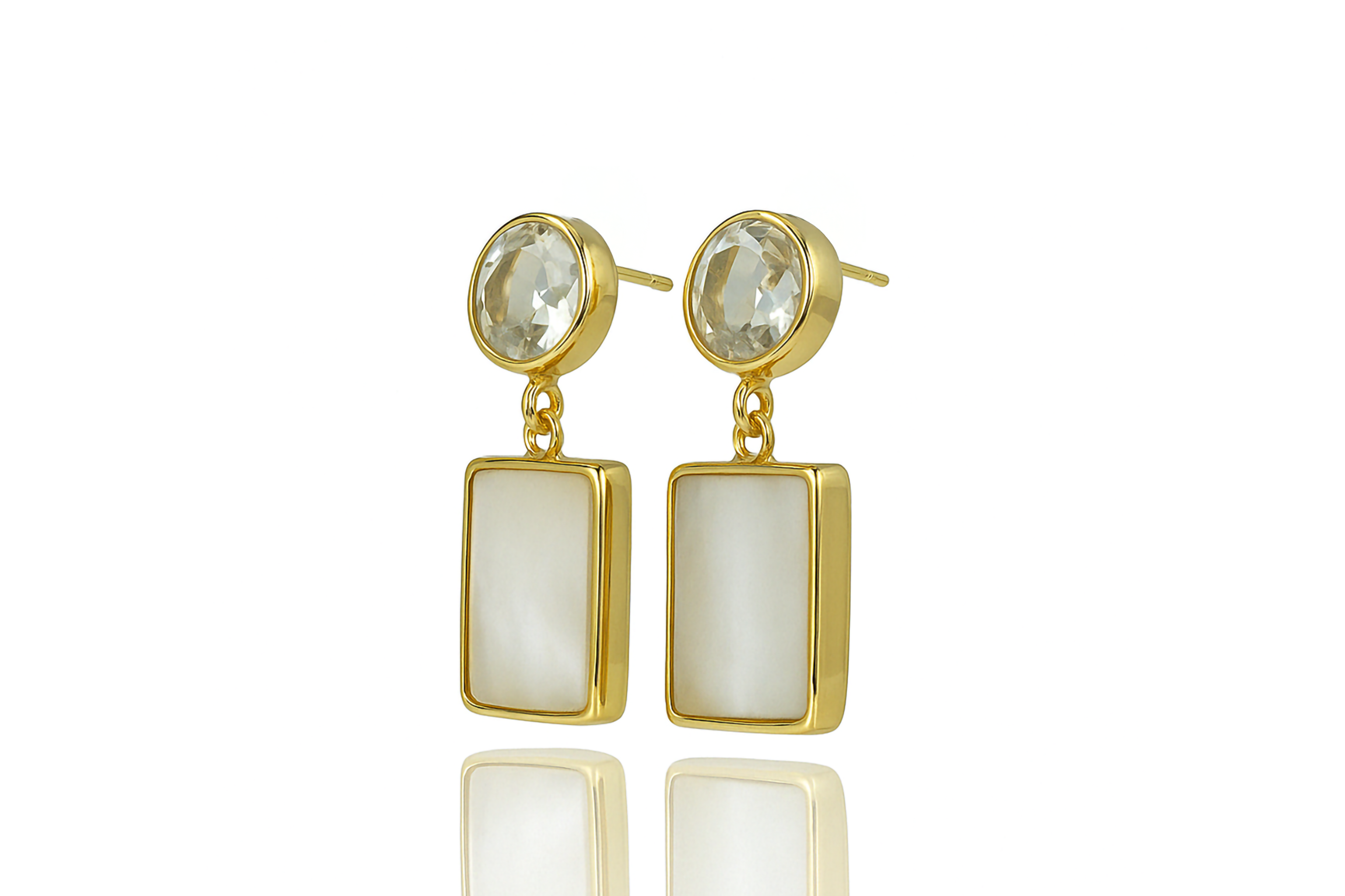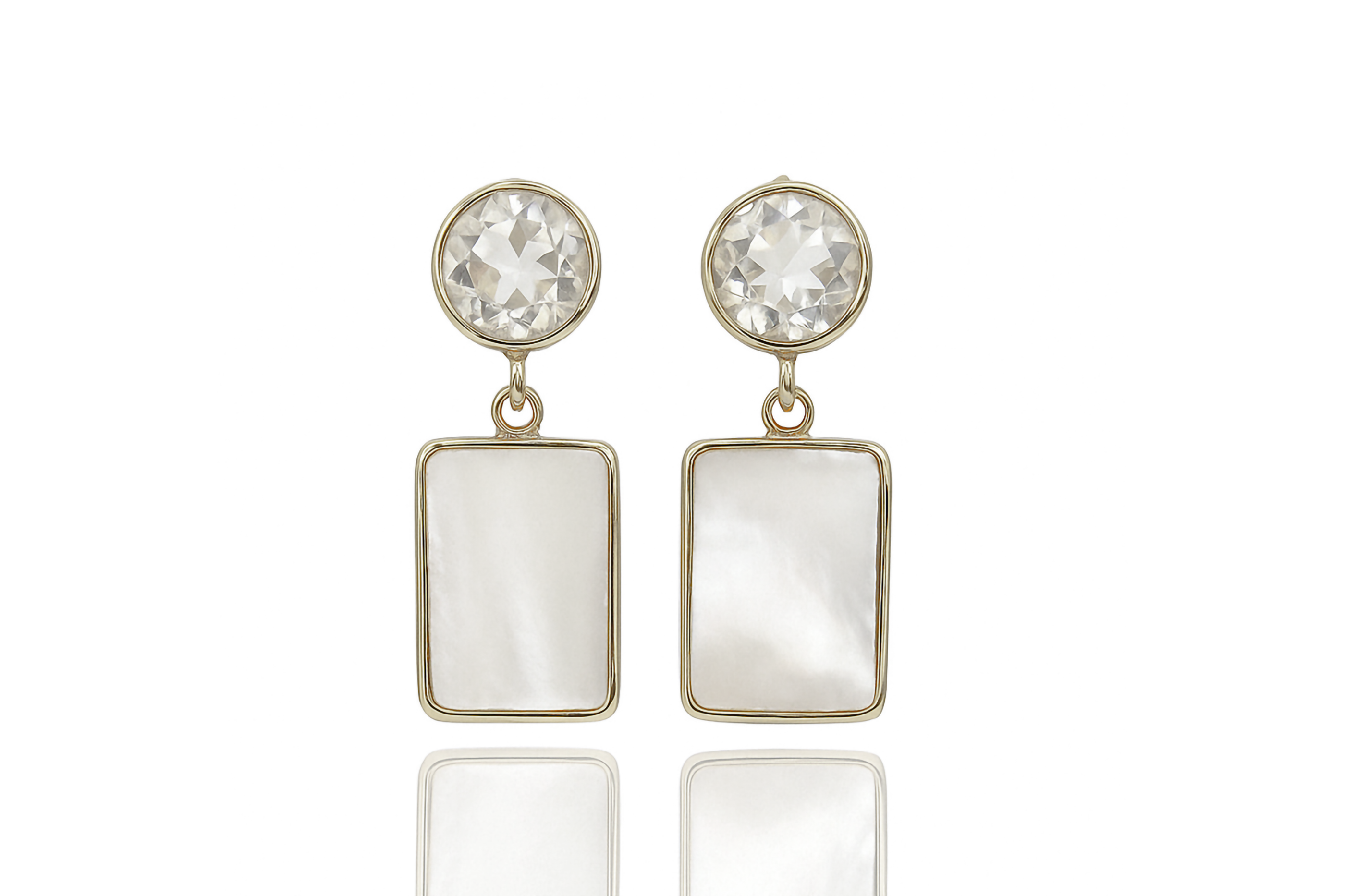 These elegant dangle earrings combine round and rectangular mother of pearl shell elements, set in smooth gold-filled bezels. The natural iridescence of the shell reflects light with a soft glow, adding both subtle shimmer and bold character to your look.