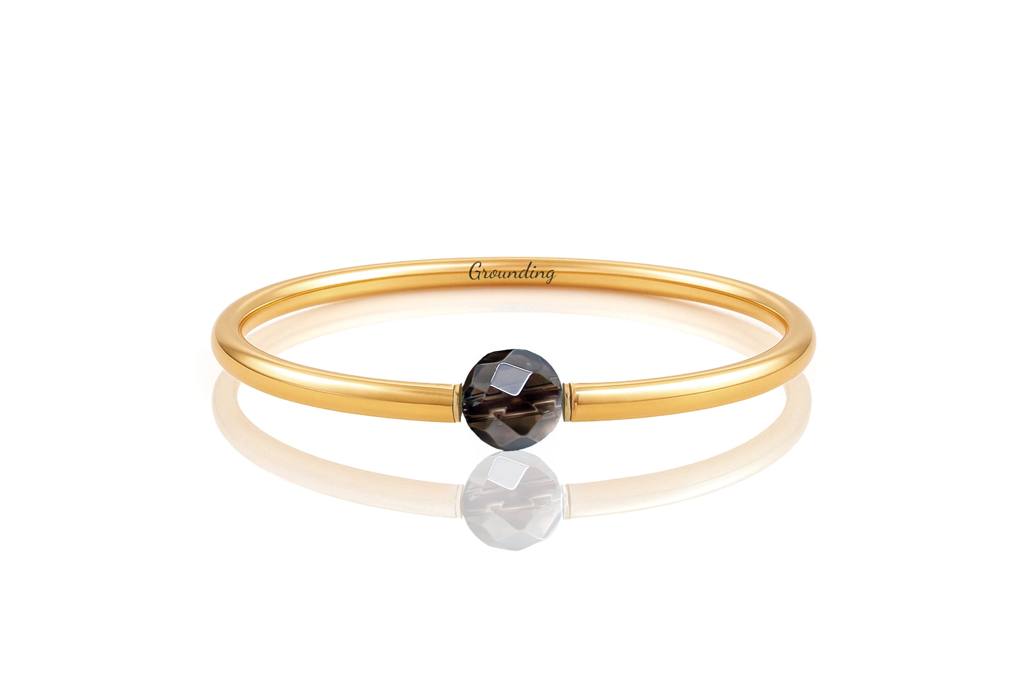 This 14k gold filled bangle bracelet features a faceted round smoky quartz bead set at the center of a polished closed tube band. The deep, earthy shimmer of the smoky quartz adds subtle sparkle, beautifully complemented by the warm golden tone.