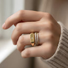 This gold rectangular CZ signet ring features a sleek rectangle face paved with sparkling cubic zirconia. Available in 14k solid gold or vermeil, it combines timeless craftsmanship with modern design for an elegant, versatile accessory.