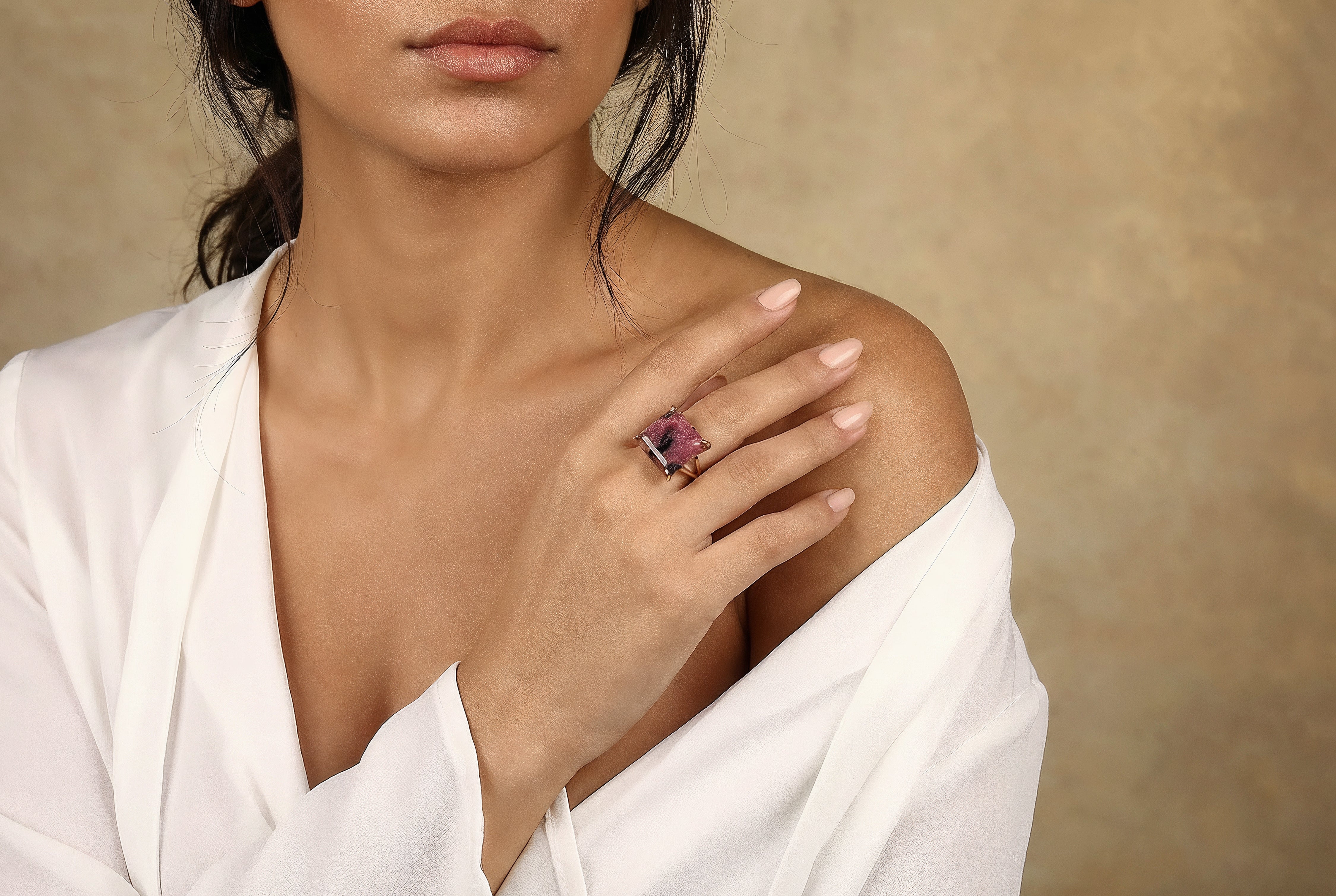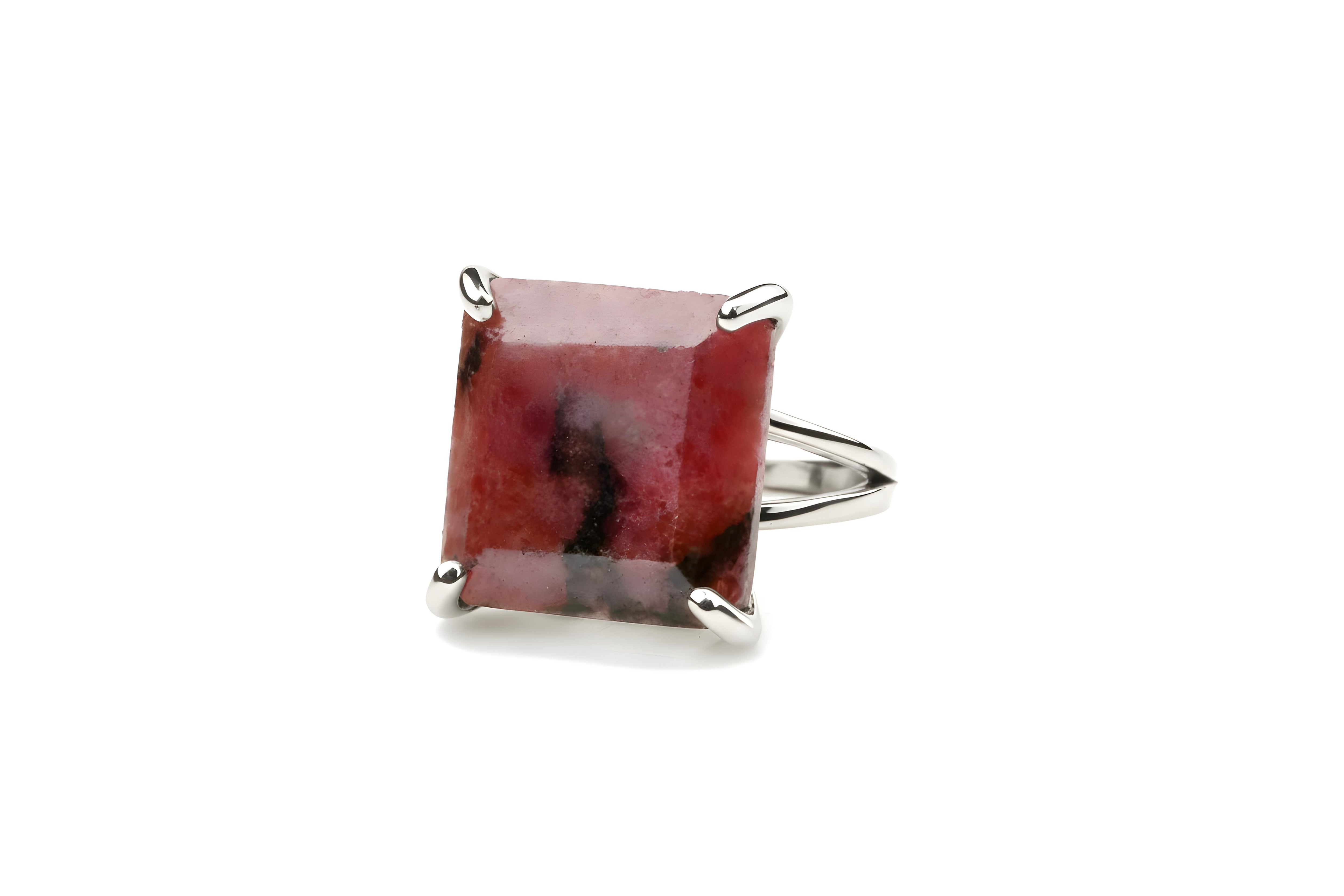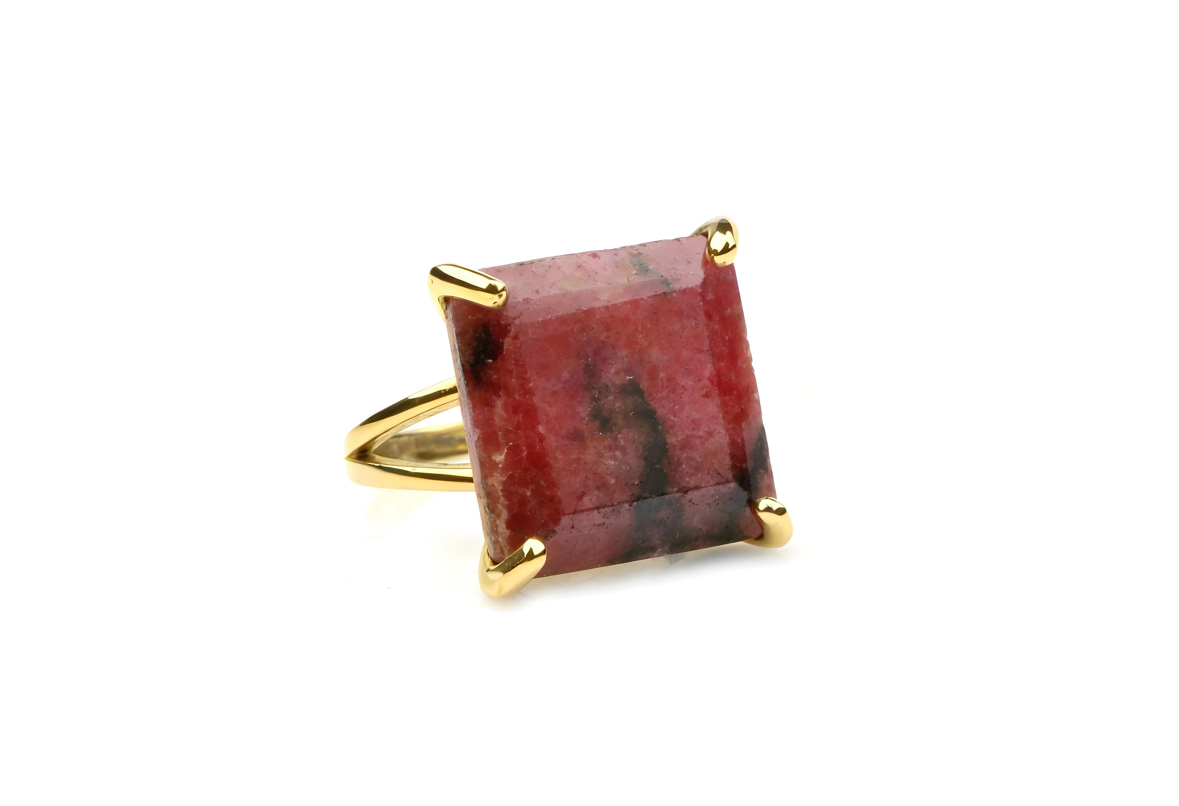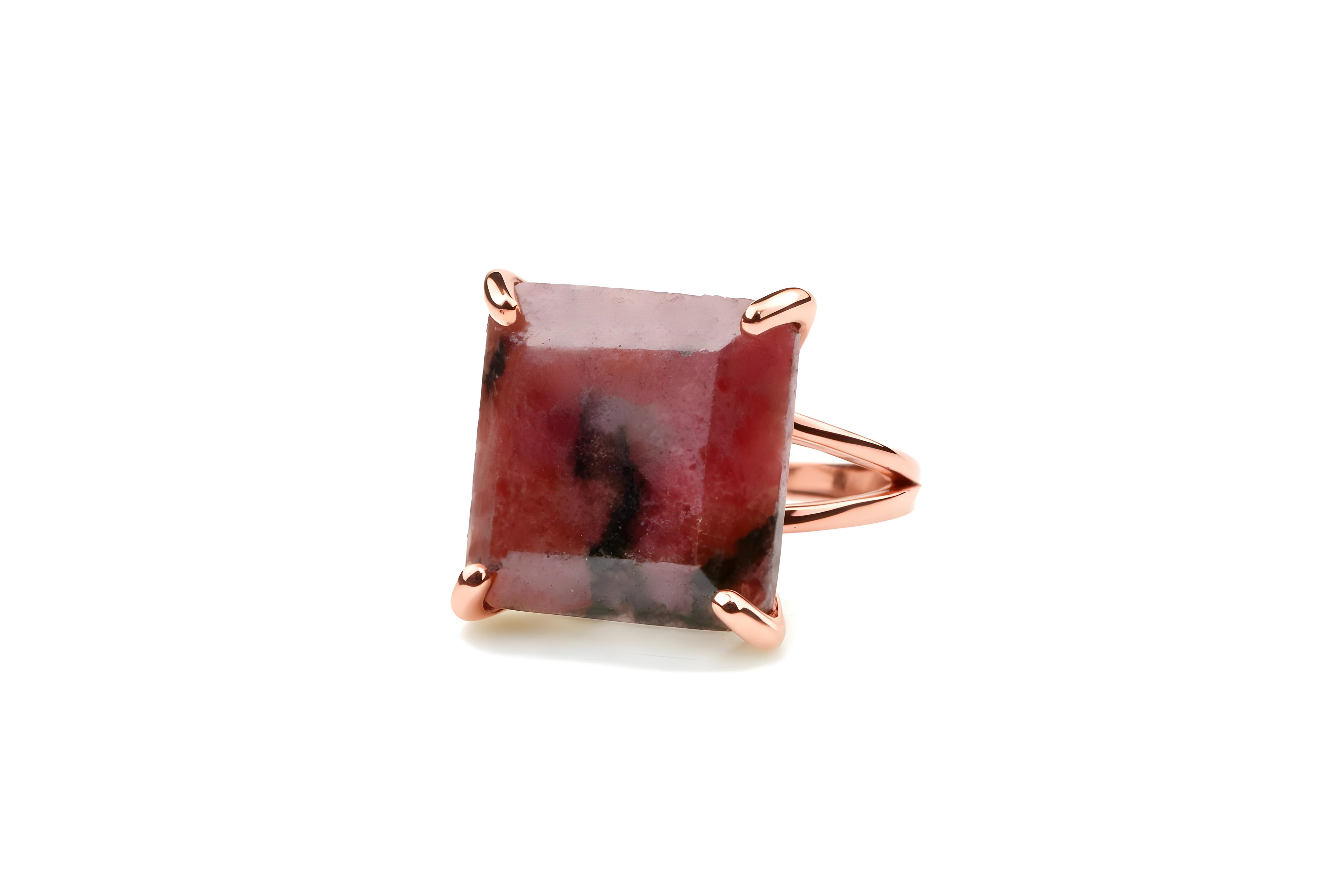 This raw rhodonite ring highlights a striking square-cut gemstone with natural pink and black tones that make every piece one of a kind. The princess-cut surface adds clean structure, set on a gold-filled double band for a bright, modern look.