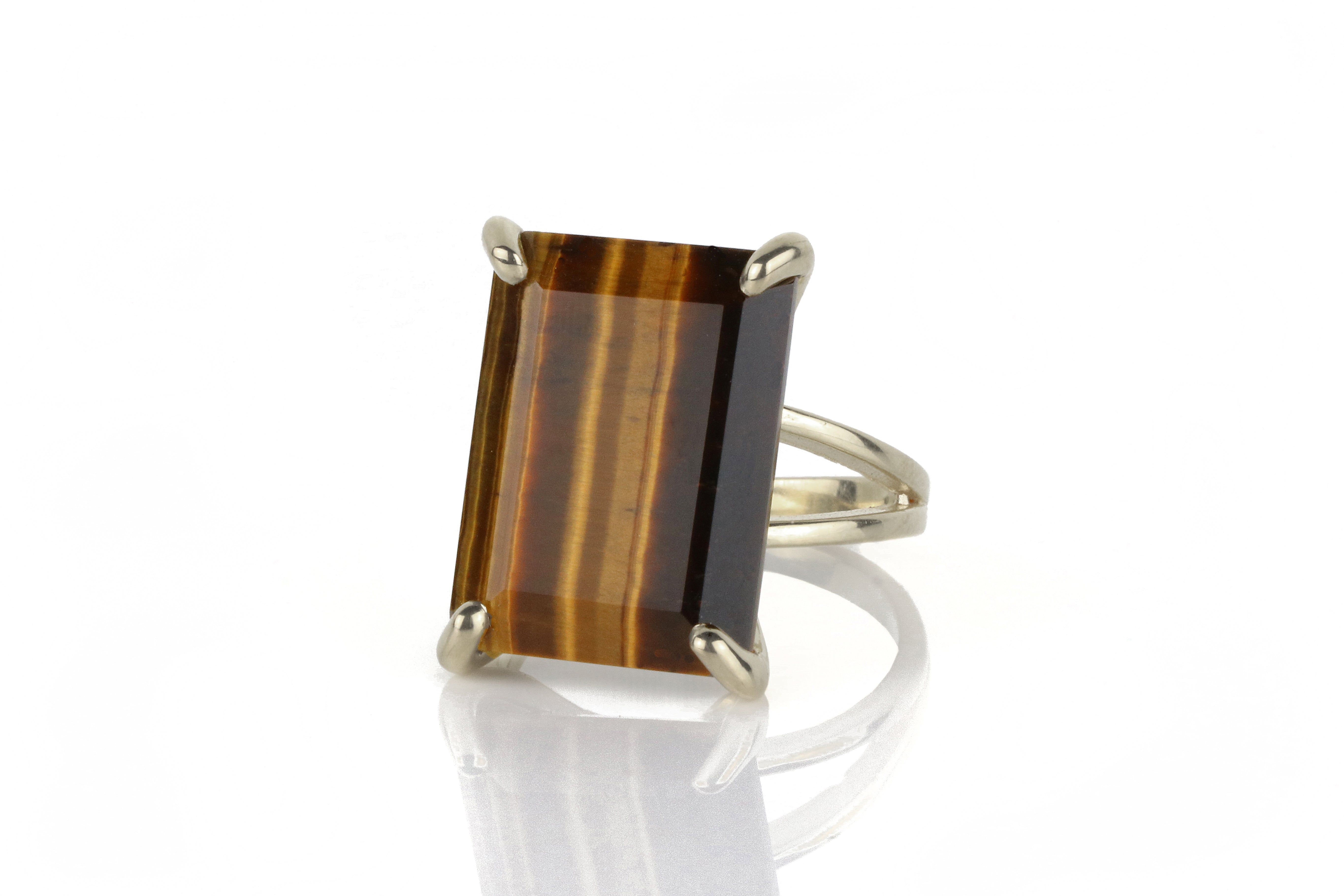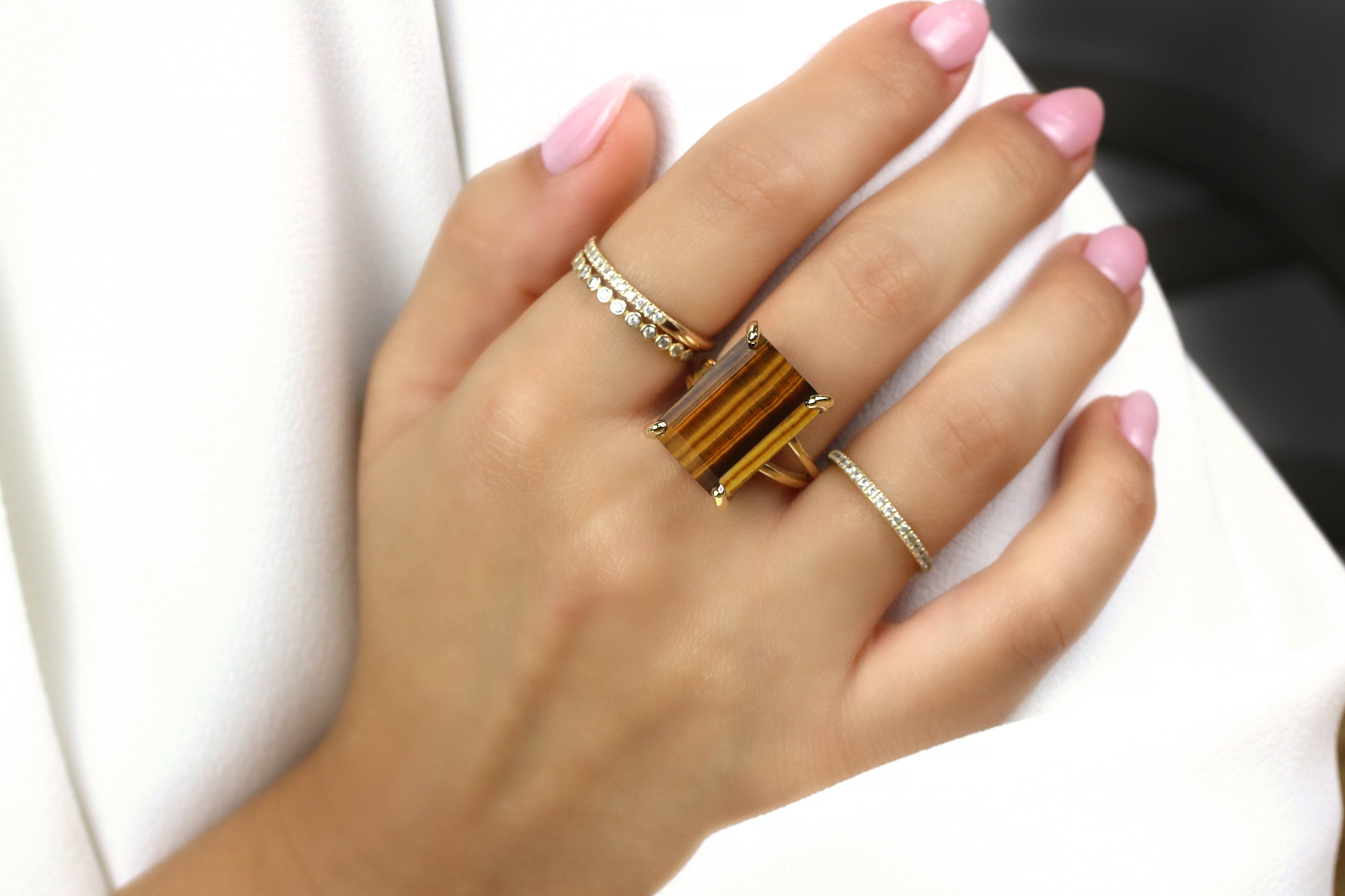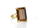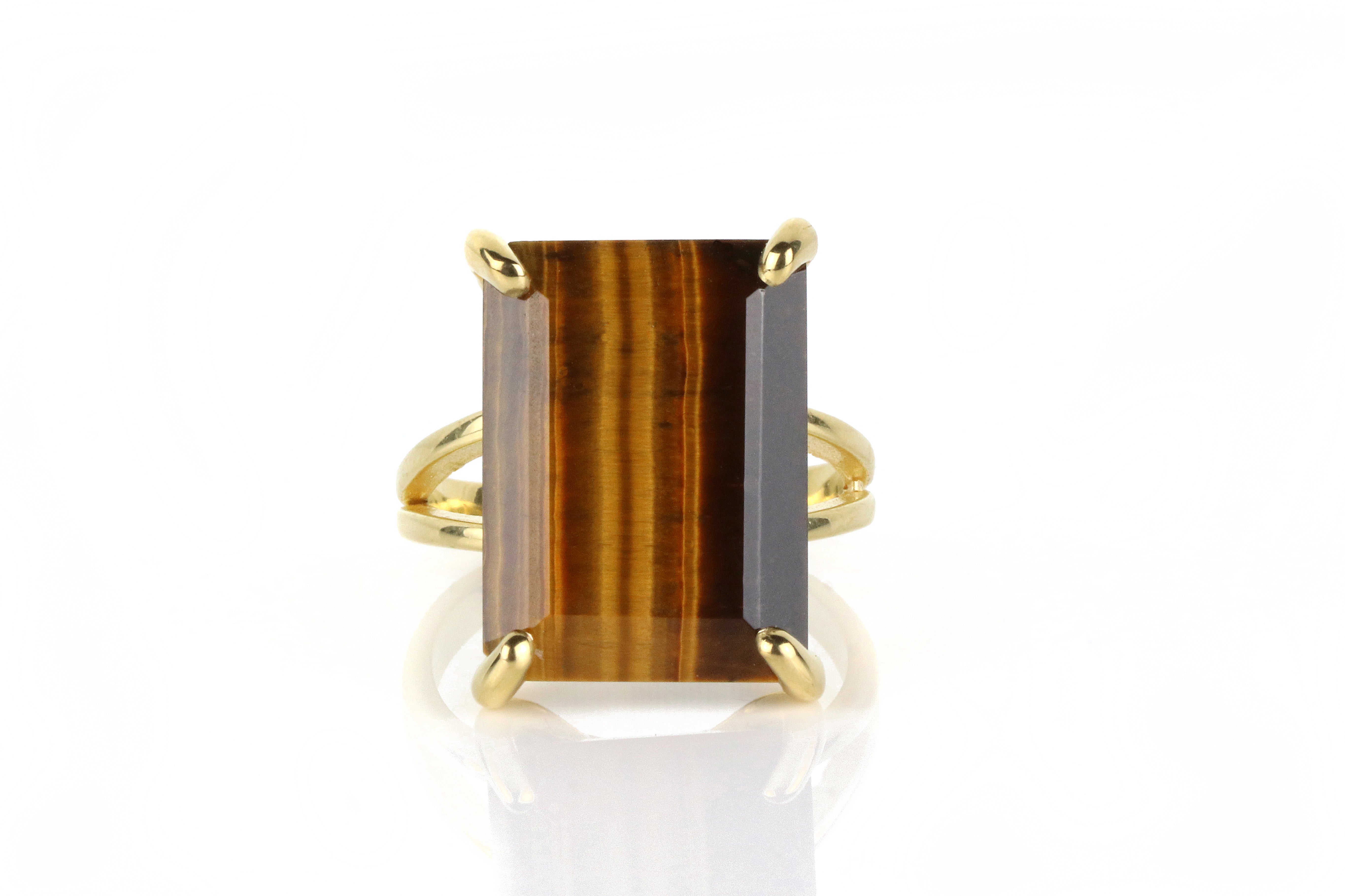 This long rectangle-cut tiger eye ring brings out the natural chatoyancy and warm brown tones of the stone. Set in polished 14k yellow gold filled metal, it creates a slim vertical silhouette that feels bold yet refined. The elongated cut highlights the stone’s natural stripes, giving the ring a modern and minimal aesthetic.