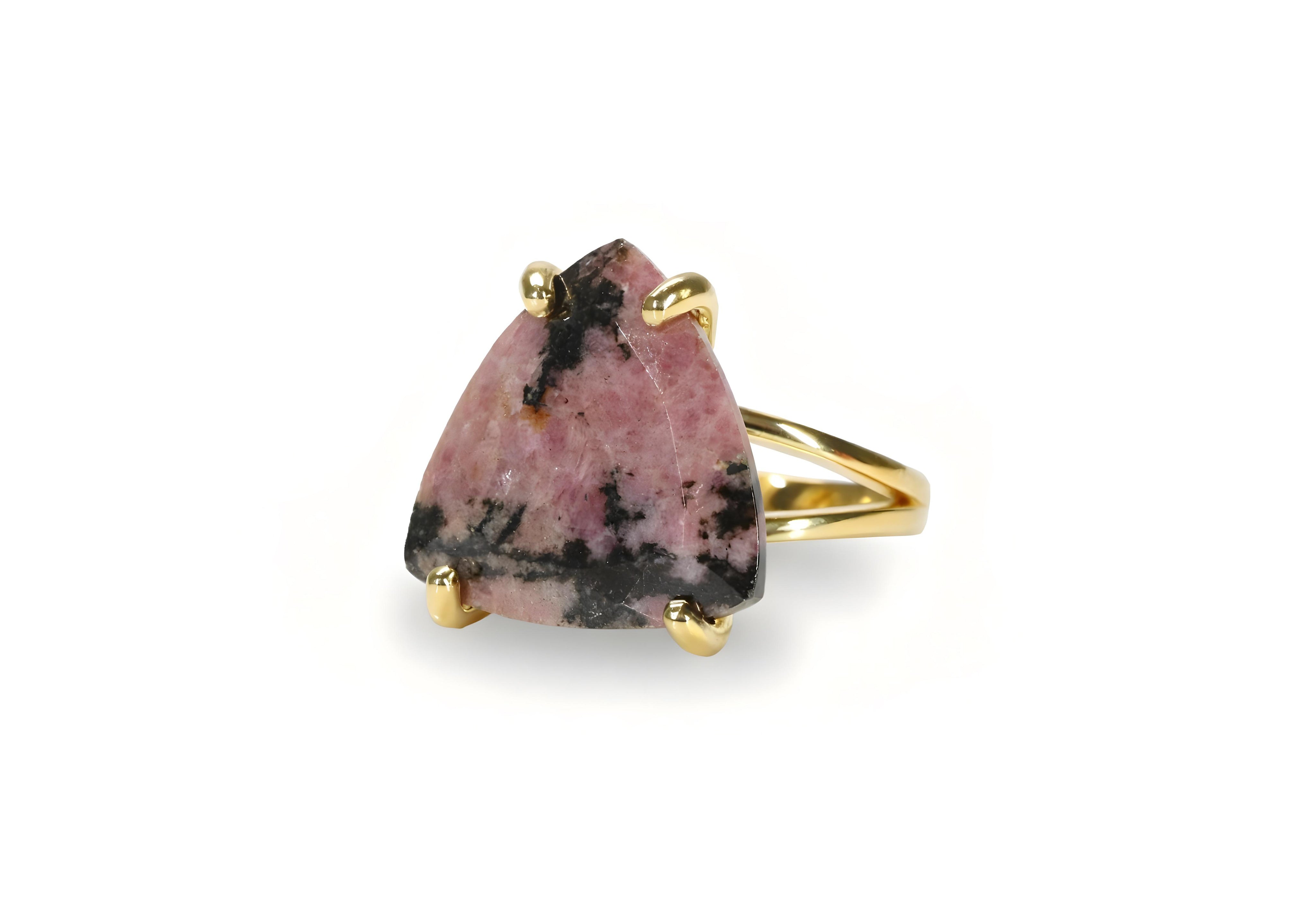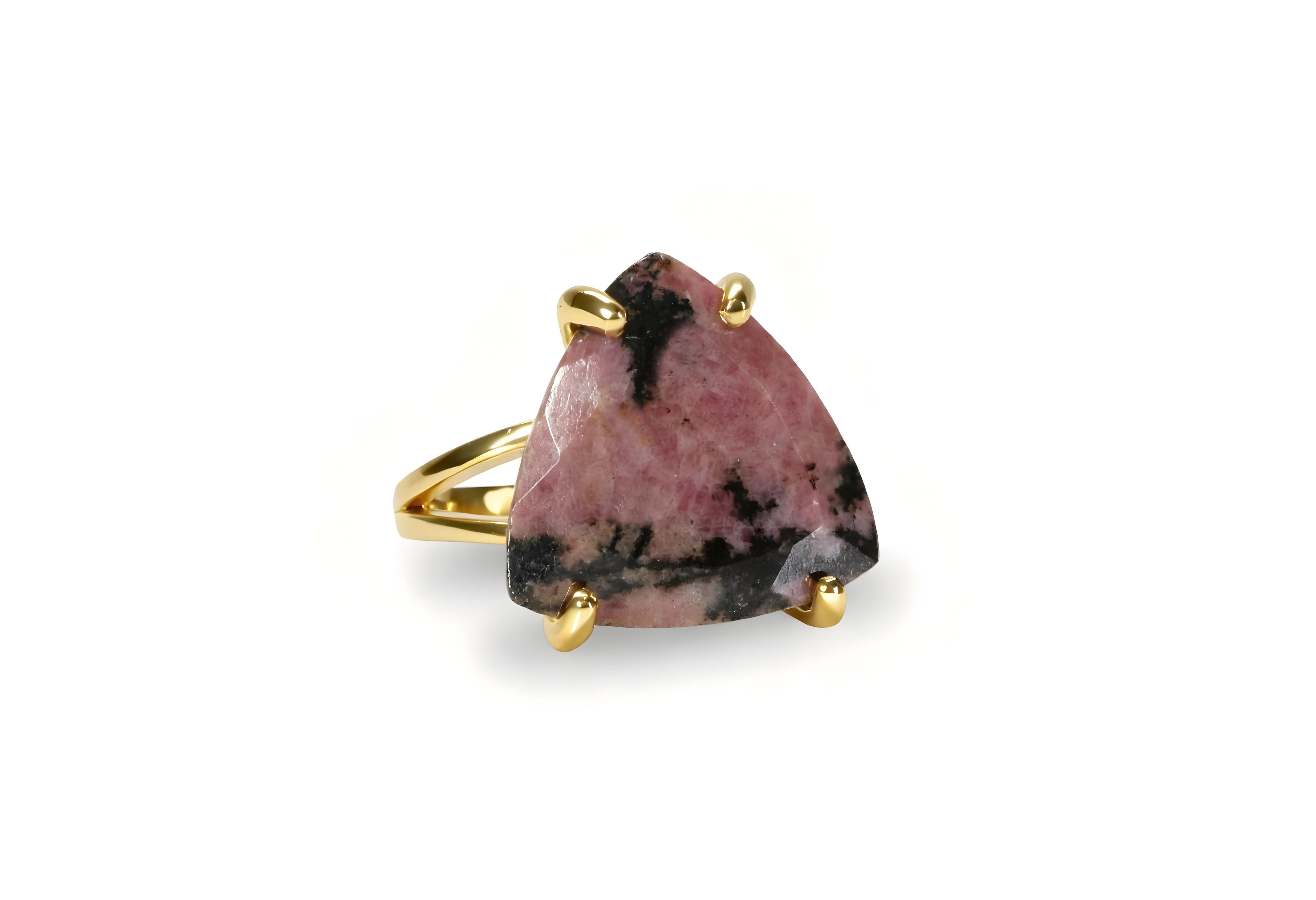 This Beautiful Trillion Rhodonite Ring features a bold triangle-cut natural gemstone set in a glossy gold-filled double band, creating a striking mix of deep pink and charcoal patterns unique to each stone. The Pink Gemstone Ring brings a fresh modern feel while staying elegant enough for everyday wear, making it a standout option for women who love meaningful semiprecious jewelry. Designed as a Gold Statement Jewelry piece, the Semiprecious Rhodonite Ring pairs effortlessly with both minimal and layered looks, offering a soft pop of color that works for birthdays, holidays, and personal milestones. Each ring celebrates the stone’s natural texture and individuality, giving you a Pink Stone Ring that feels one-of-a-kind.