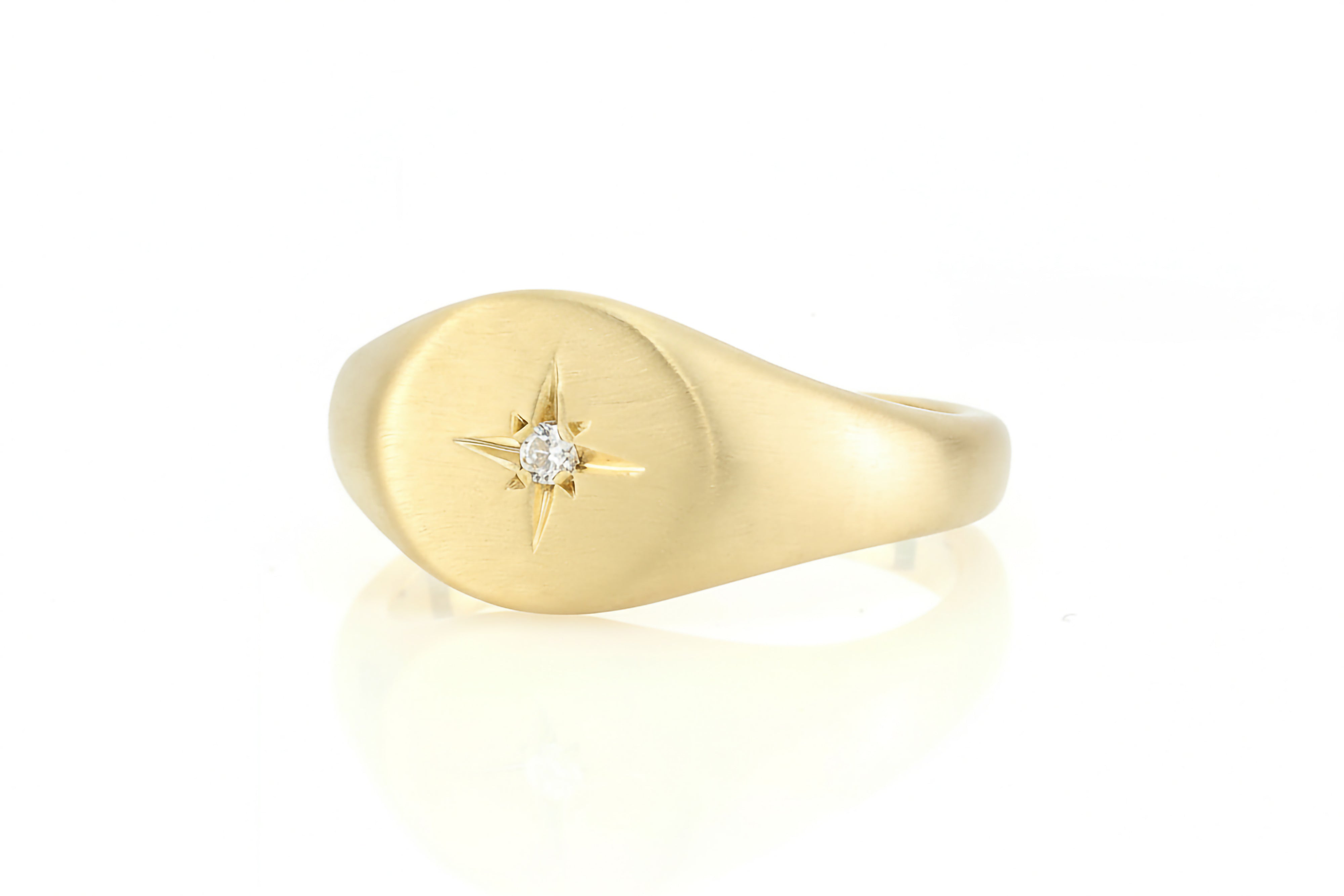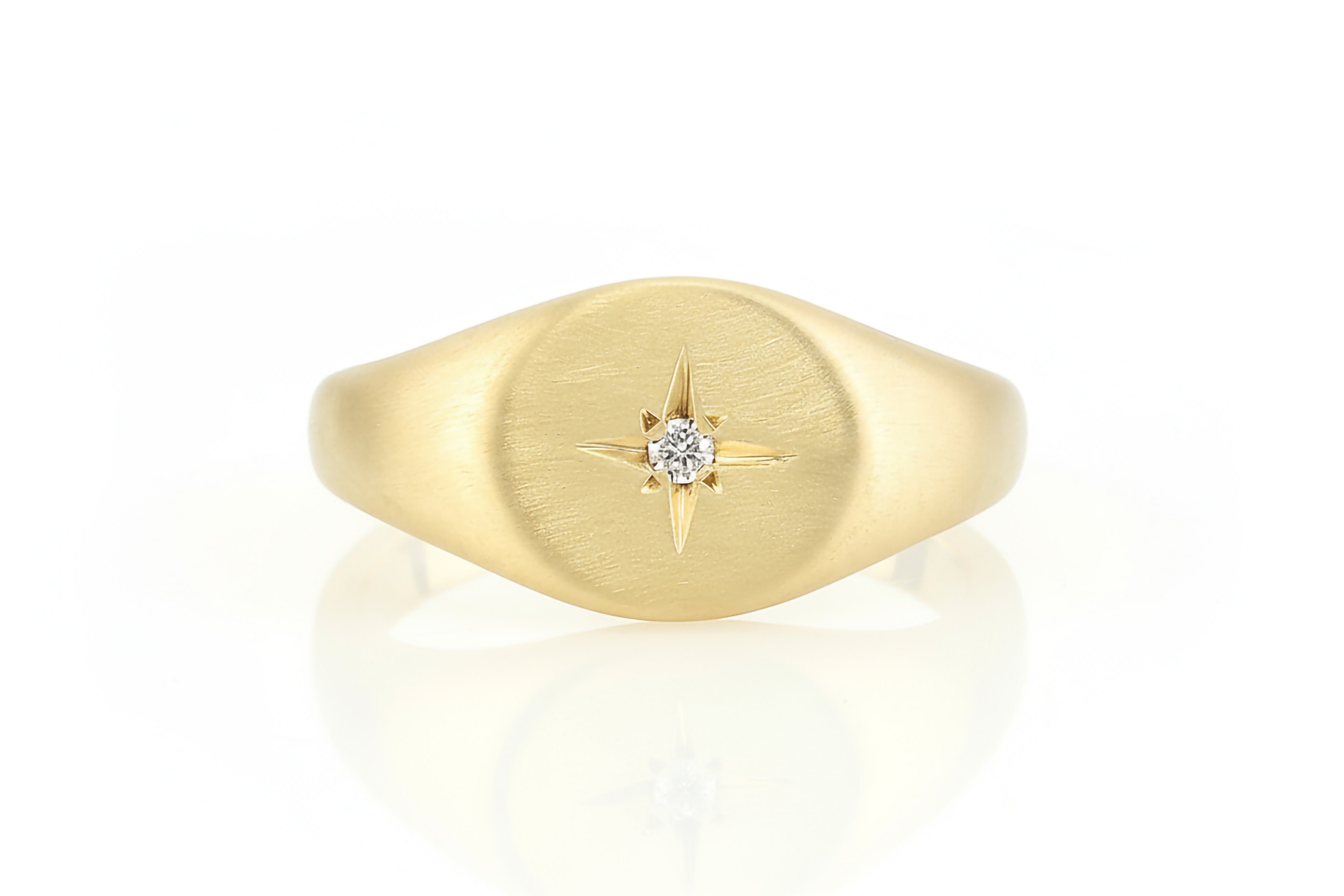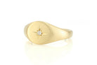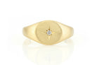 This gold round signet ring features a CZ pave setting in the center, blending modern sparkle with a timeless signet style. The sleek round face and polished gold finish make it a versatile piece that can be stacked with other rings or worn solo as a bold statement.