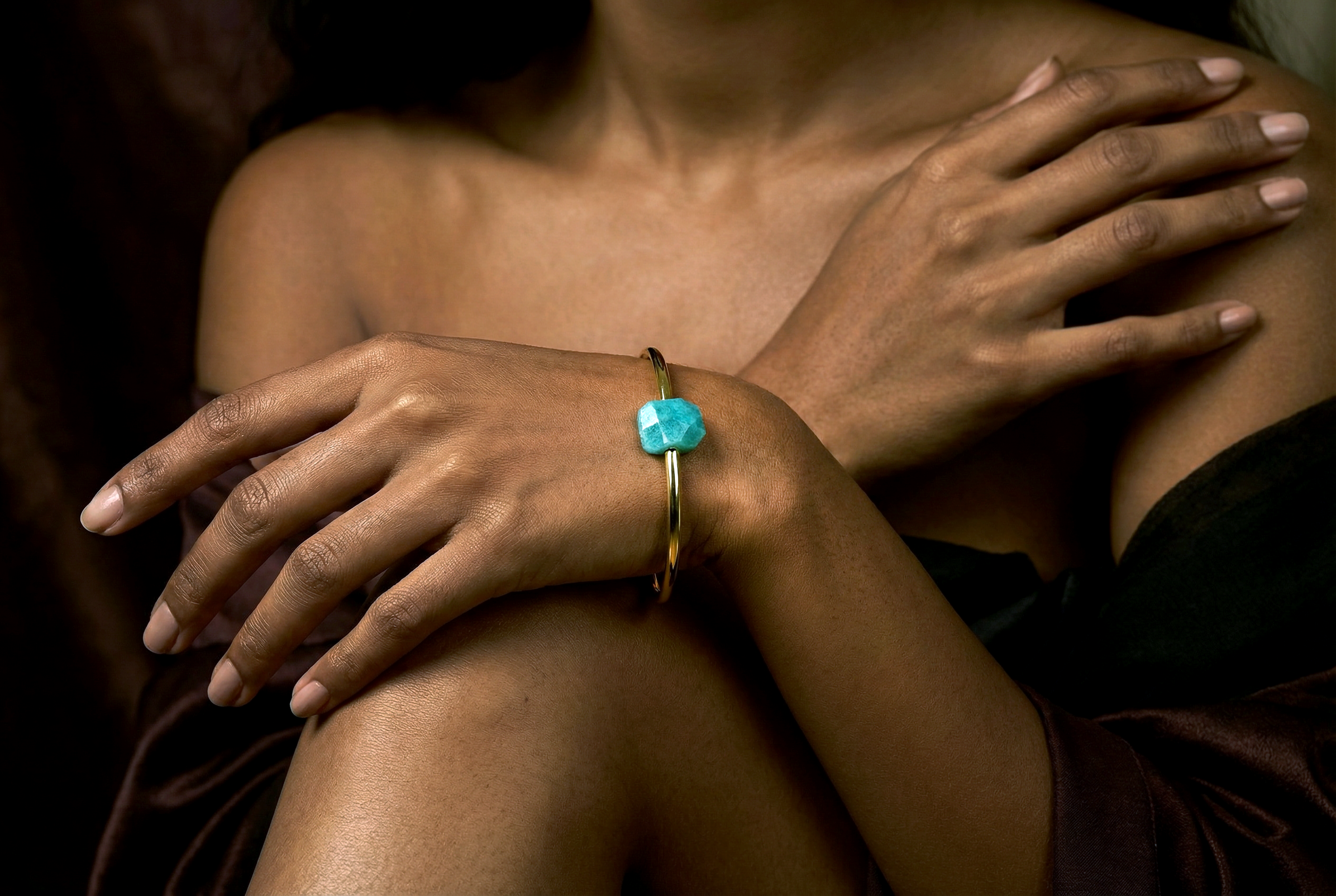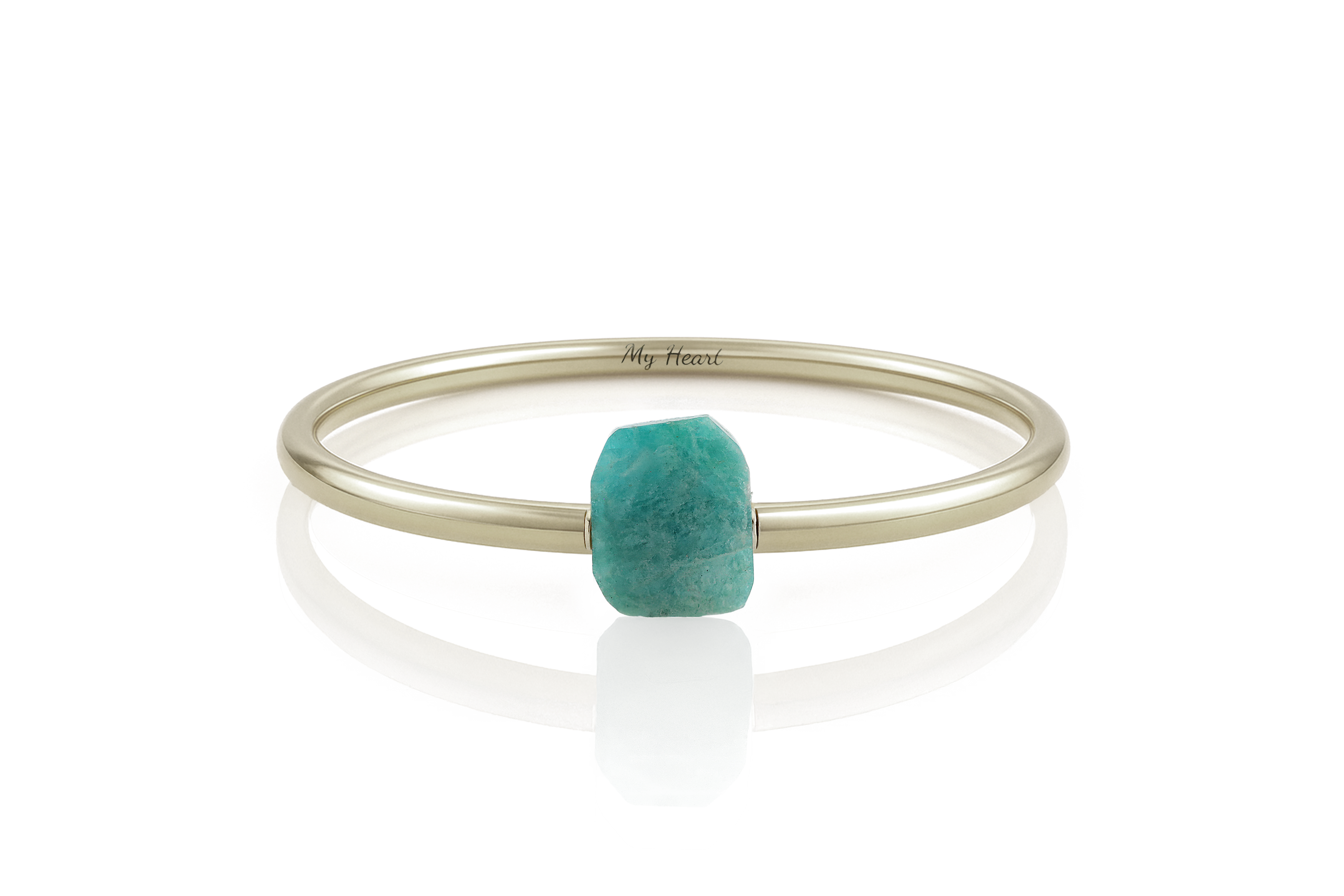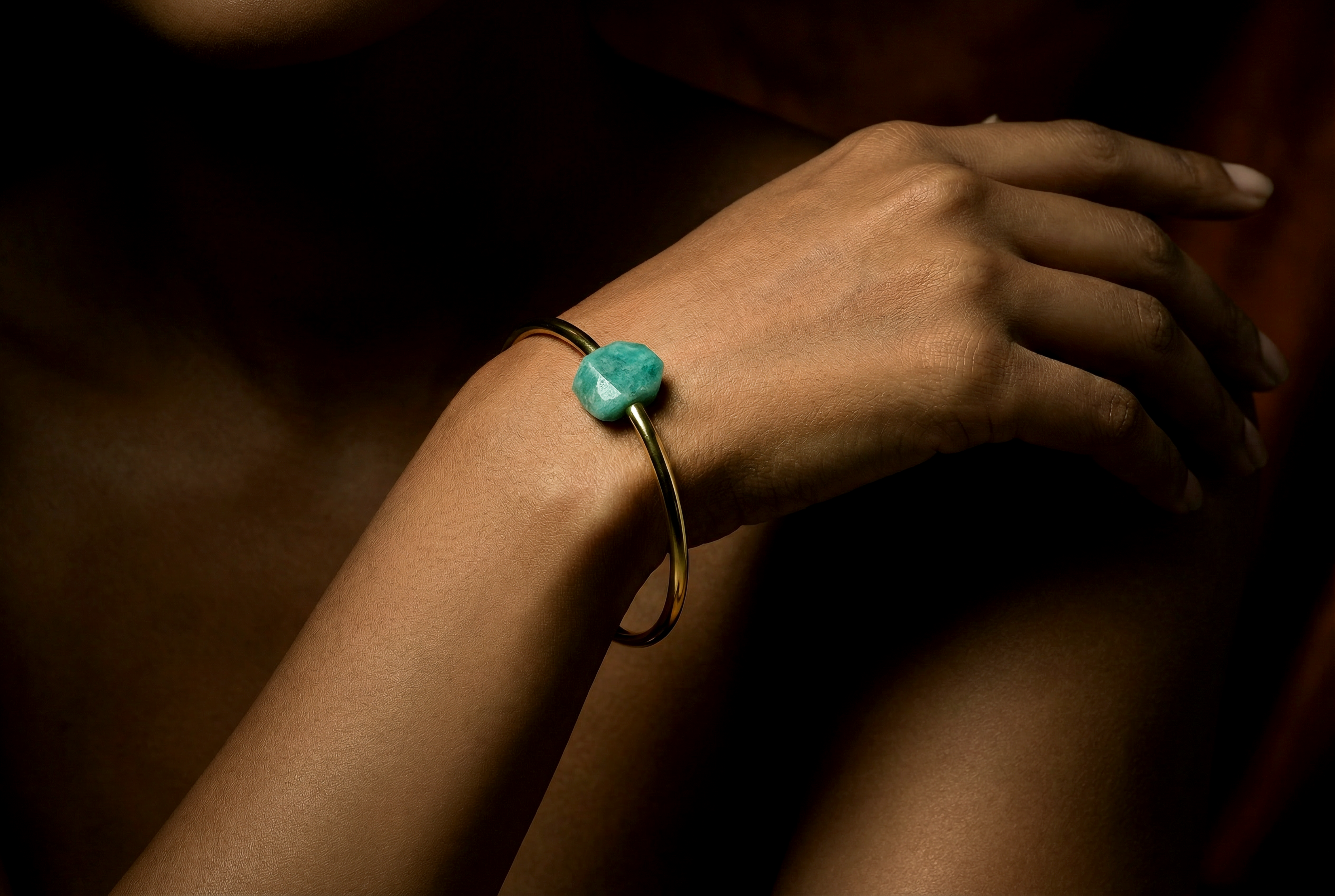 This elegant closed tube bangle bracelet features a striking 15x20mm asymmetrical faceted Amazonite stone at its center. Known for its calming green-blue hue, Amazonite brings a soothing and vibrant touch to your jewelry collection.