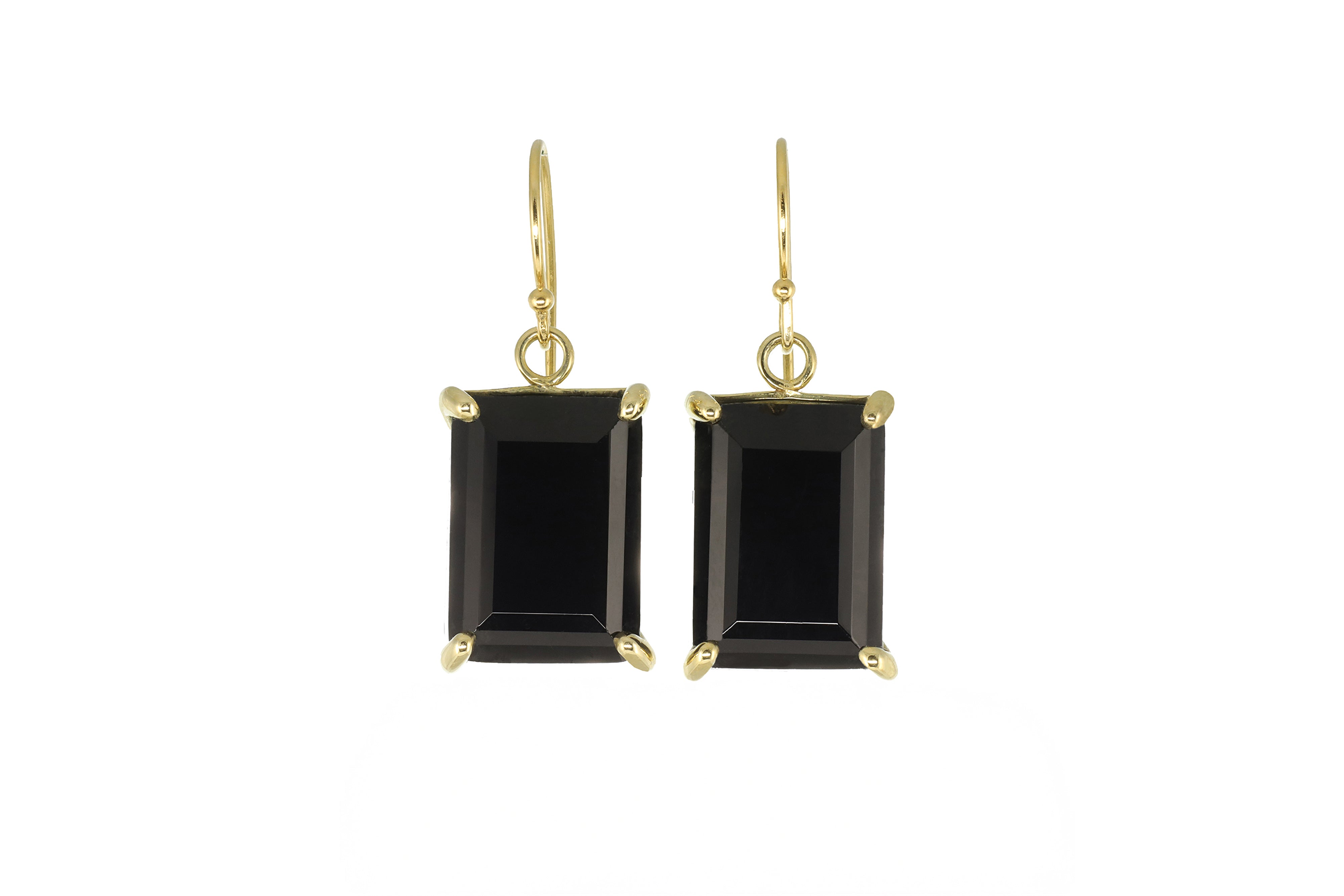 Make a bold statement with these black onyx earrings. Crafted in gold, these earrings feature a rectangle cut black onyx, offering a vintage charm with its 4-prong setting. The black onyx is known for its powerful energies, making these earrings not only a fashion statement but also a token of strength. Dangling beautifully, they will add a touch of refinement to any ensemble.