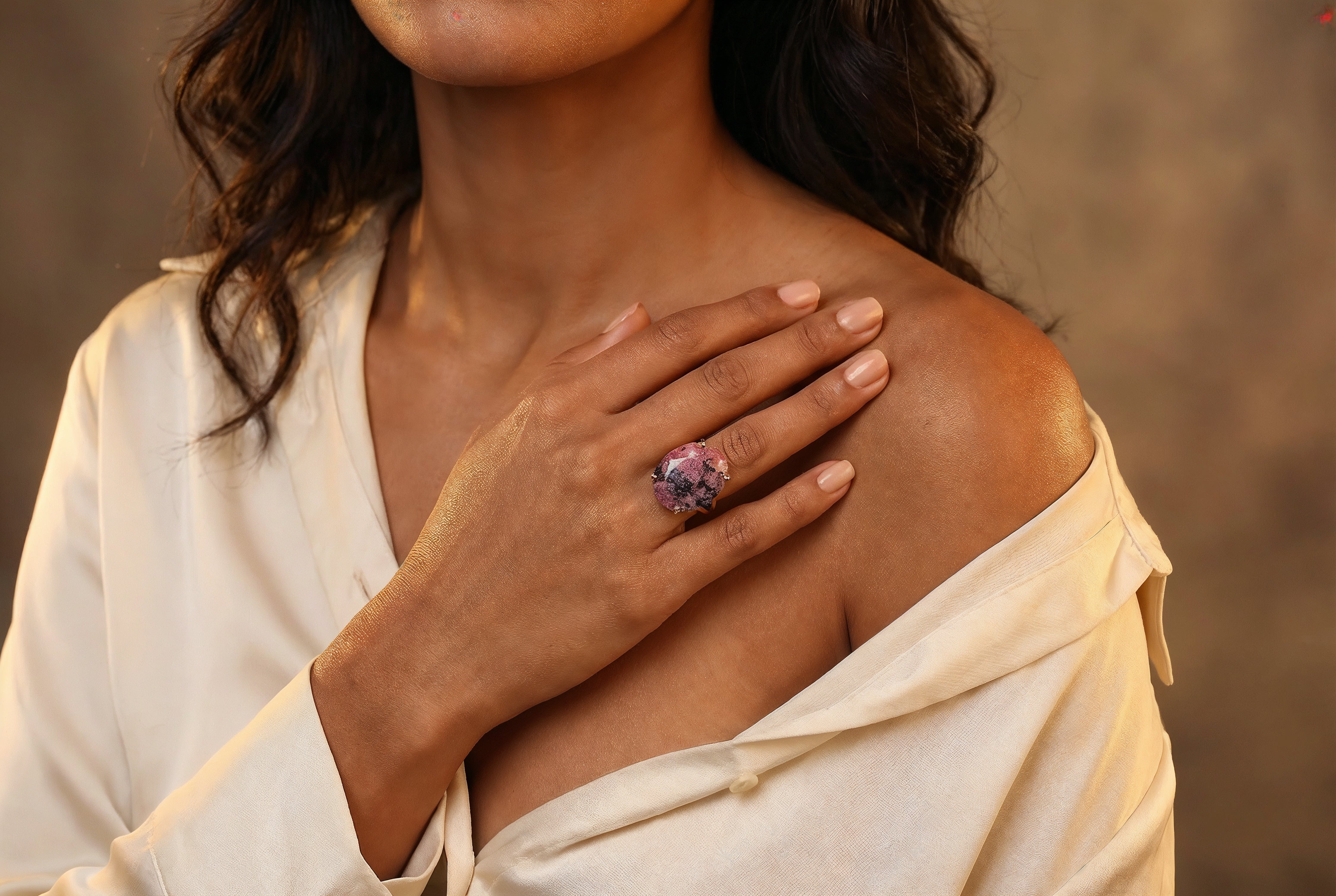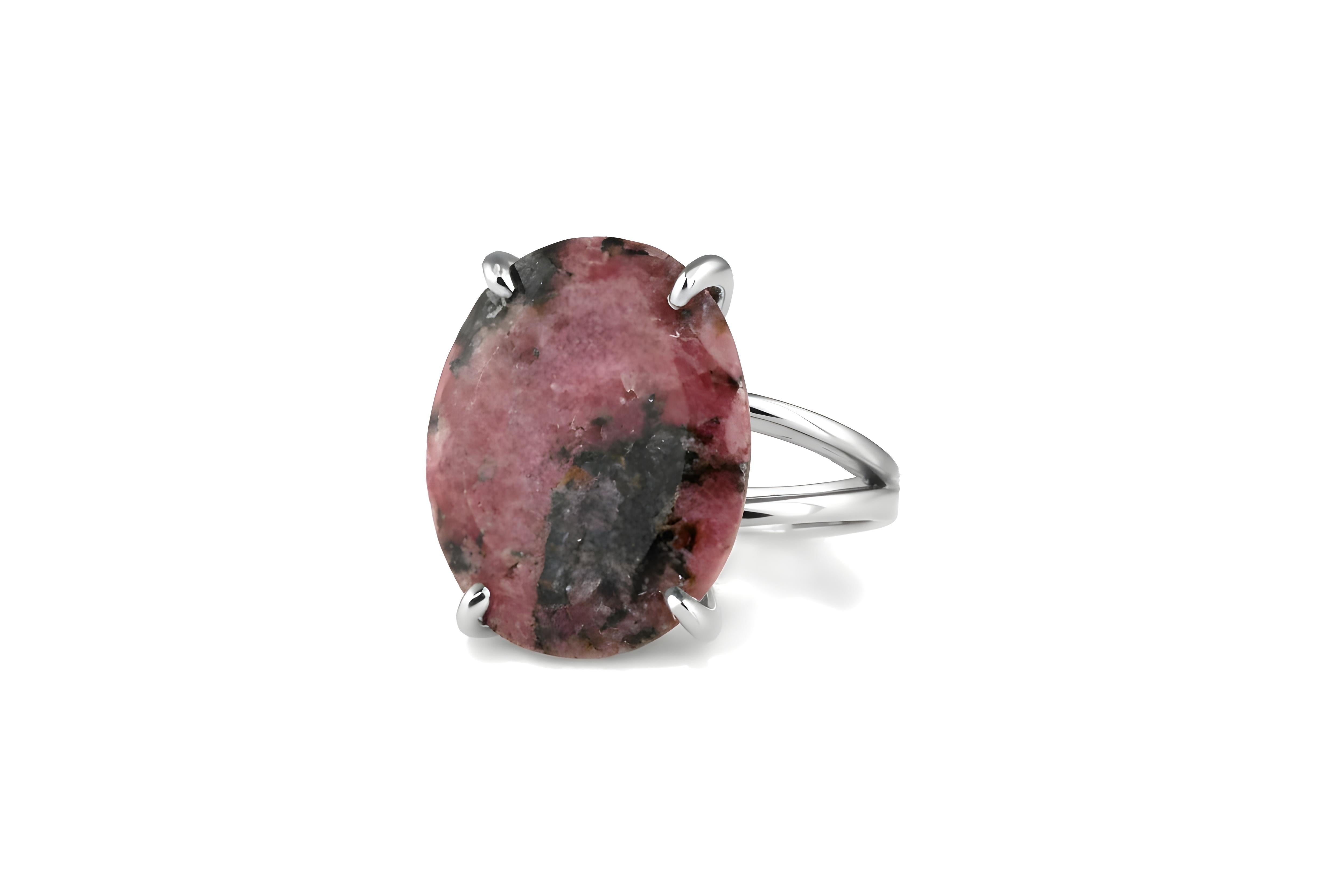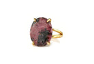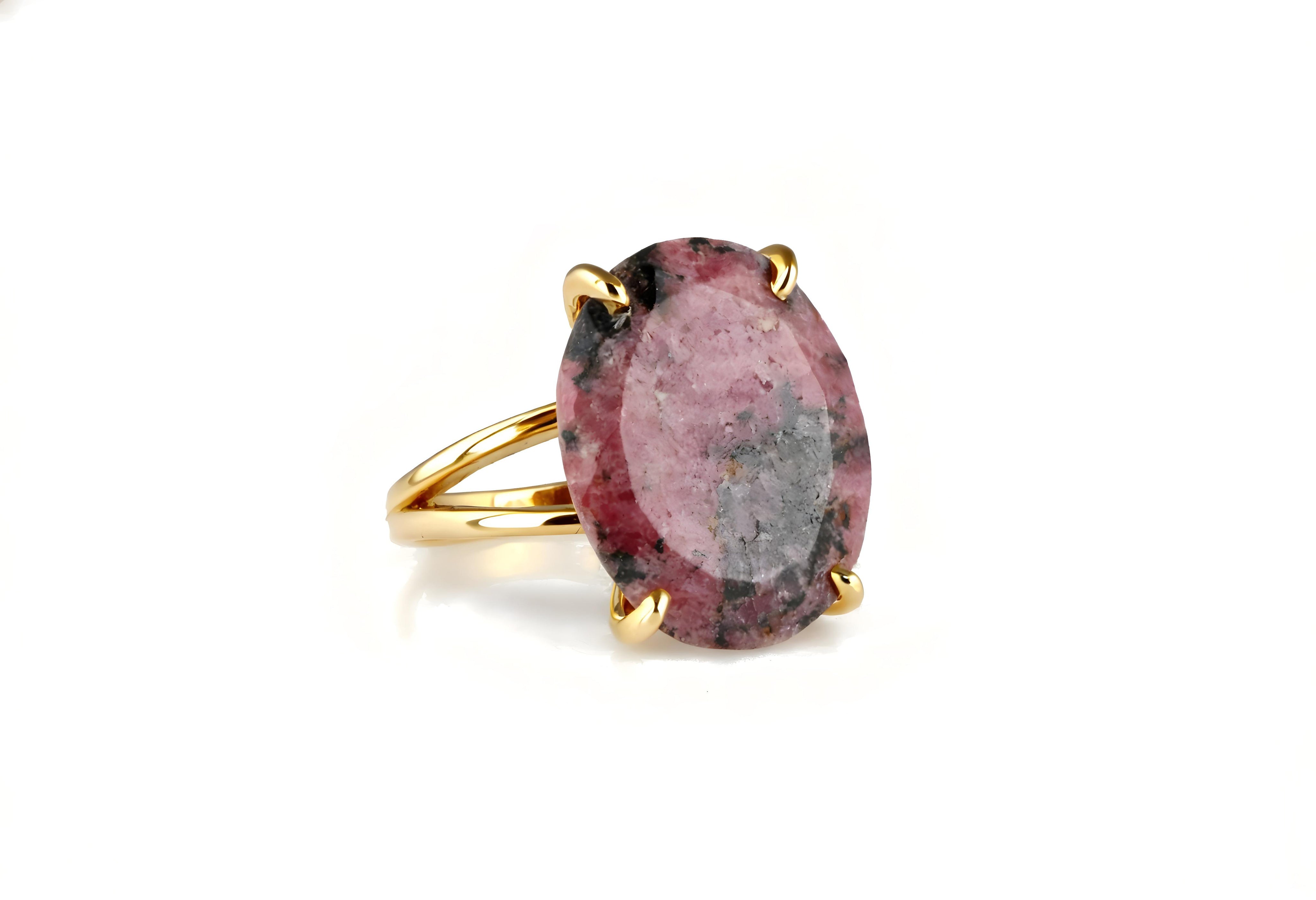 This gold oval Rhodonite ring brings a striking mix of deep pink and natural stone patterns, creating a bold and expressive look. The vibrant color and organic texture make it a standout piece for everyday style or special celebrations.