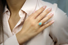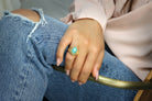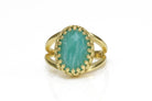 A gorgeous piece from Anemone’s collection of fine jewelry rings that boasts a lovely Blue Green Amazonite, with its marbled beauty set in 14k gold-filled ring band. This piece speaks spring and summer with its green gemstone, complimenting the yellow gold ring band. This piece makes a great 14k engagement ring, gift ring or even a boho ring you can have for yourself.
