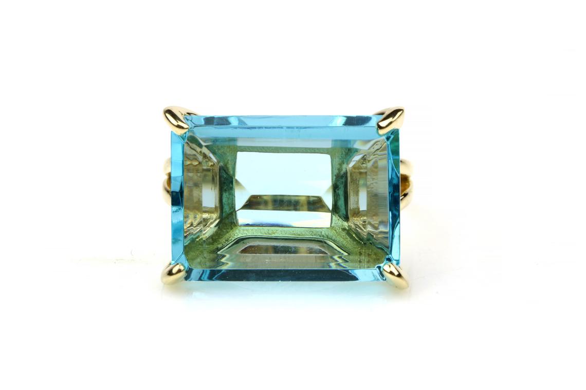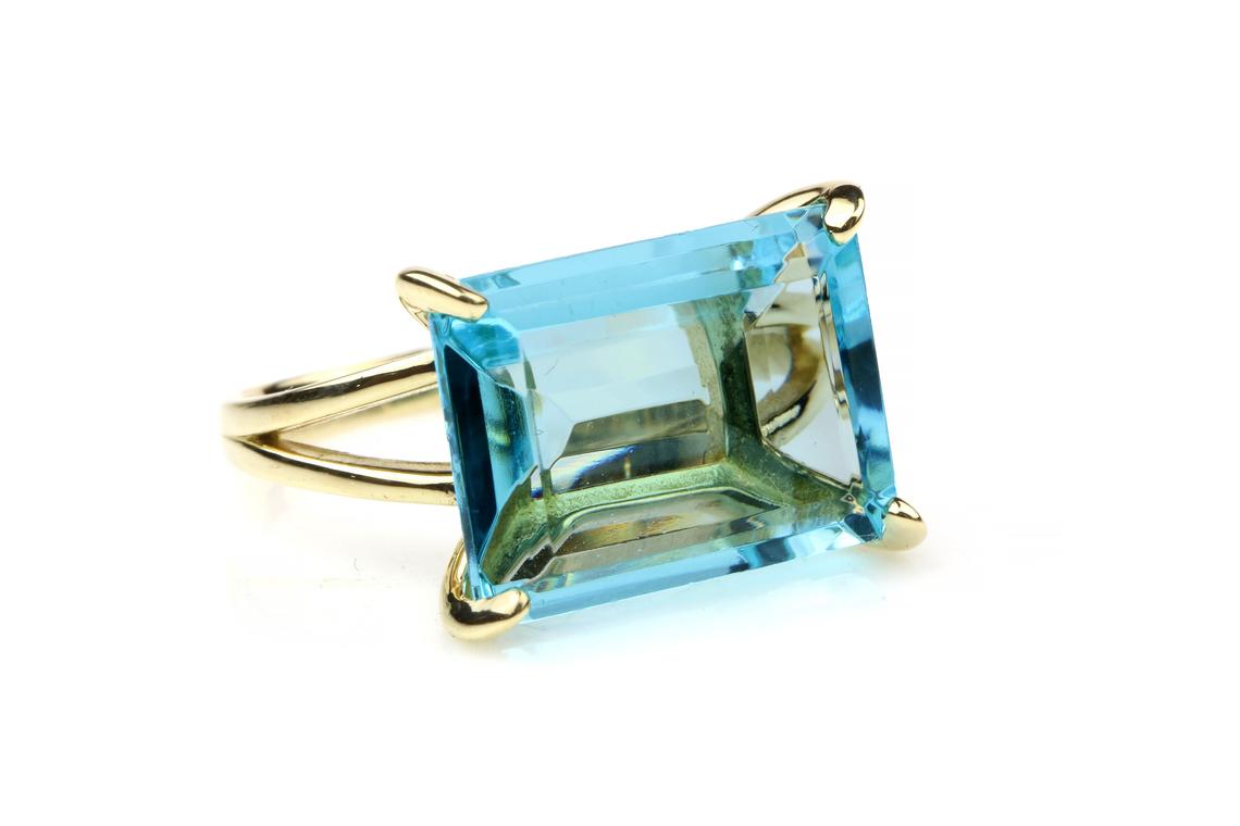 This 14k solid gold blue topaz ring features a wide rectangular gemstone with stunning clarity and brilliance. Its faceted cut reflects light beautifully, while the sleek gold band adds a touch of warmth and sophistication. Handcrafted with care, this November birthstone ring embodies timeless beauty and makes a striking addition to any jewelry collection.