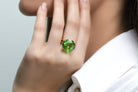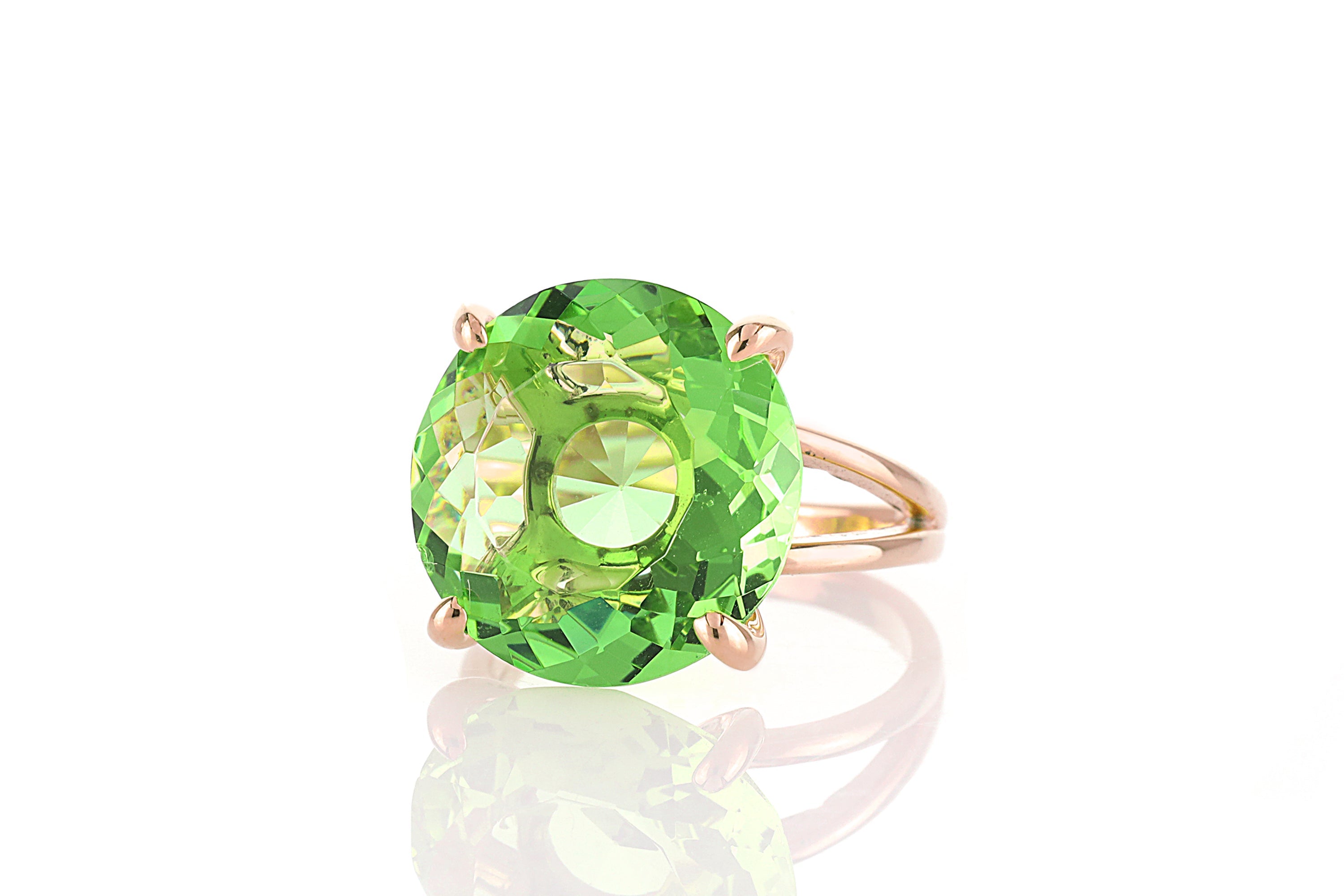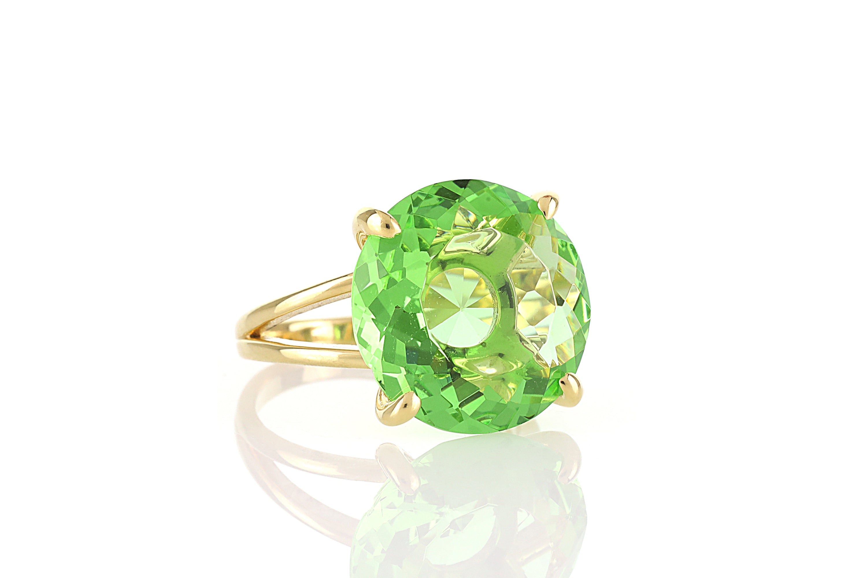 This Round Green Tourmaline Ring combines a classic gemstone with a contemporary split band design in 14k gold. Perfect for October birthdays, this bold cocktail ring features a stunning round-cut green tourmaline, making it a timeless statement piece or a thoughtful gift for her.