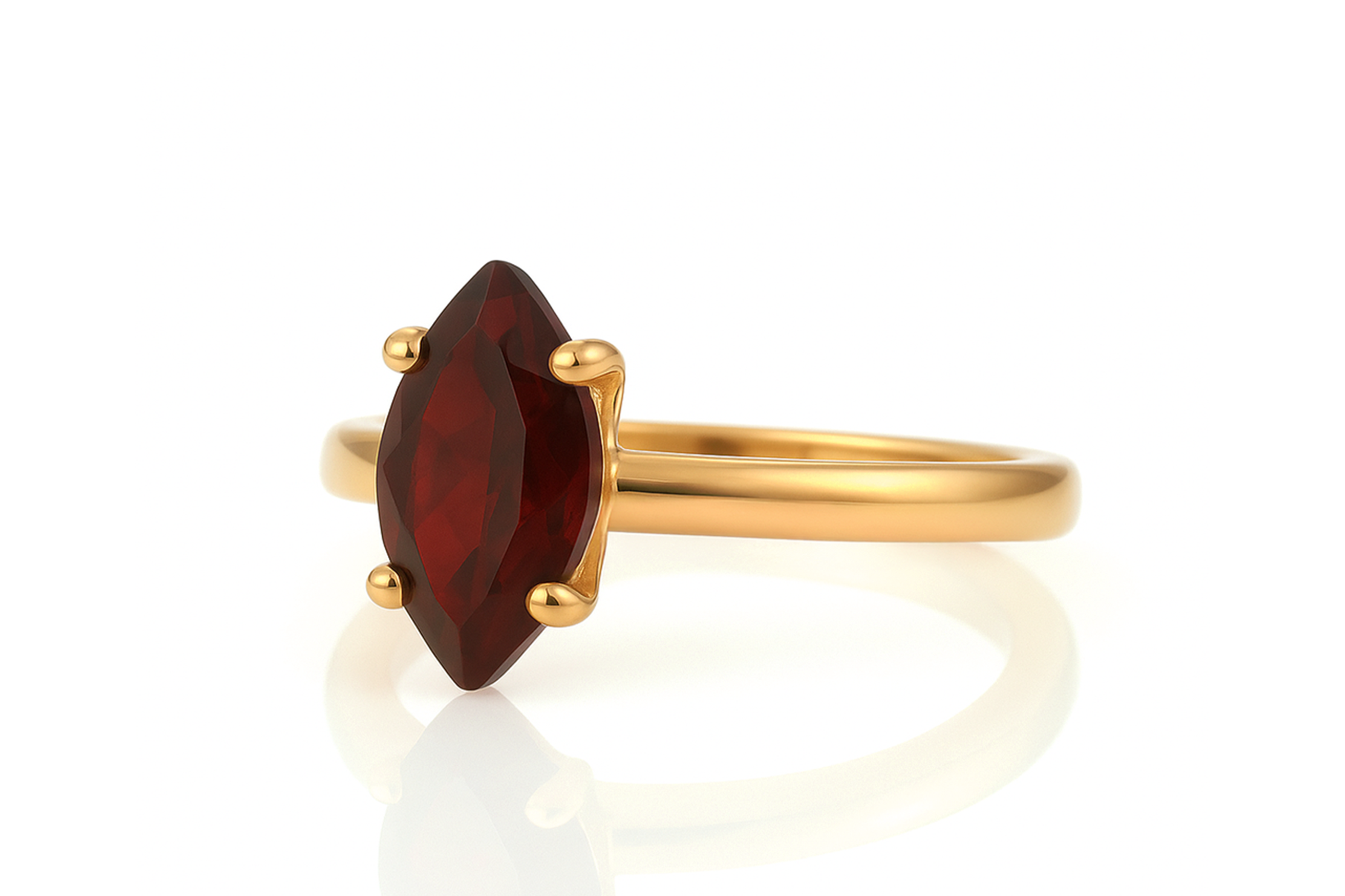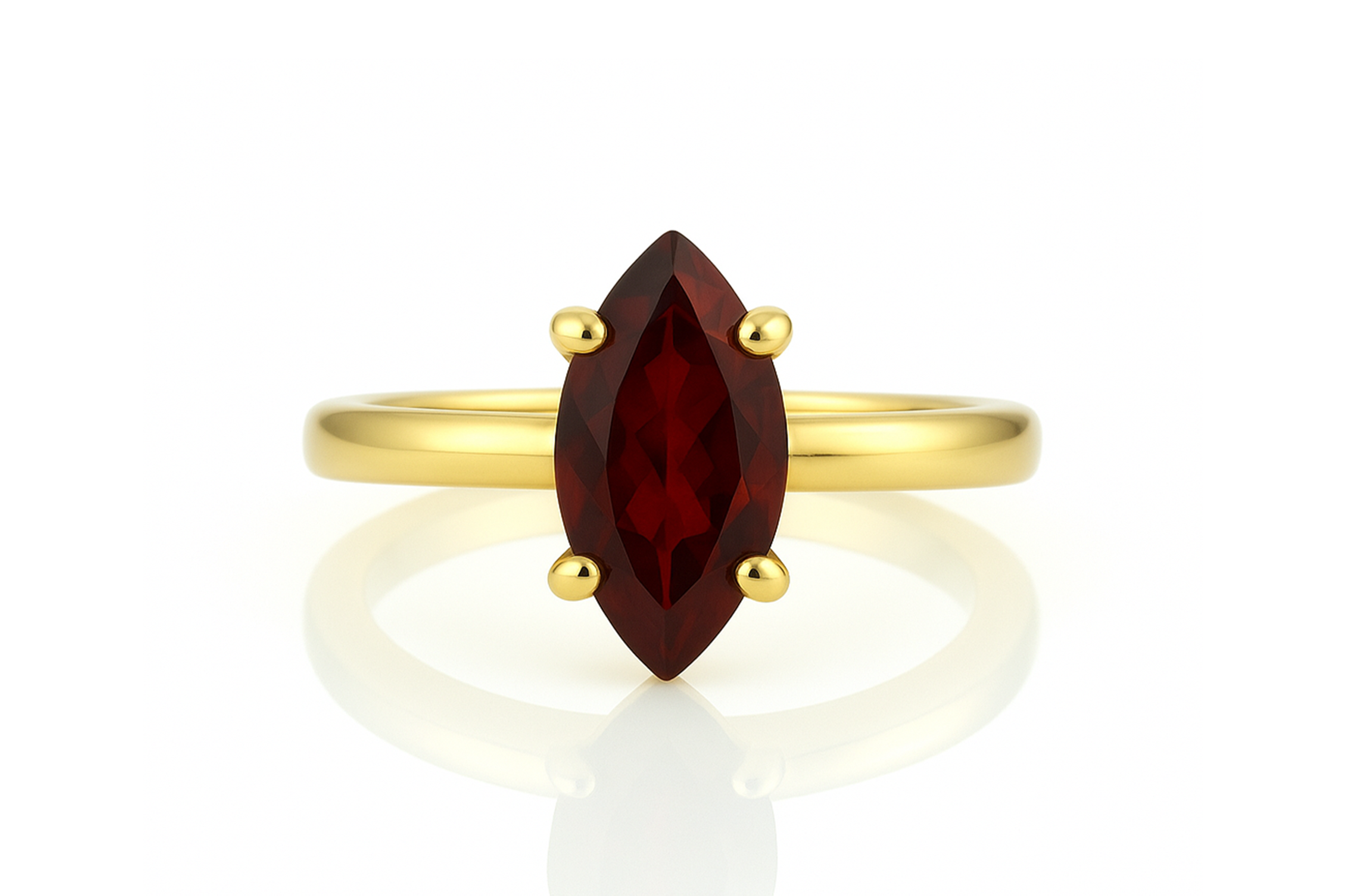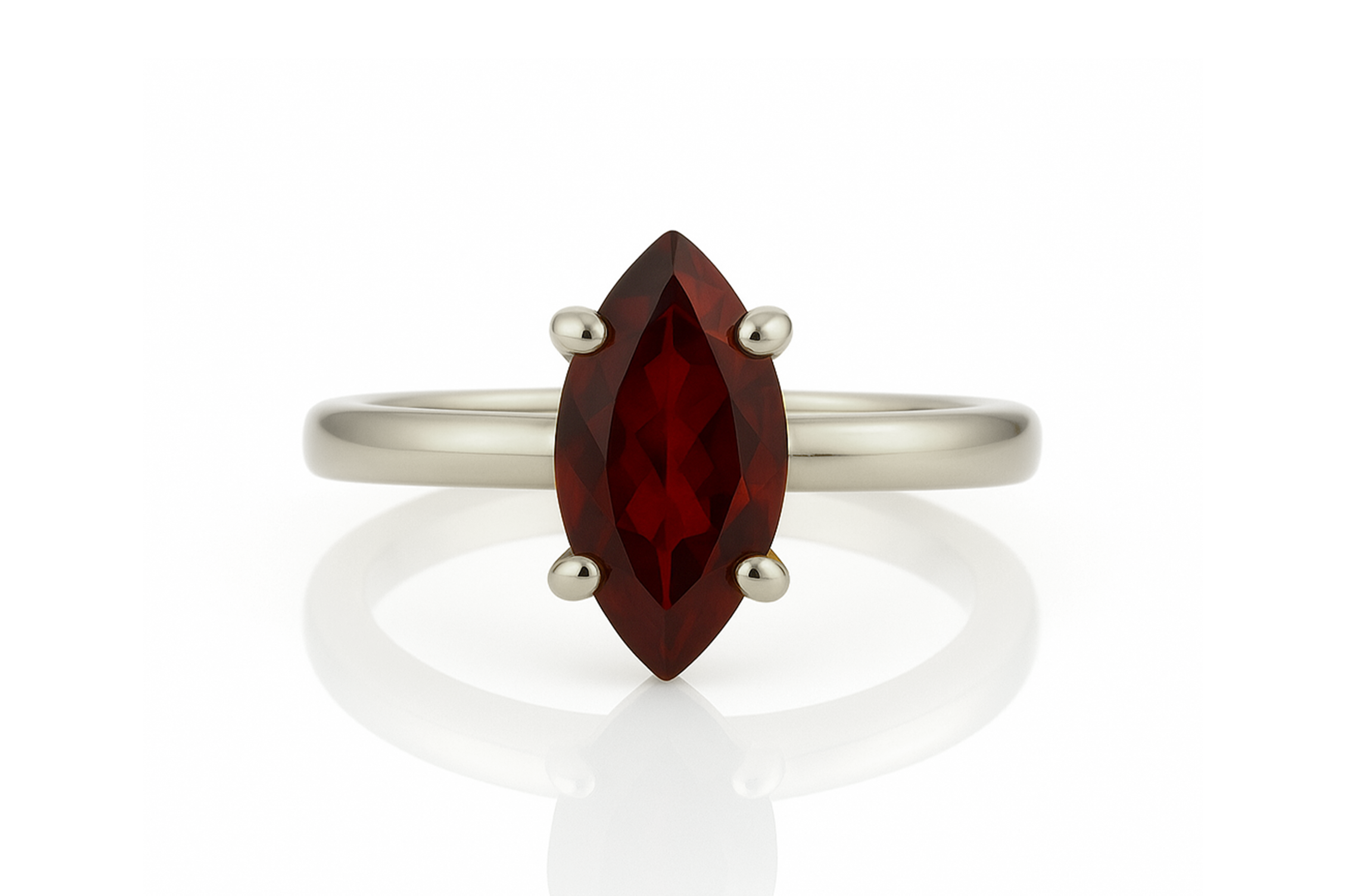 When it comes to jewelry, you can never go wrong with a classic marquise ring. This particular work of art features a Garnet stone with lovely facets and set in prongs. A charming choice for a birthday or anniversary gift.